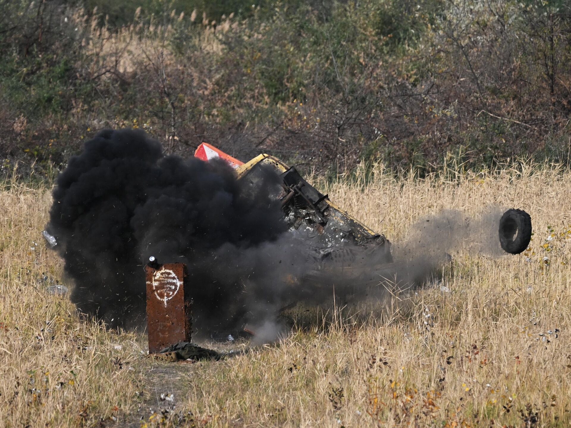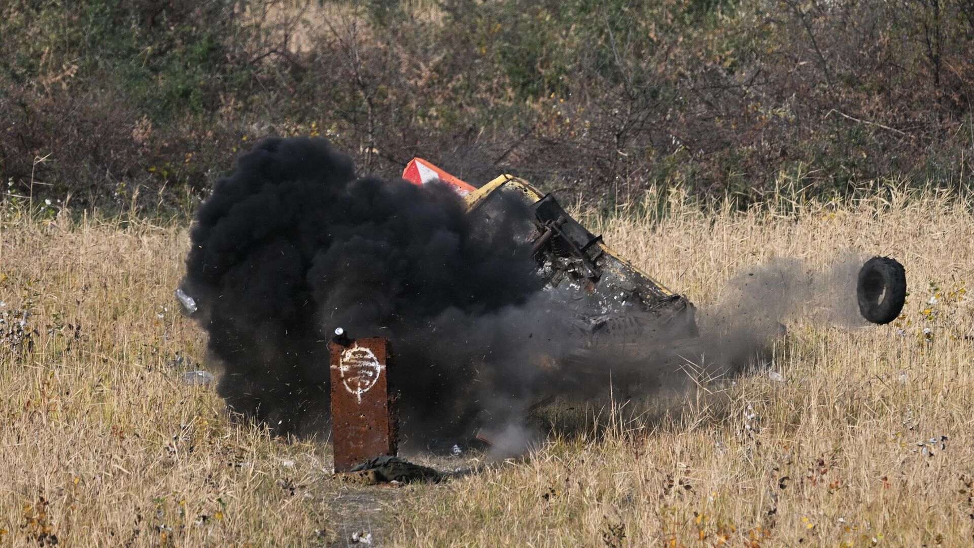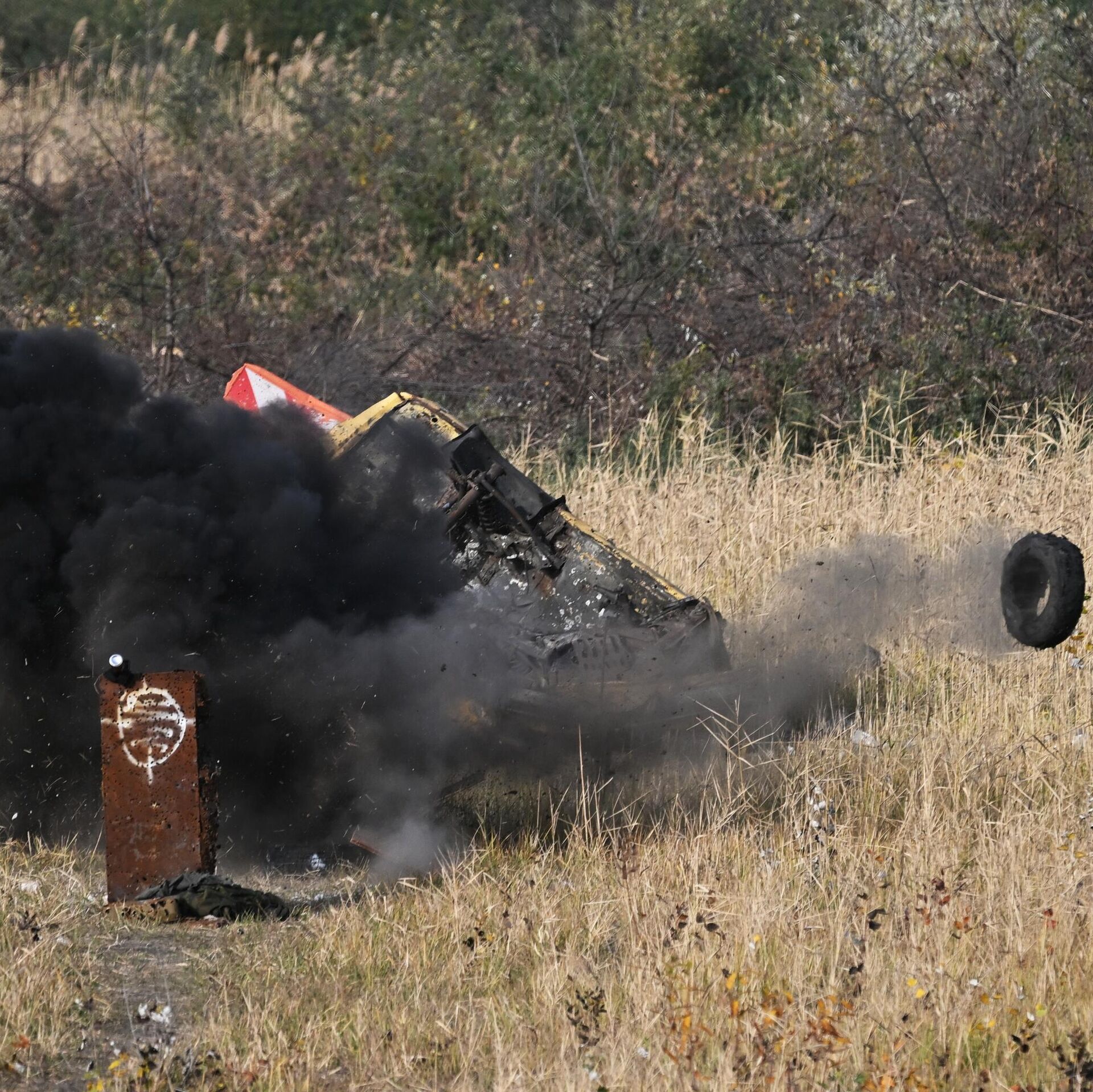 © Sputnik . Stanislav Krasilnikov / الانتقال إلى بنك الصورتفجير ذخيرة ألقيت من طائرة بدون طيار على مدرسة "أخمات" للاستطلاع الجوي، في منطقة العملية العسكرية الخاصة