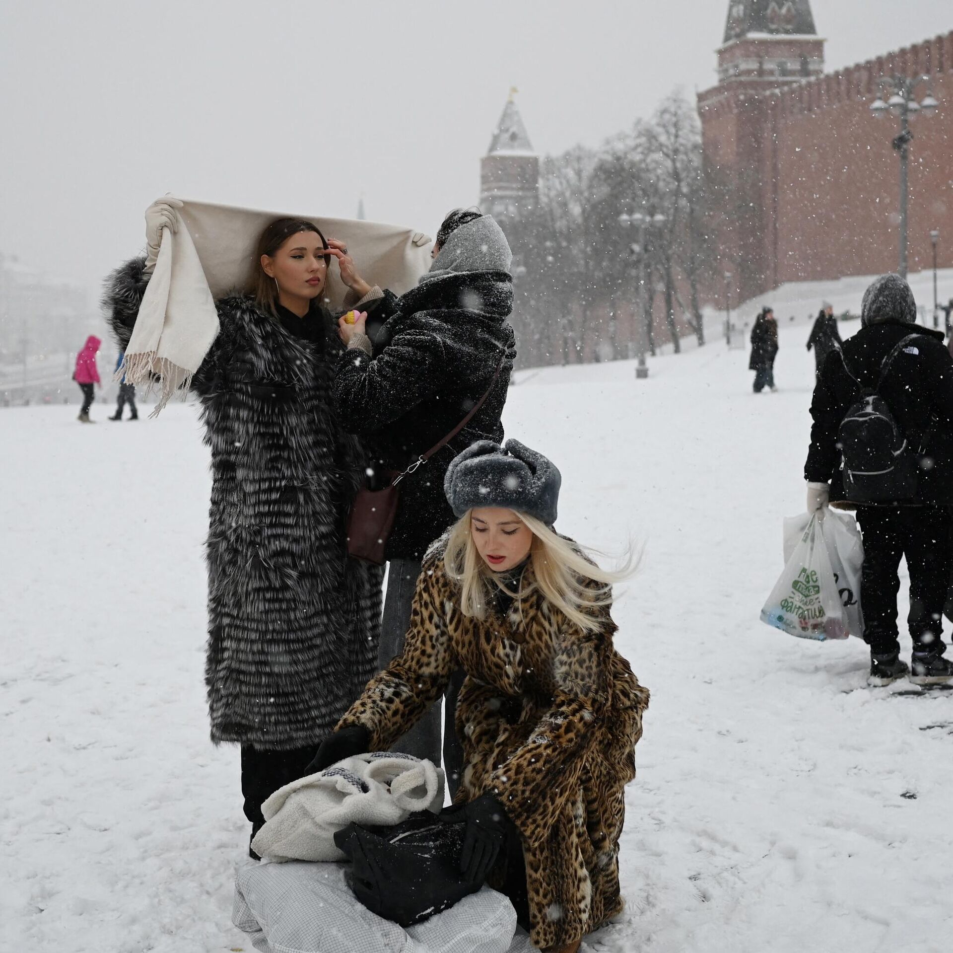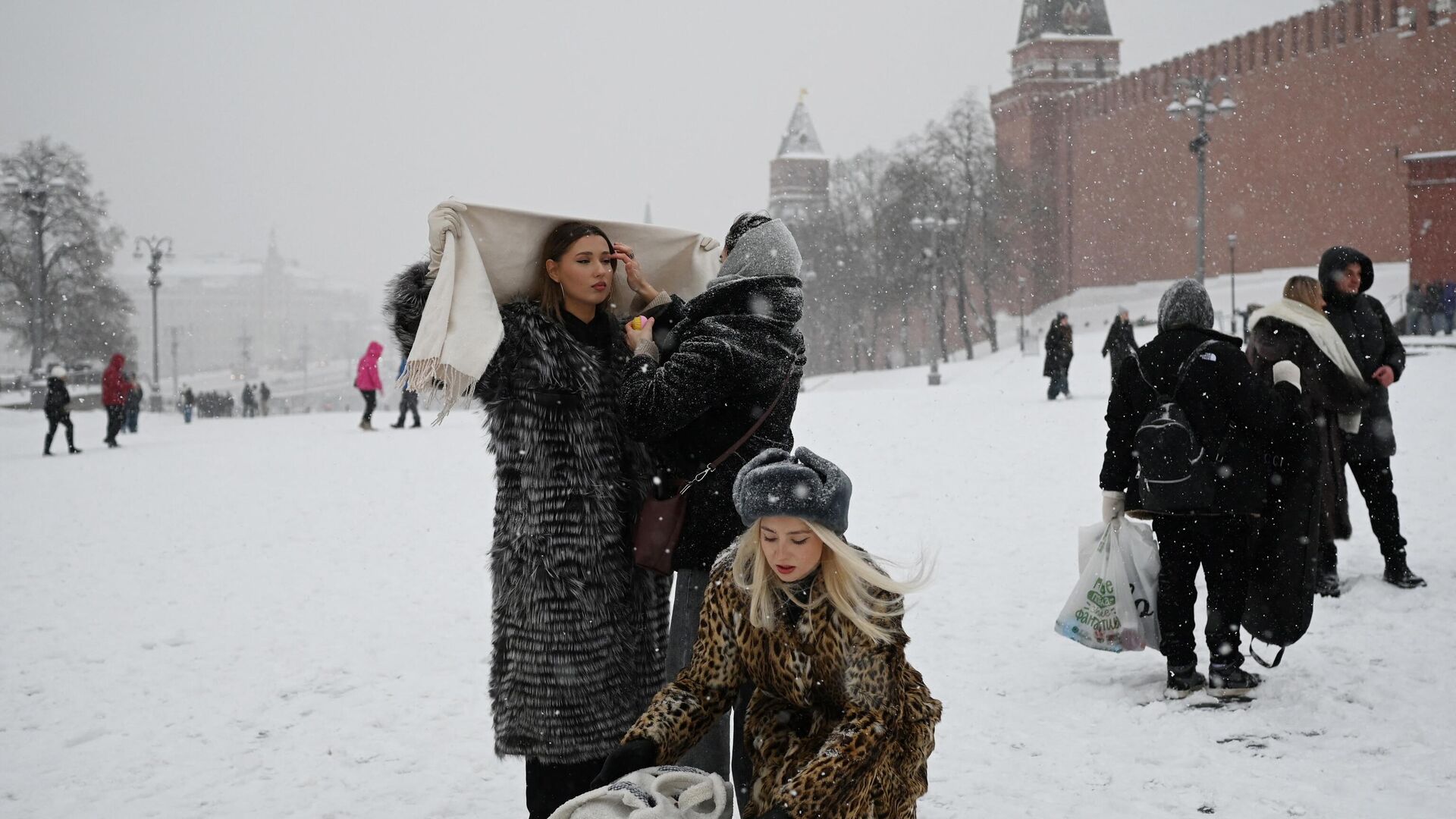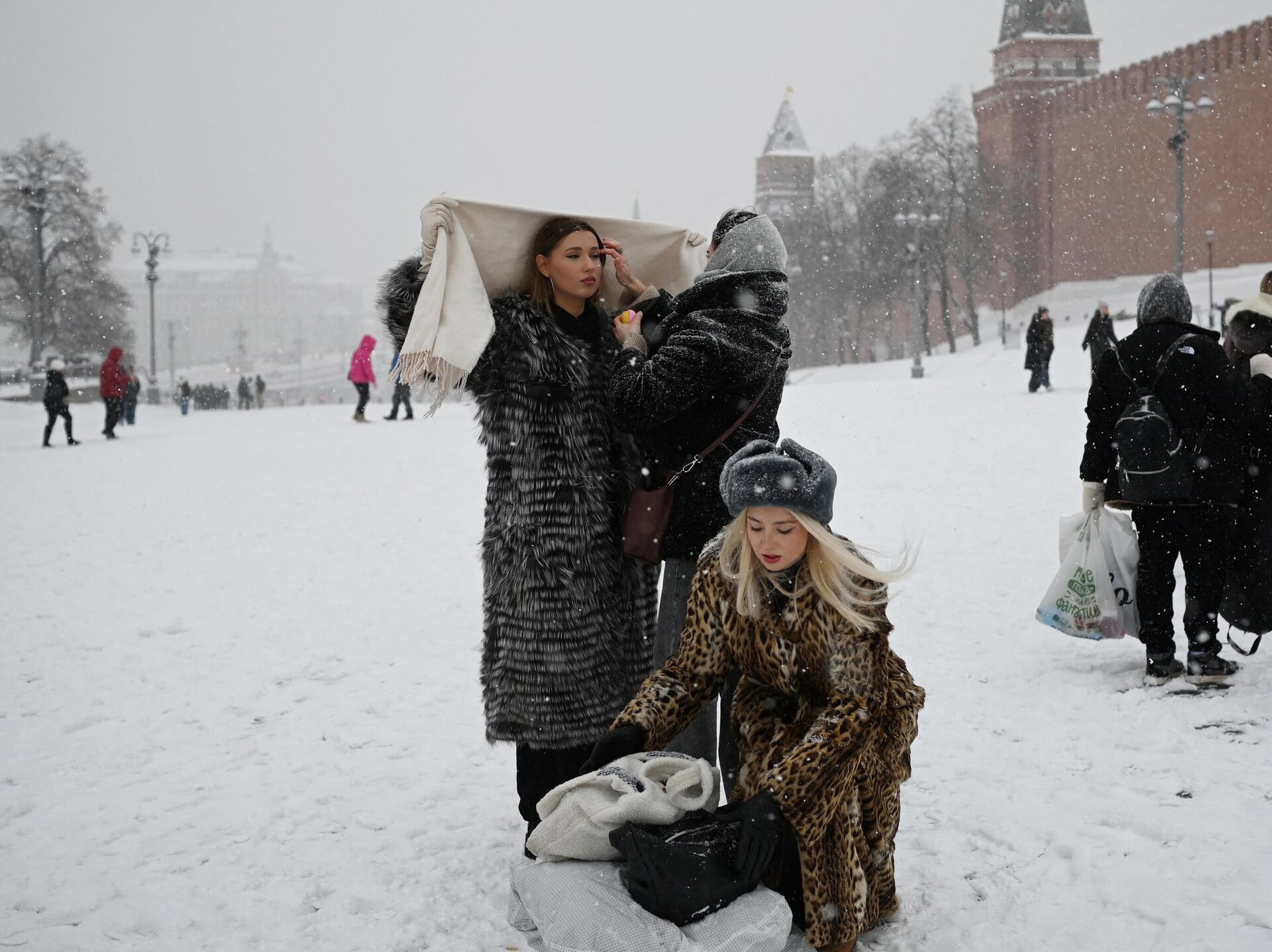 نساء يستعدن لالتقاط صورة في الساحة الحمراء المغطاة بالثلوج في موسكو، 3 ديسمبر 2023. - سبوتنيك عربي