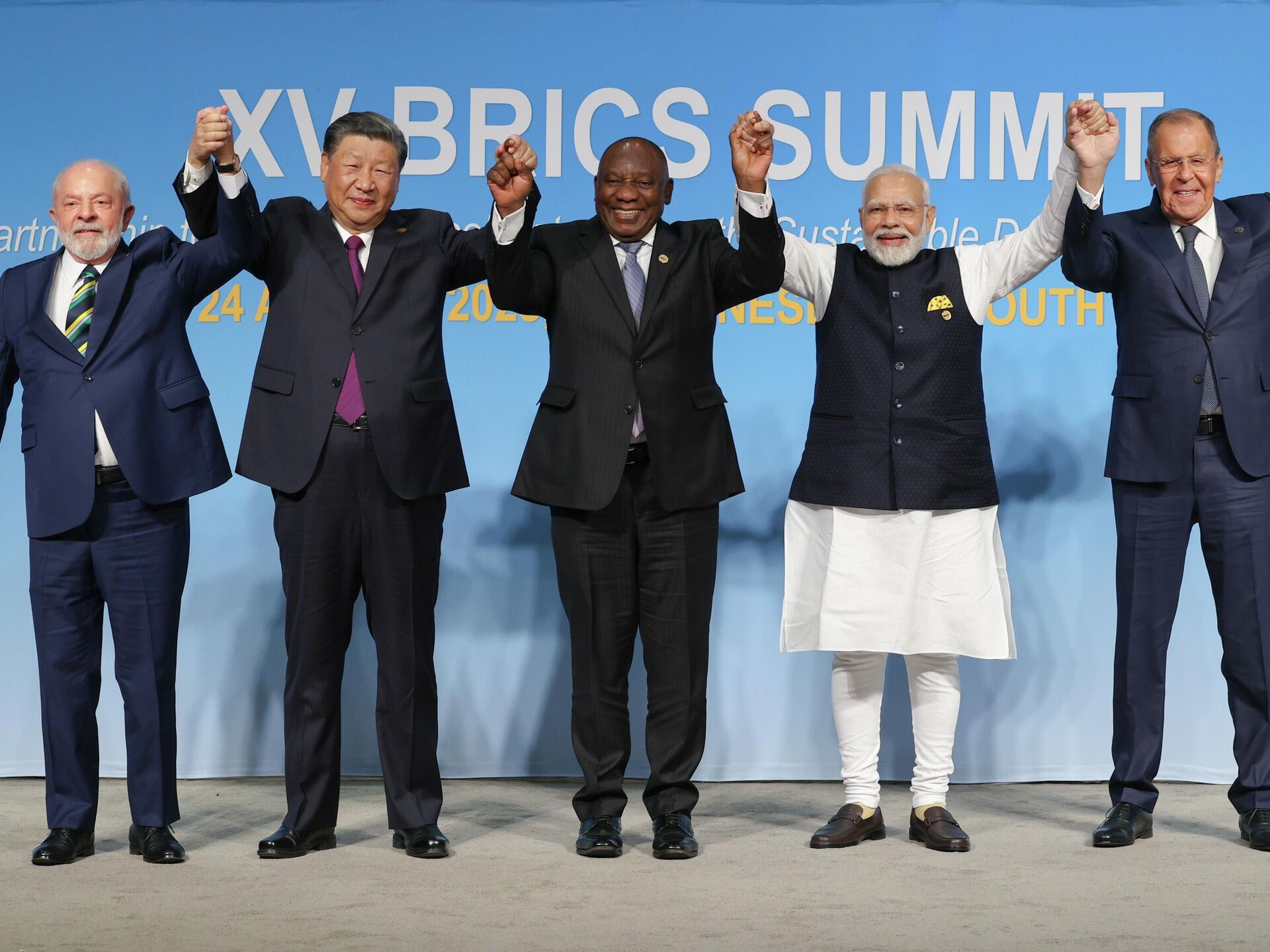 من اليسار إلى اليمين: الرئيس البرازيلي لولا دا سيلفا، والرئيس الصيني شي جين بينغ، ورئيس جنوب أفريقيا سيريل رامافوزا، ورئيس الوزراء الهندي ناريندرا مودي، ووزير الخارجية الروسي سيرغي لافروف في حفل التصوير الفوتوغرافي لرؤساء وفود الدول الأعضاء في مجموعة البريكس في جوهانسبرغ، 23 أغسطس/ آب 2023.