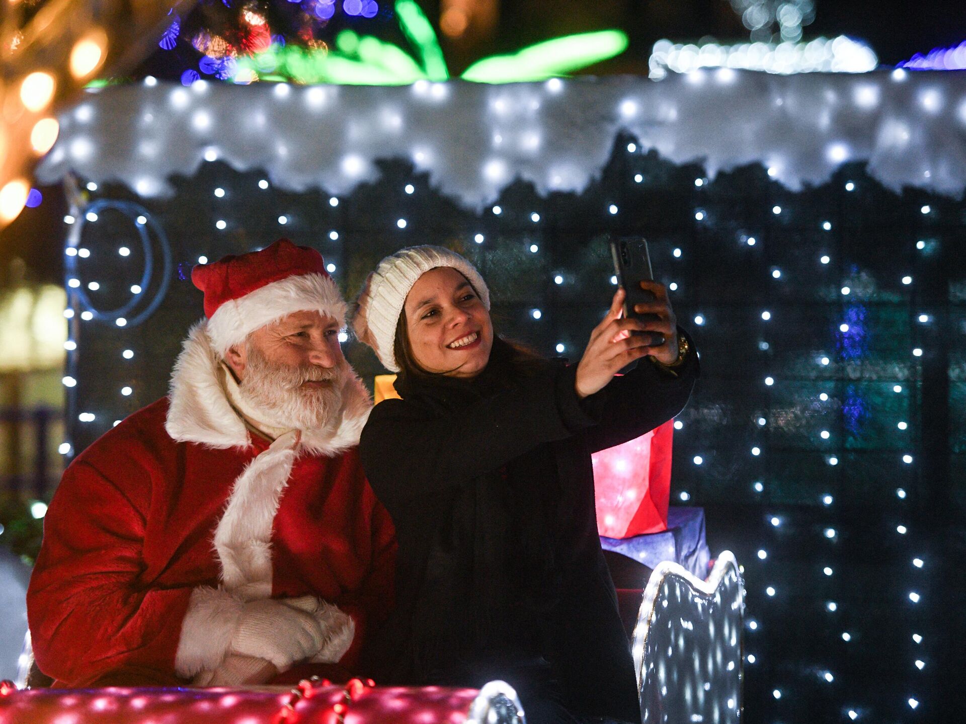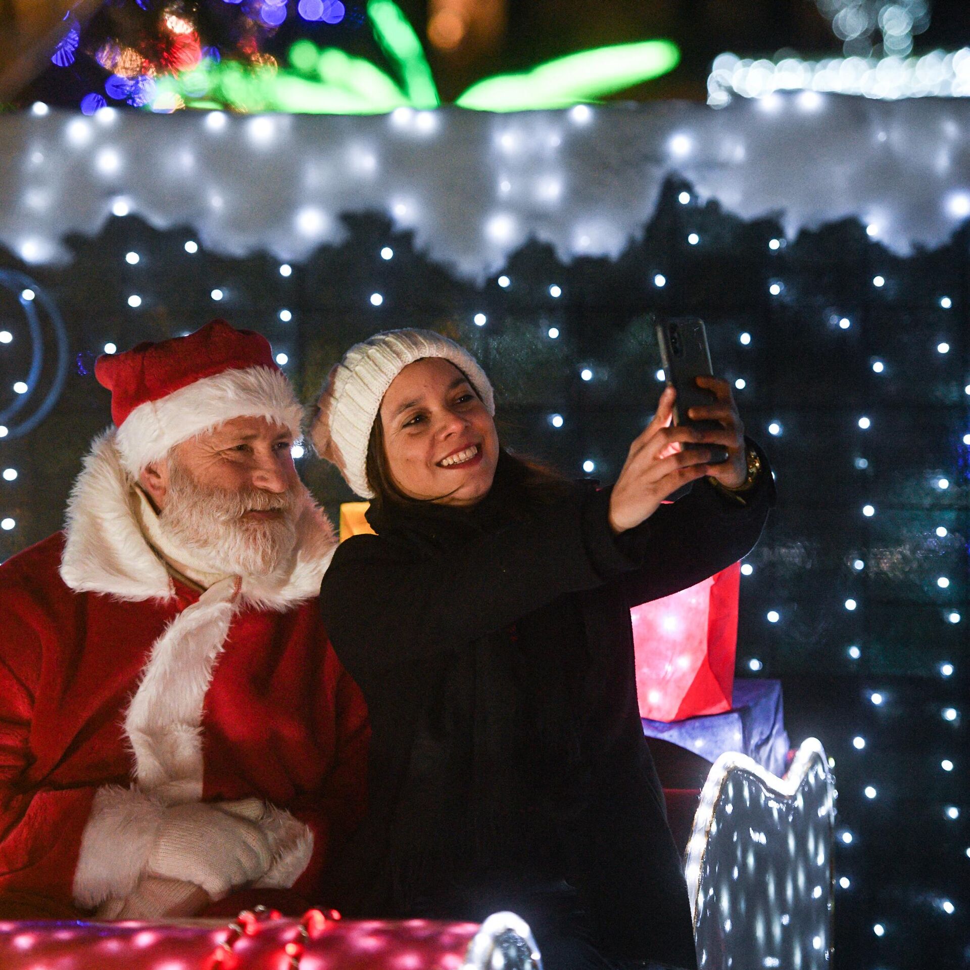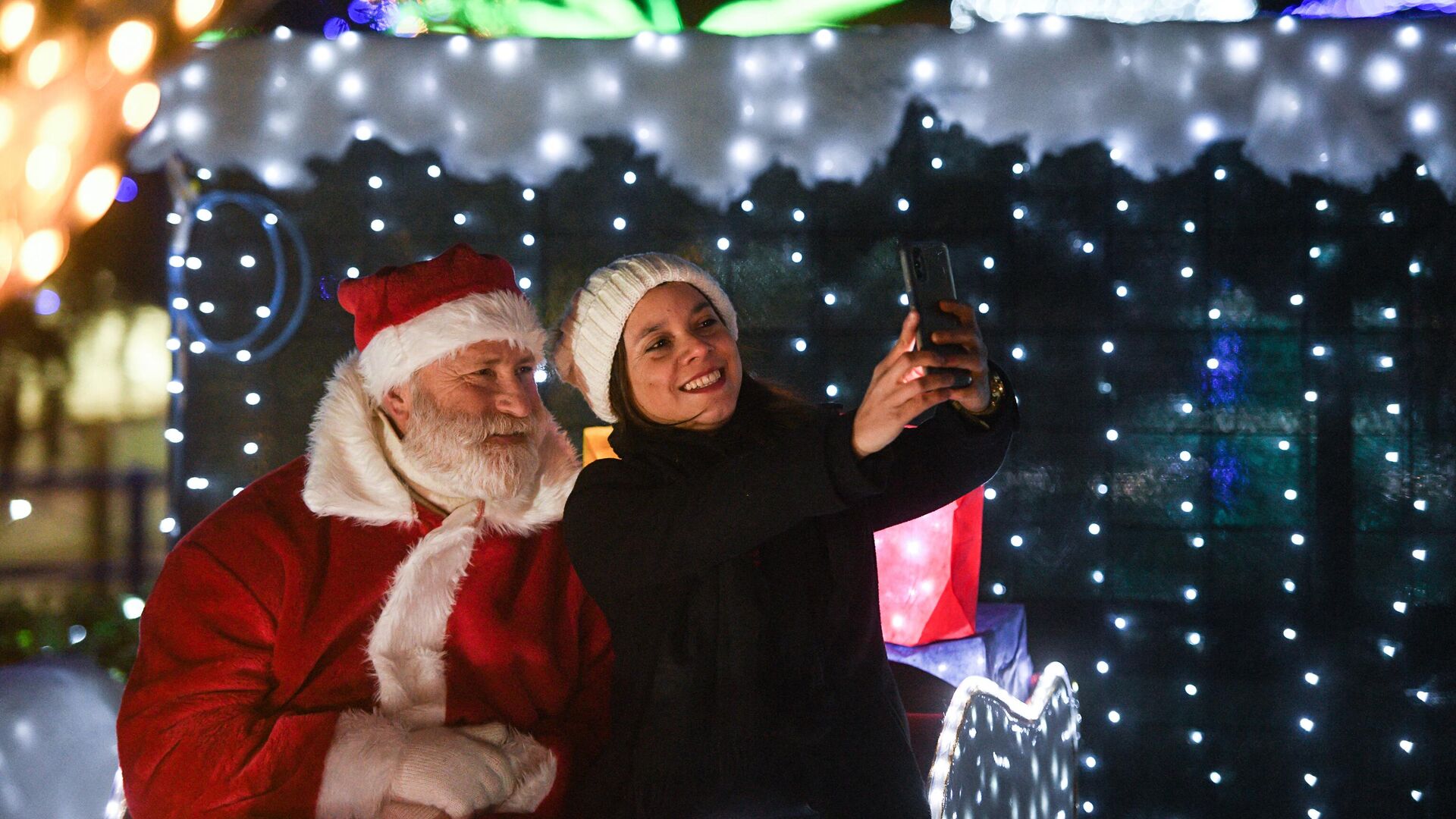 © AFP 2023 / Piero Cruciatti يلتقط زائر صورة سيلفي مع فنان يرتدي زي بابا نويل بين الزينة المضيئة بمناسبة الكريسماس في ليغيونو، على ضفاف بحيرة ماجوري، في 13 ديسمبر 2022.