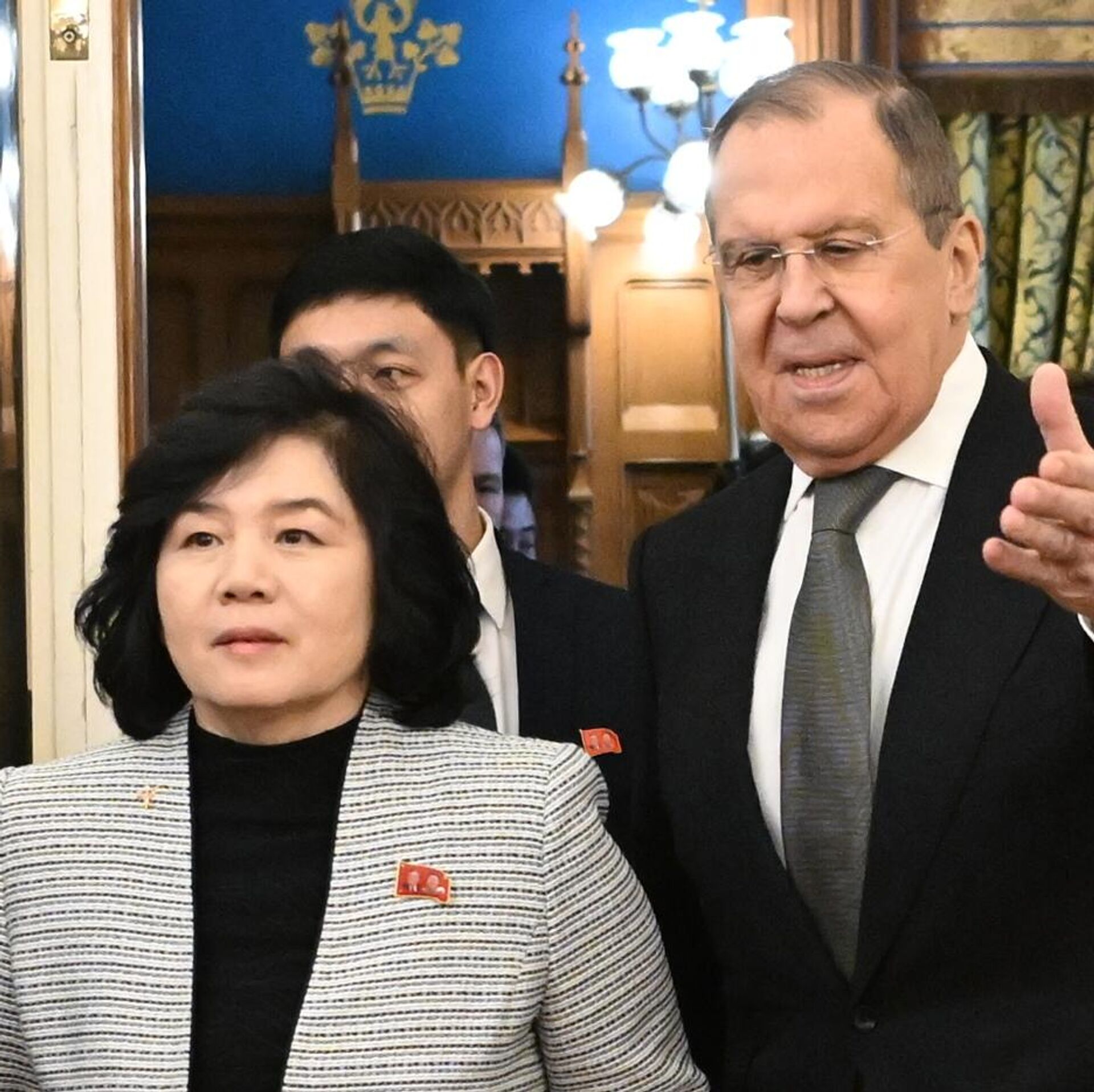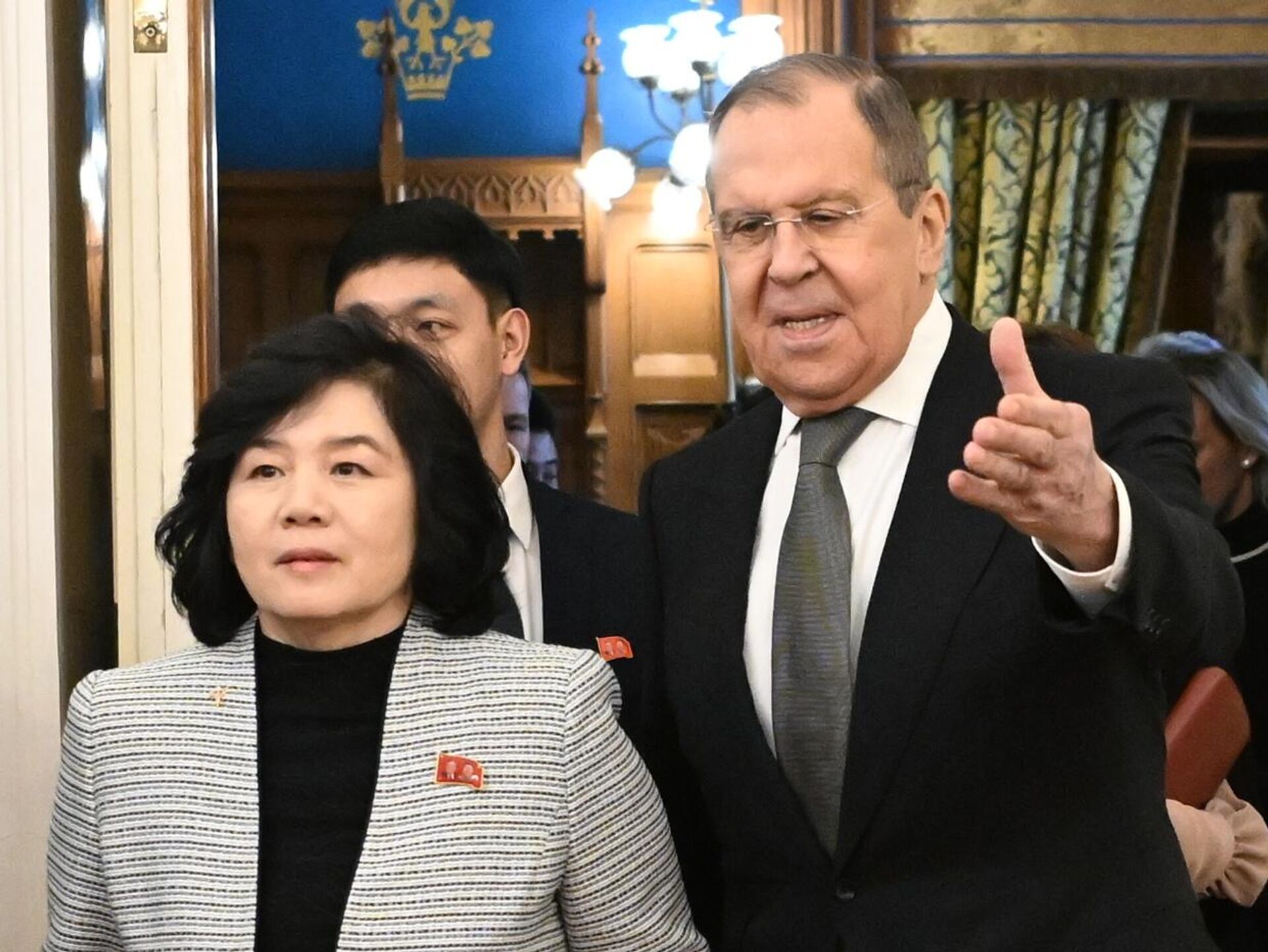 وزير الخارجية الروسي سيرغي لافروف خلال لقاء مع وزيرة خارجية كوريا الشمالية تشوي سونغ هوي في موسكو.