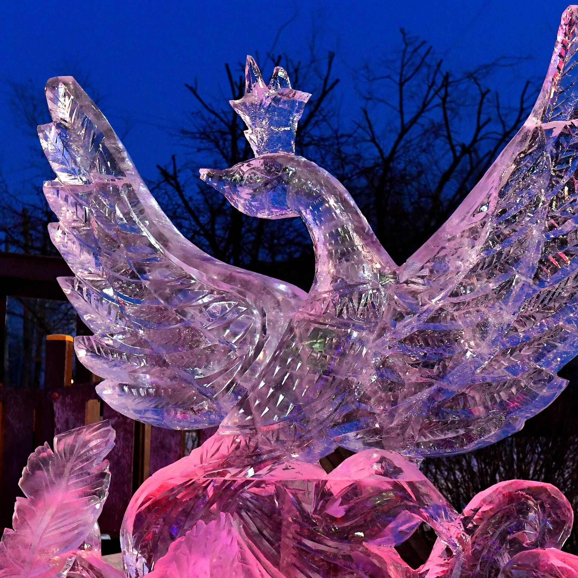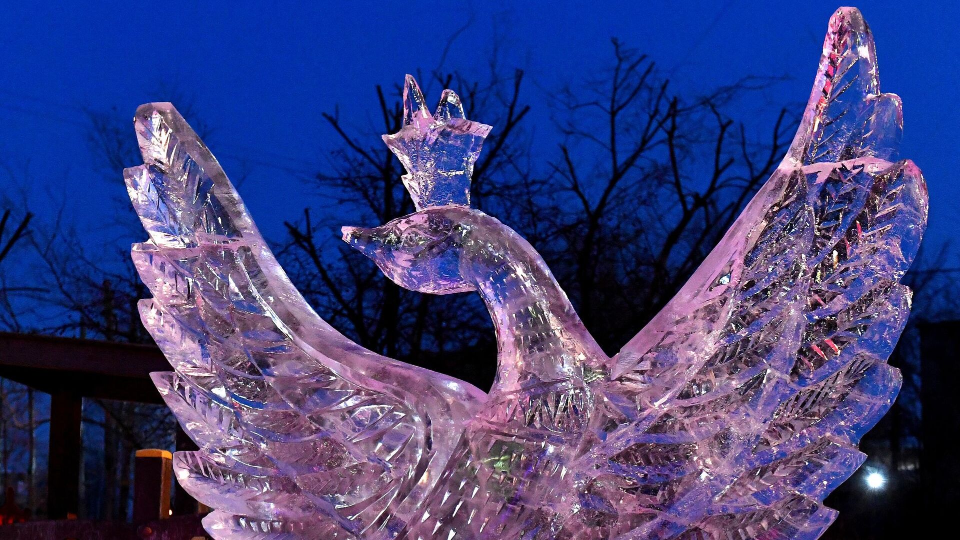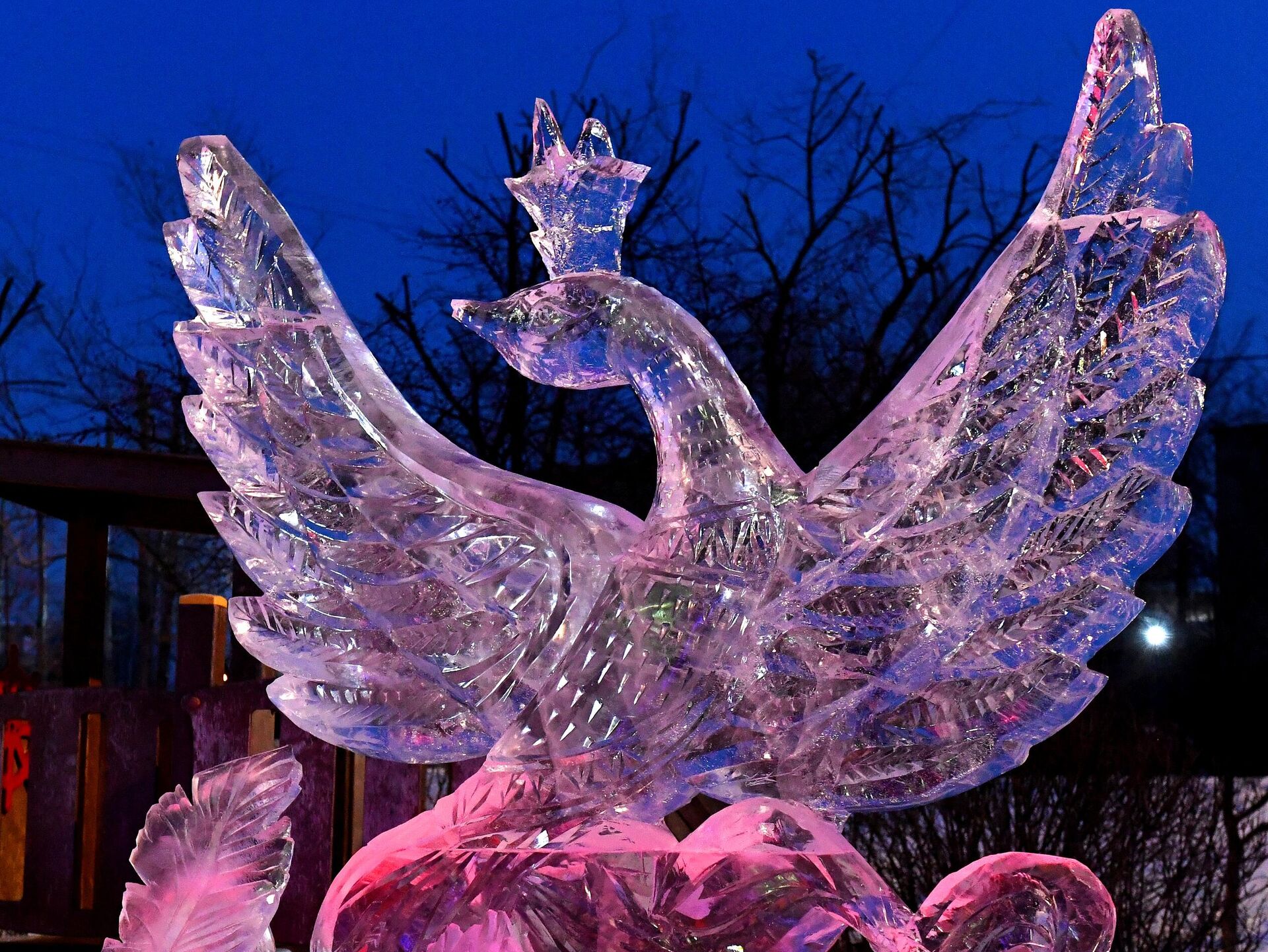 منحوتة من الجليد "الطائر الخيالي"، الذي أنشأه أحد المشاركين في مسابقة النحت الجليدي للشباب جليد سيبيريا الساحر" كجزء من مهرجان سوريكوف للفنون الشتوية الـ18، على جسر ياريغينسكي على ضفة نهر ينيسي في كراسنويارسك الروسية.