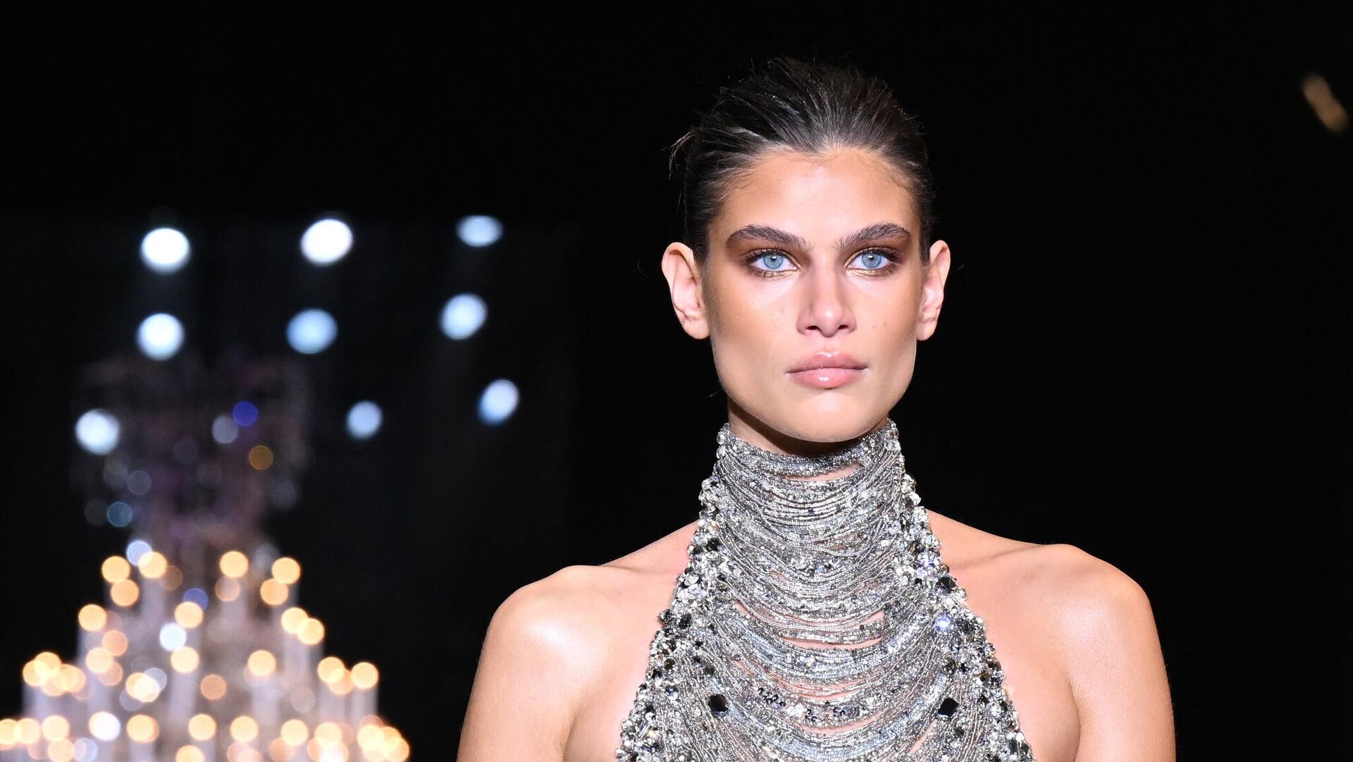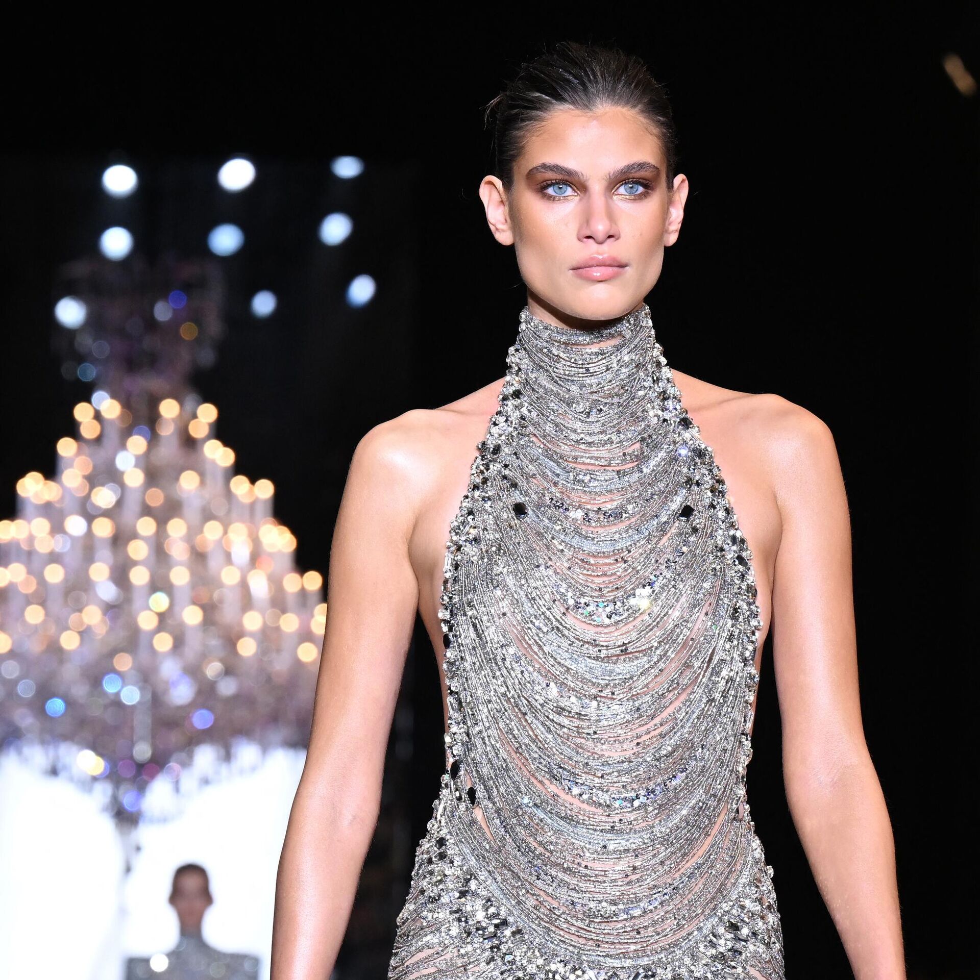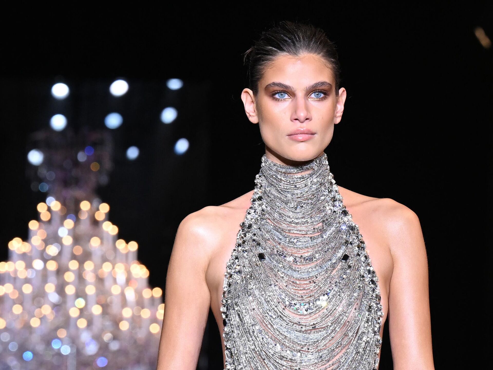عارضة أزياء تعرض أحد إبداعات المصمم اللبناني إيلي صعب، خلال "أسبوع الموضة النسائية لربيع وصيف 2024" في باريس، في 24 يناير 2024.
