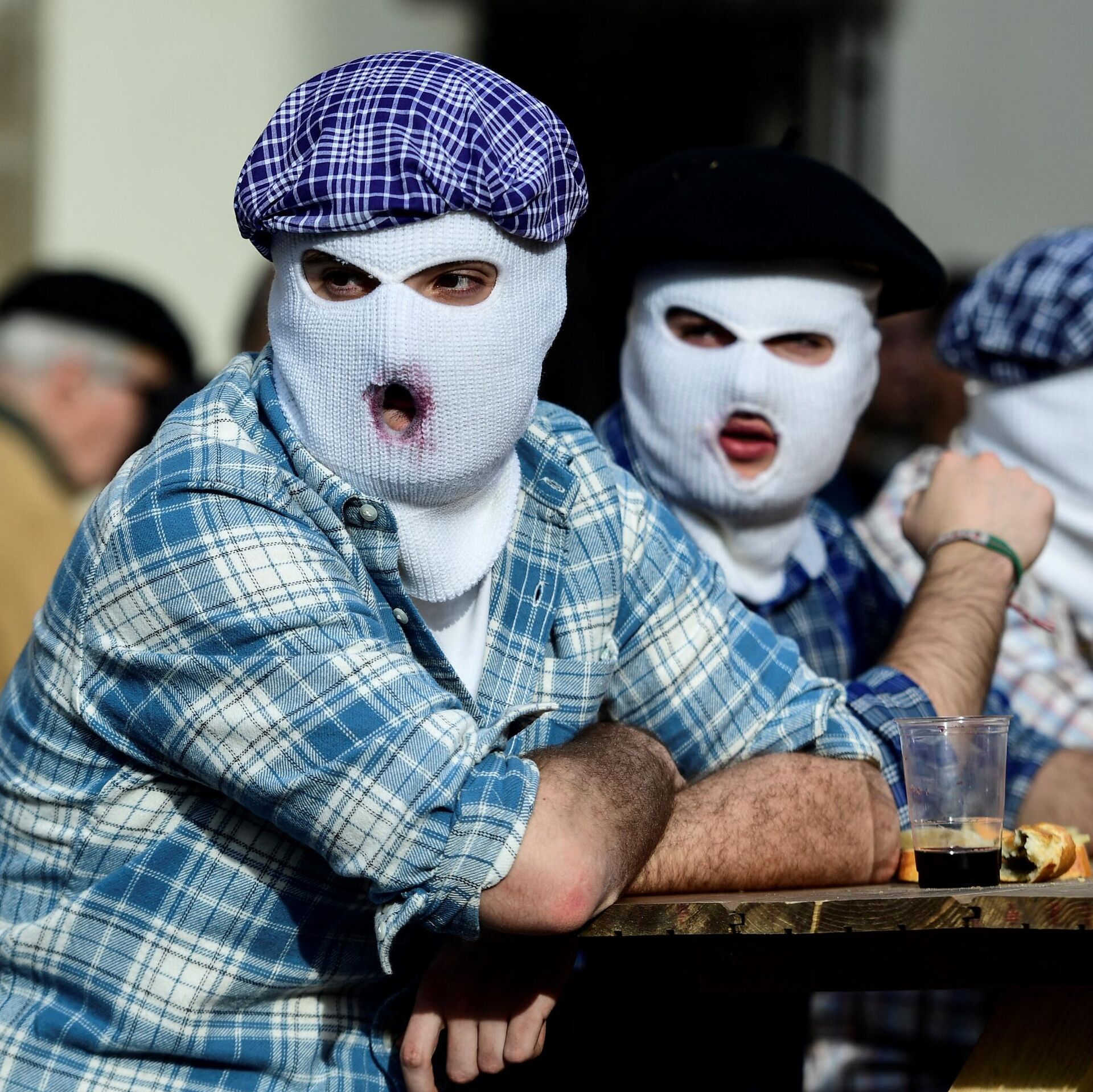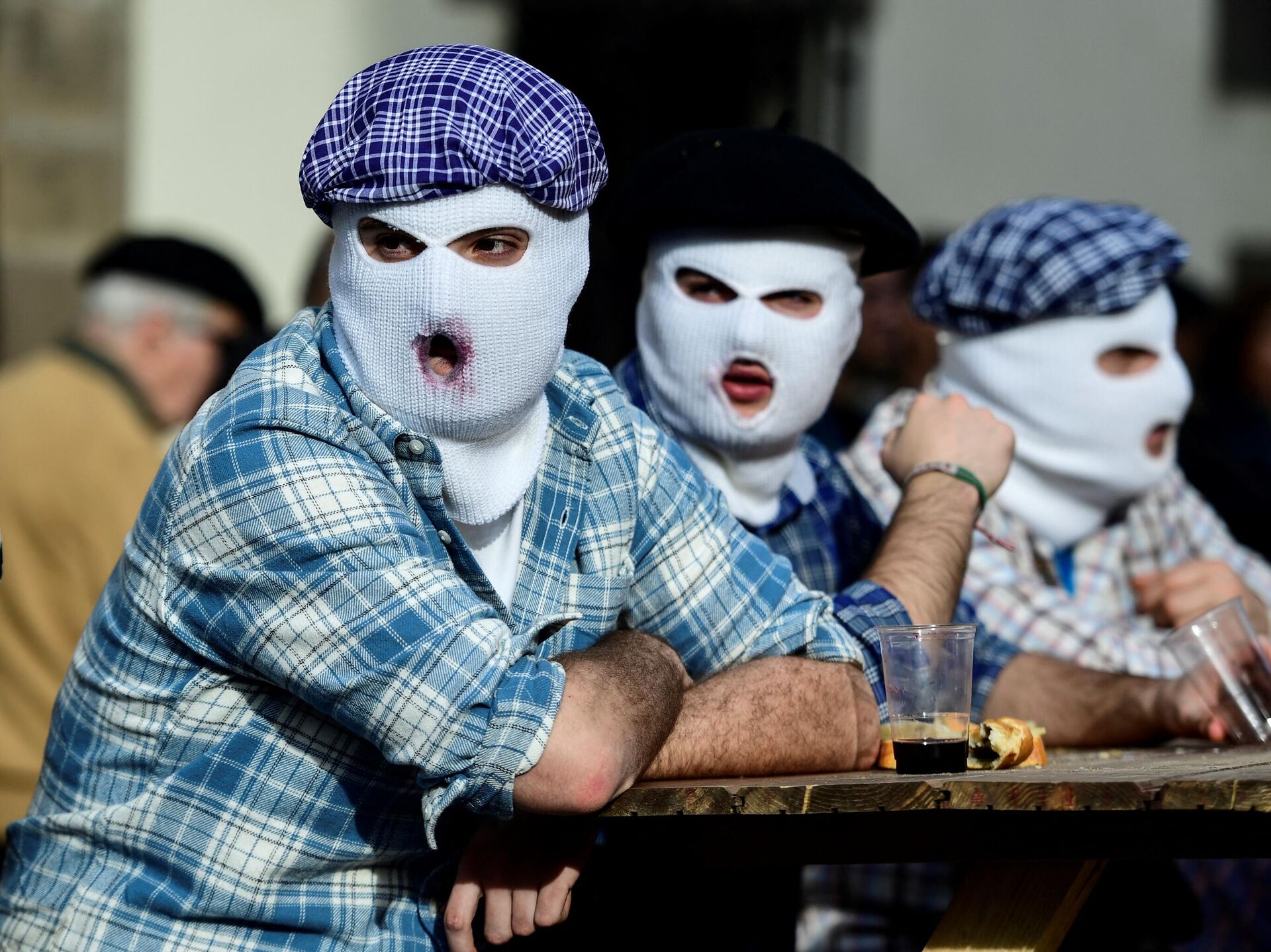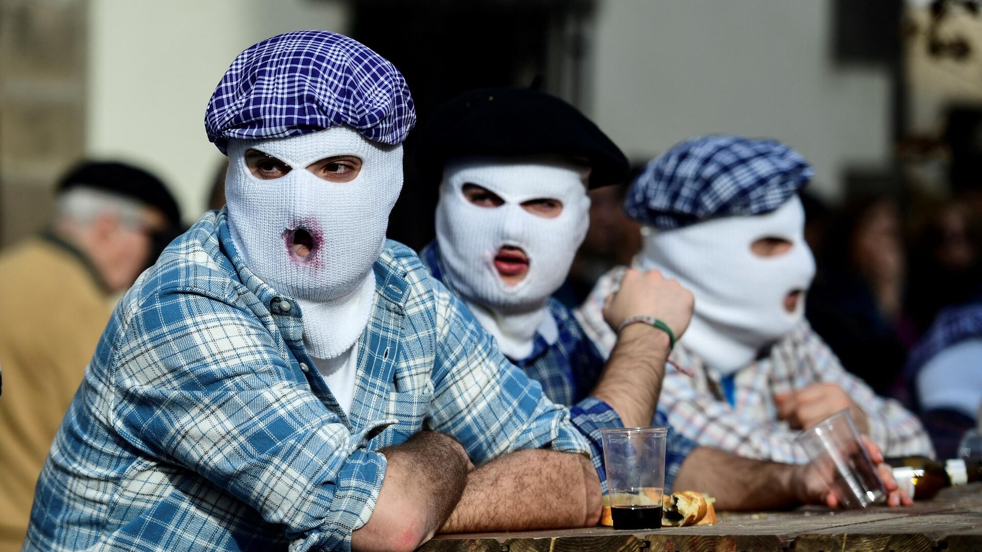 محتفلون ملثمون يشاركون في كرنفال "إيتورين" التقليدي، في مقاطعة نافار شمالي إسبانيا، في 29 يناير/ كانون الثاني 2024.
