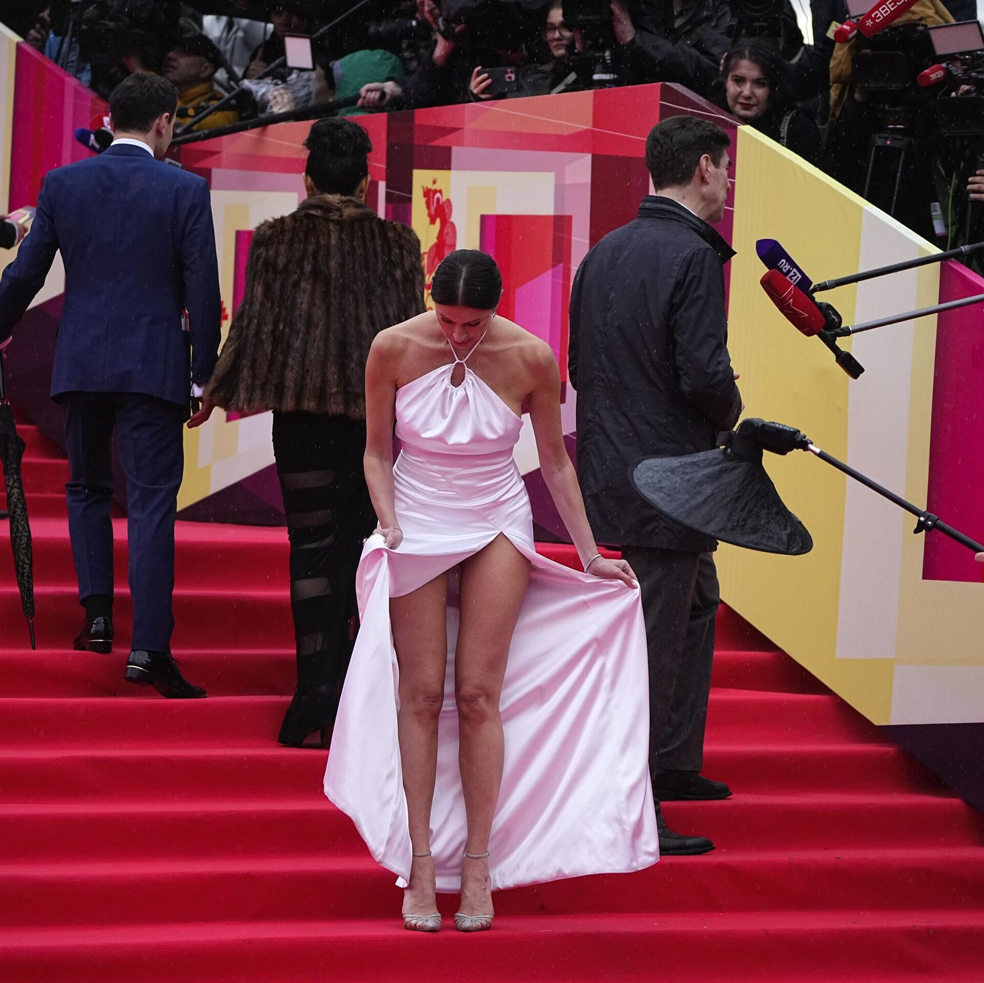 ممثلة تستعد لالتقاط صورة بعد وصولها إلى السجادة الحمراء في حفل افتتاح مهرجان موسكو السينمائي الدولي السادس والأربعين في موسكو، روسيا، الجمعة، 19 أبريل 2024.