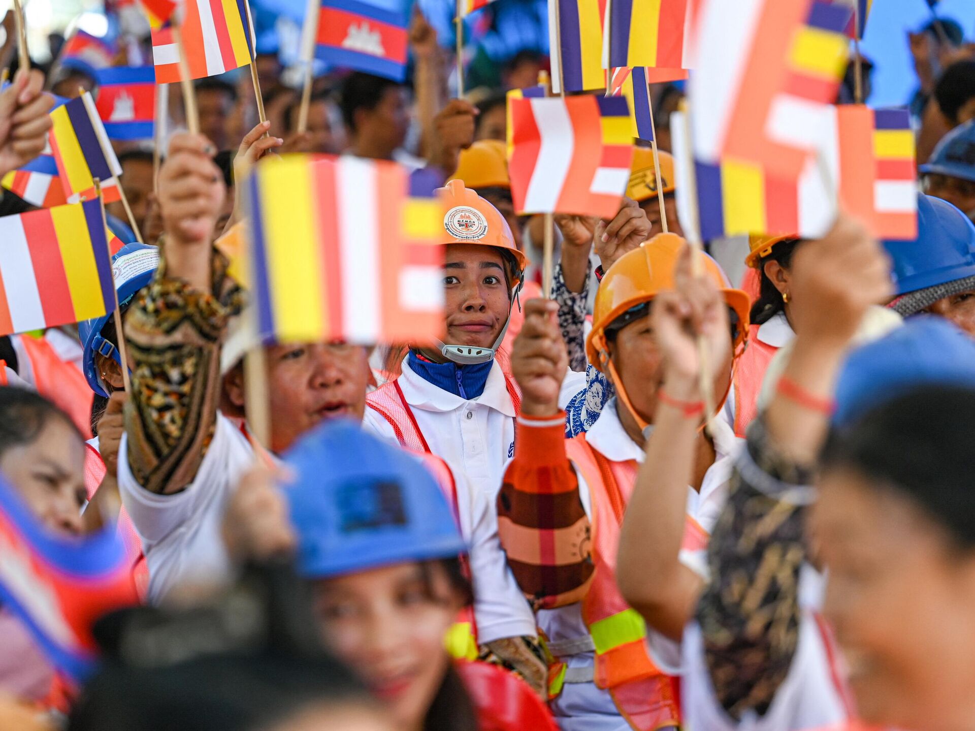 عمال يحملون الأعلام وهم يسيرون في أحد الشوارع خلال الاحتفال بيوم العمال العالمي في كومبوديا في 1 مايو 2024.