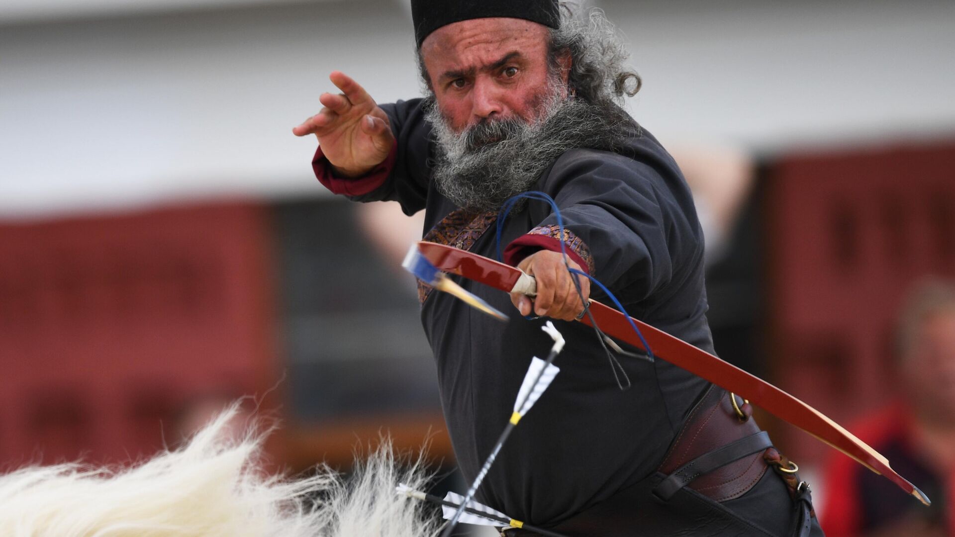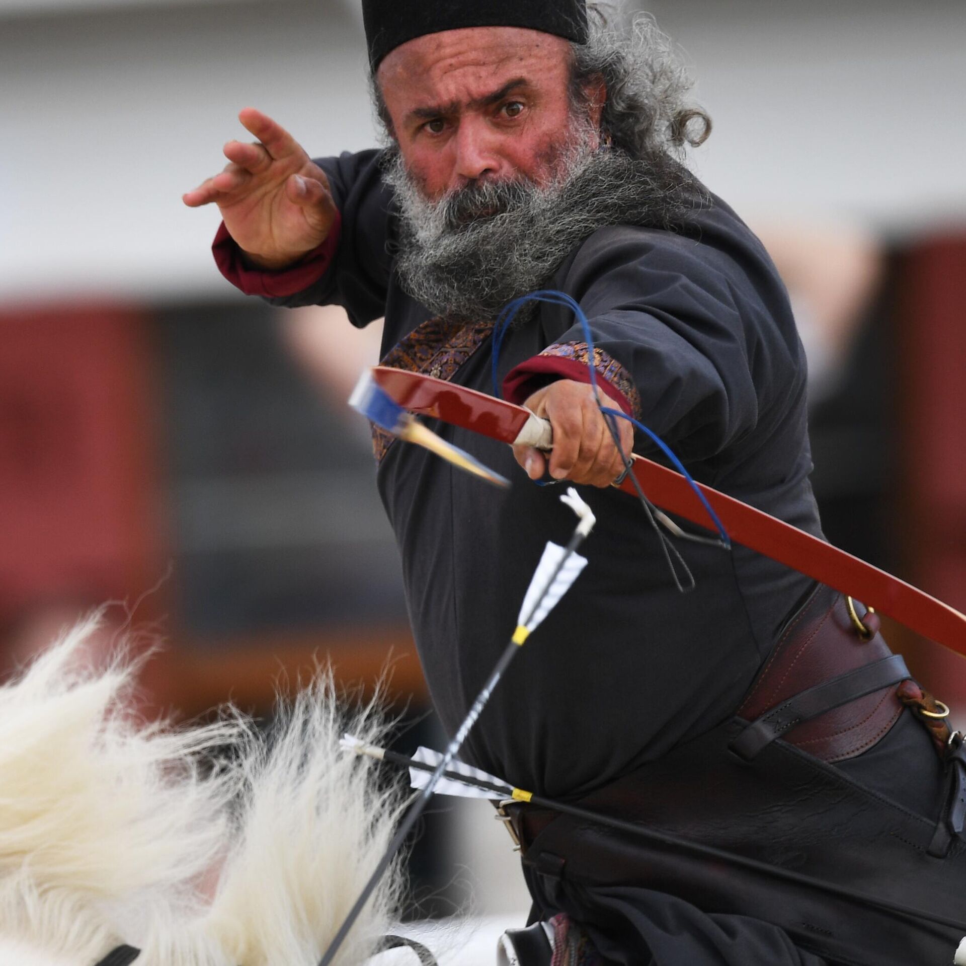الفارسان الروسيان يان ليتوفالتسيف، وسافيلي بورودينكو، يرميان السهام خلال مشاركتهما في مسابقة "الفروسية والرماية" الدولية، في مجمع "في دي إن خا"، في موسكو.