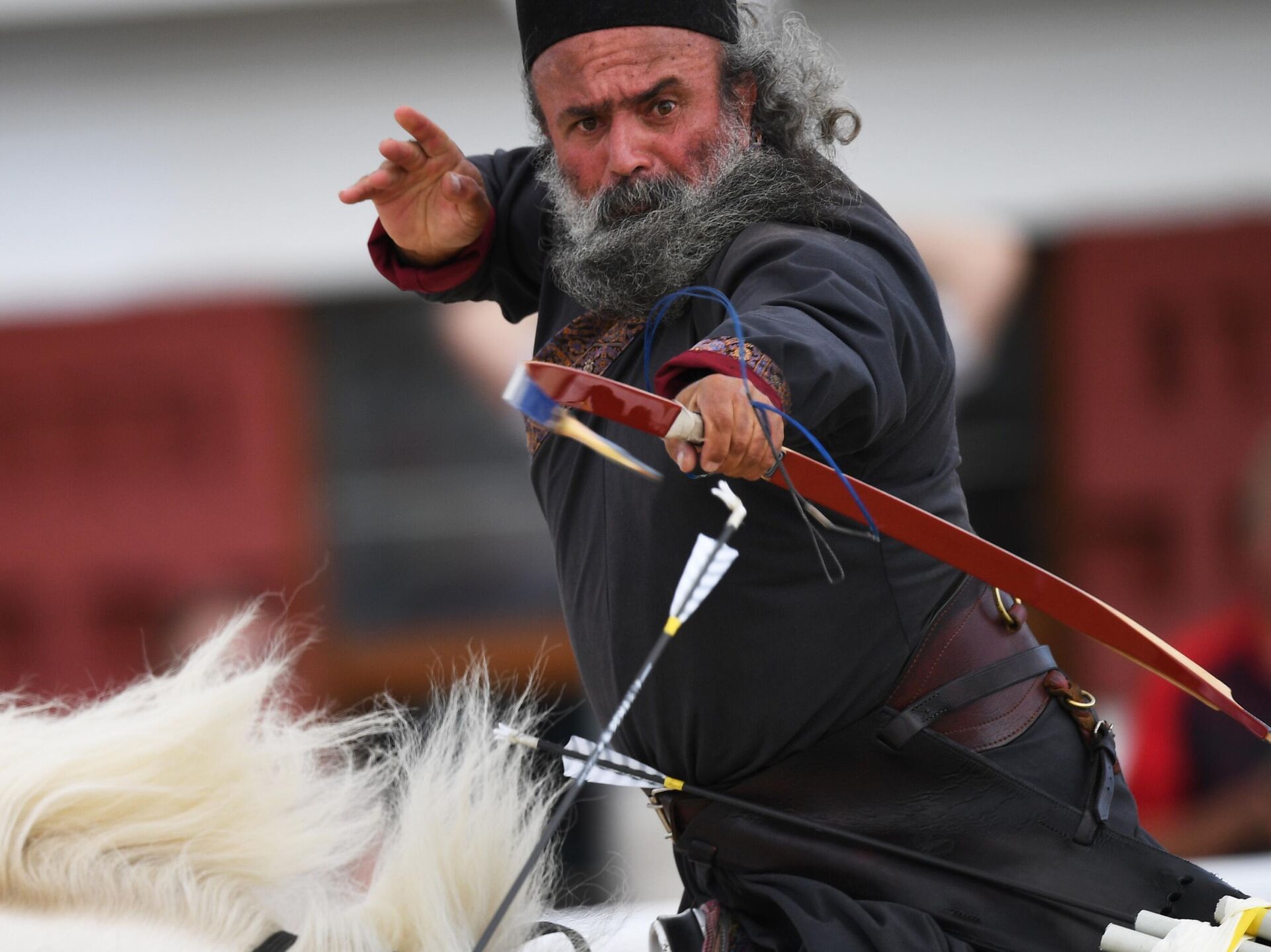 الفارس الإيراني علي غورشاني يتفقد سهامه قبل المشاركة في مسابقة "الفروسية والرماية" الدولية، في مجمع "في دي إن خا"، في موسكو.
