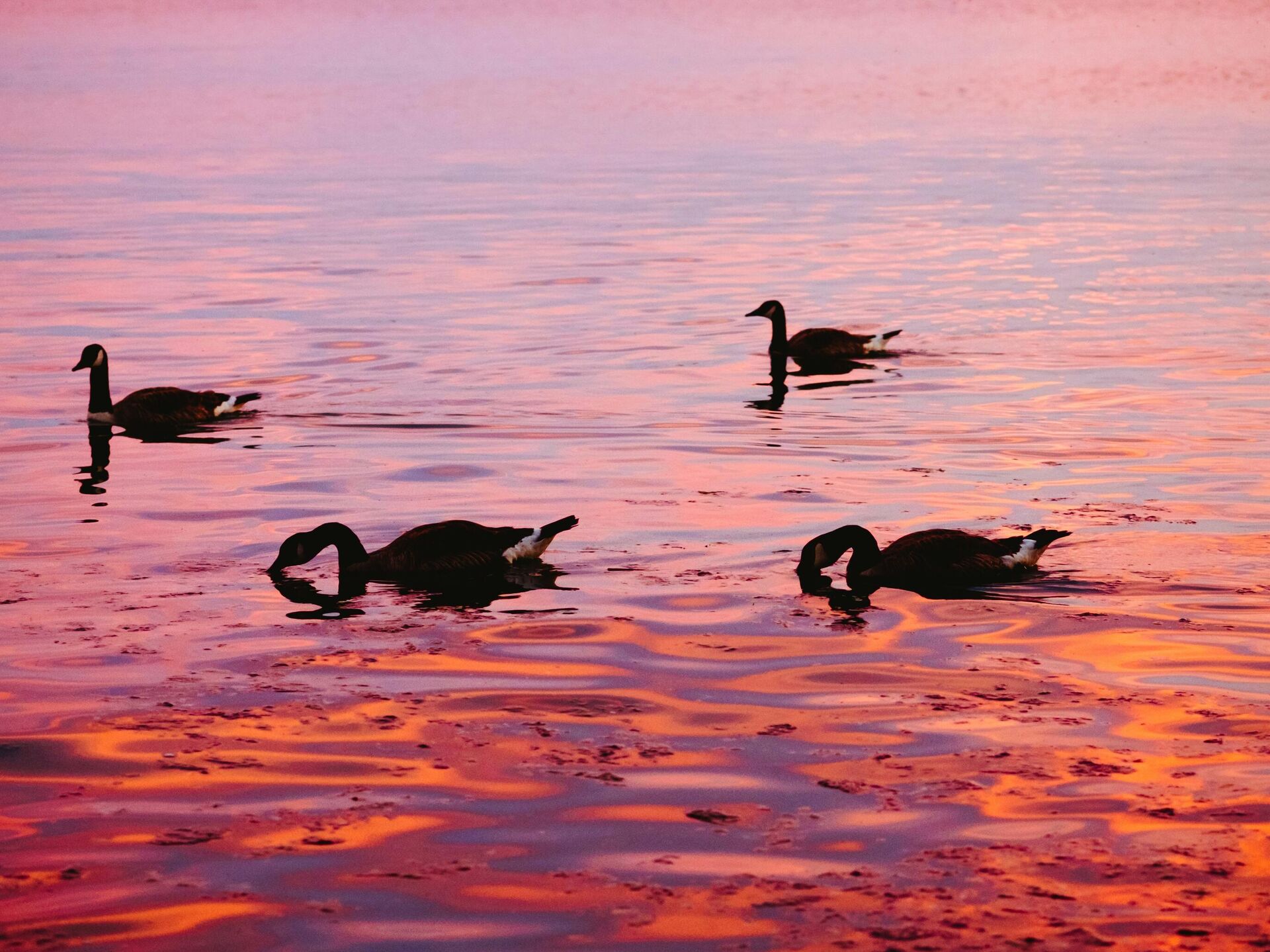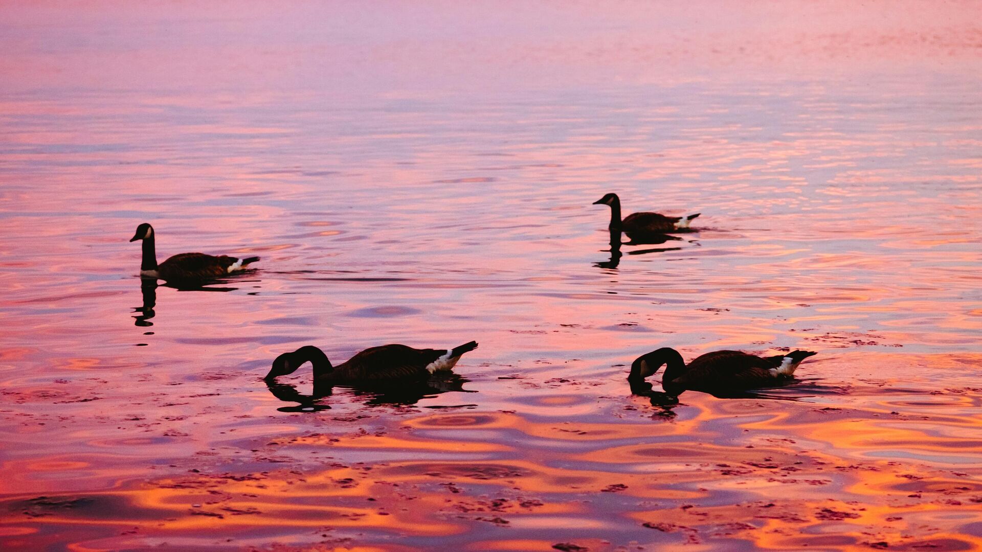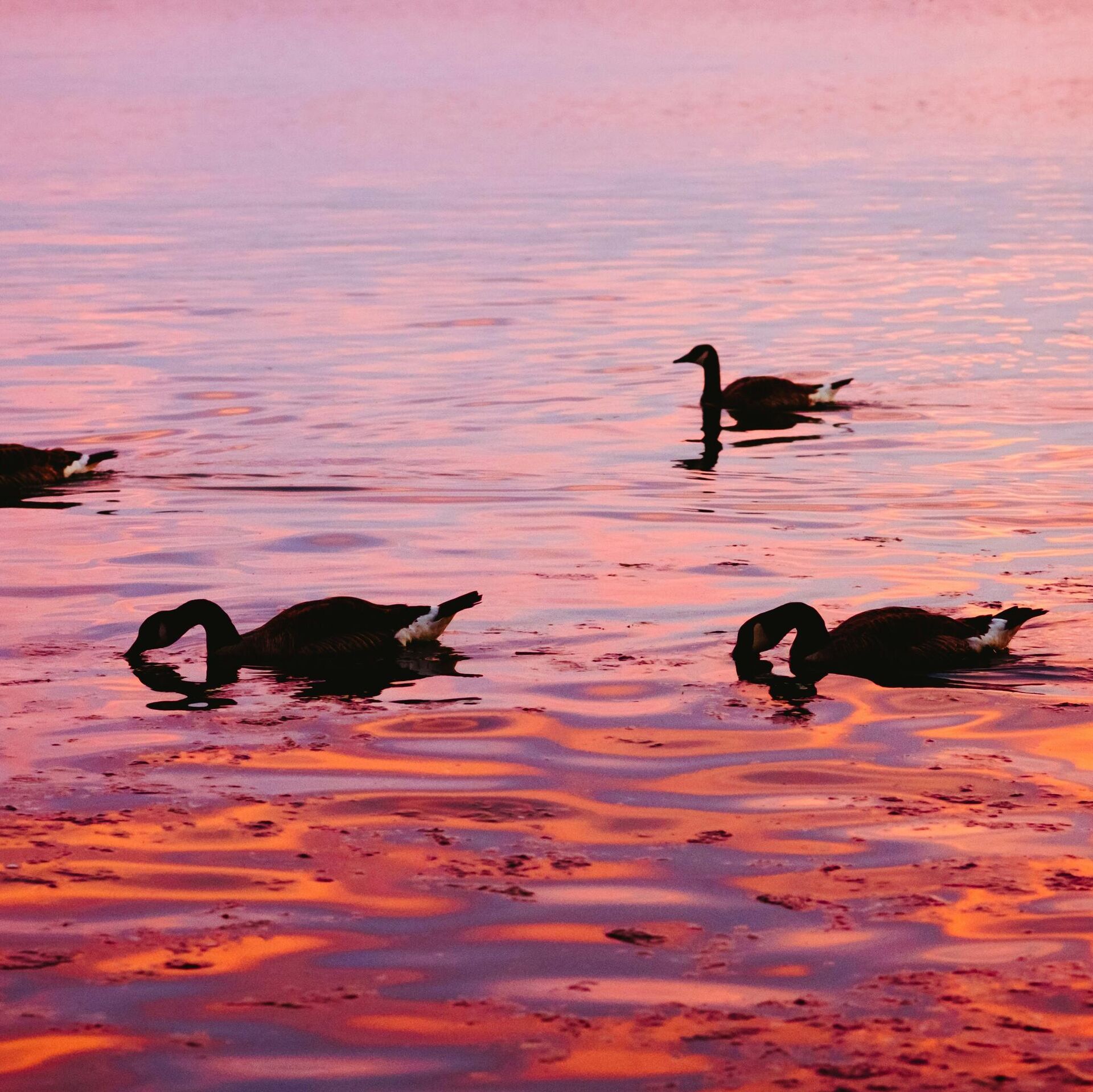 © Photo / Unsplash/Elvir Kطيور الأوز تسبح في بحيرة أثناء غروب الشمس الوردي والبرتقالي الجميل.