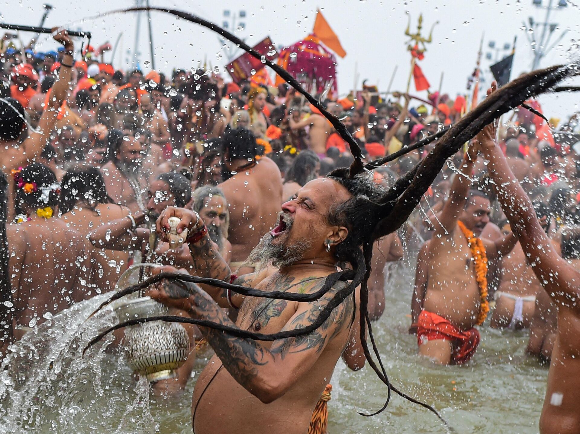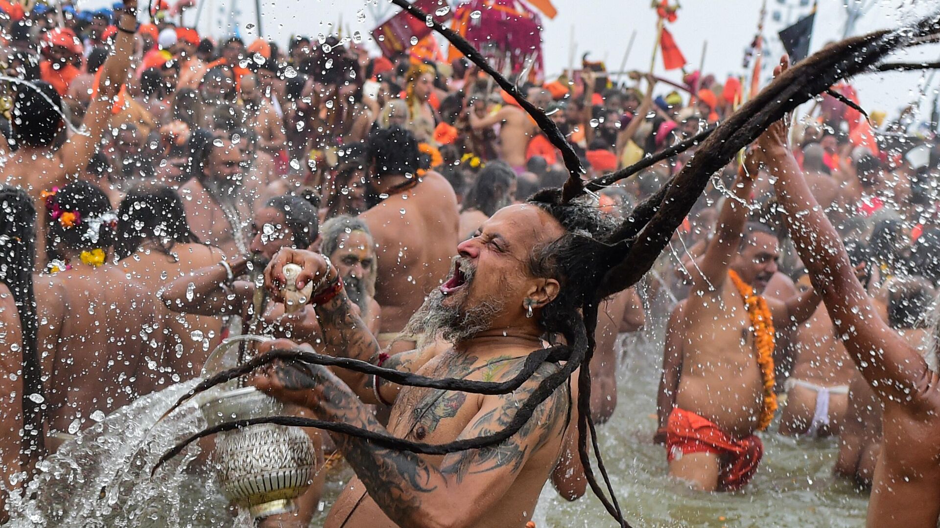 رهبان الناغا يقومون بالغطس المقدس في سانغام، بمناسبة "ماكار سانكراتي"، أول يوم استحمام ملكي في الهند، ضمن مهرجان "كومبه ميلا".