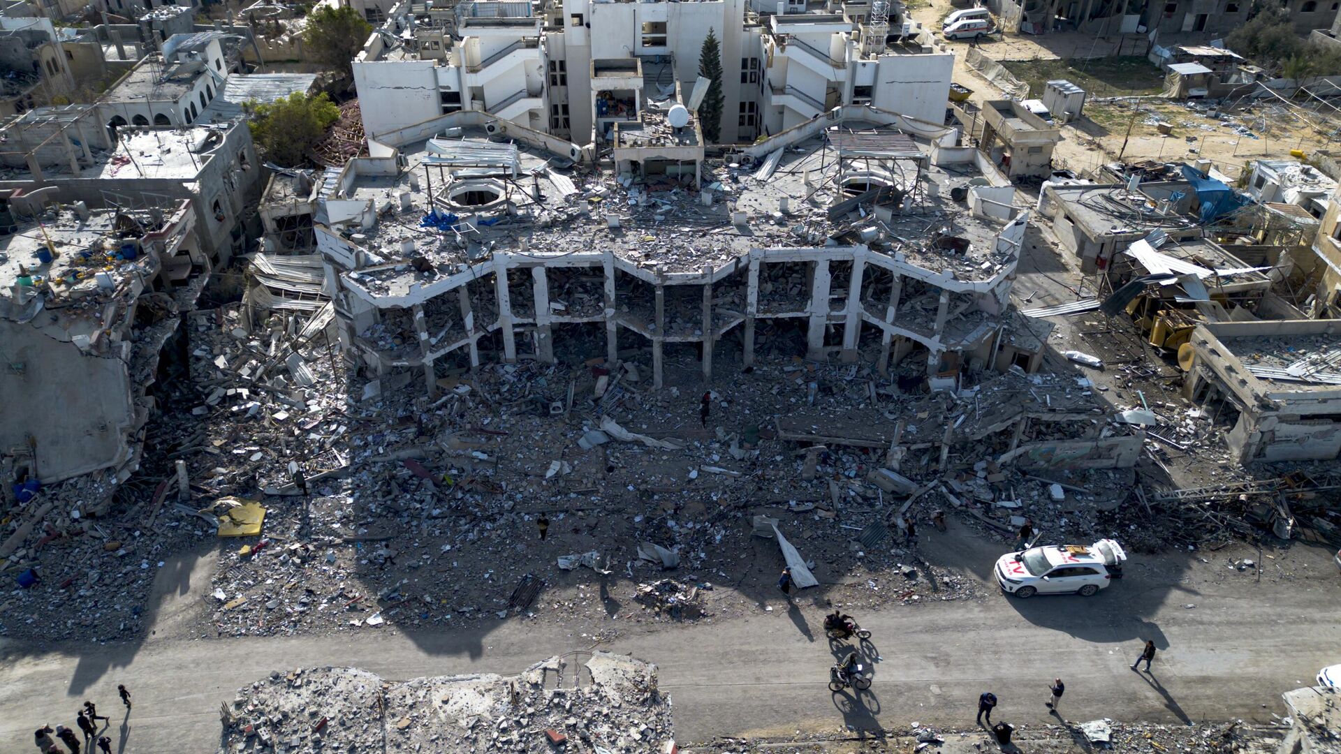 صورة التقطتها طائرة دون طيار تظهر فلسطينيين يسيرون في الدمار الذي خلفه الهجوم الجوي والبري الإسرائيلي في رفح، بعد اتفاق وقف إطلاق النار بين "حماس" وإسرائيل، قطاع غزة.