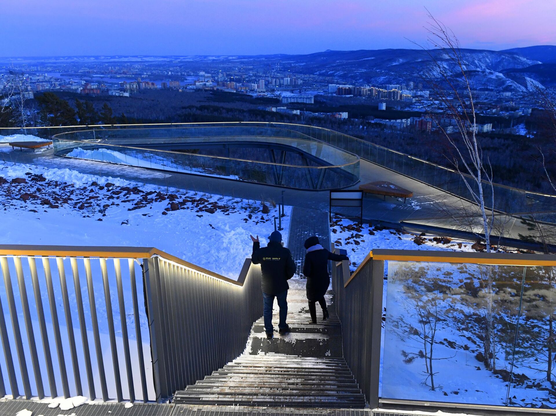 منظر لمنطقتي أوكتيابرسكي وسفيردلوفسكي في المدينة أثناء غروب الشمس من نيكولاييفسكايا سوبكا، أعلى نقطة جغرافية داخل حدود مدينة كراسنويارسك.