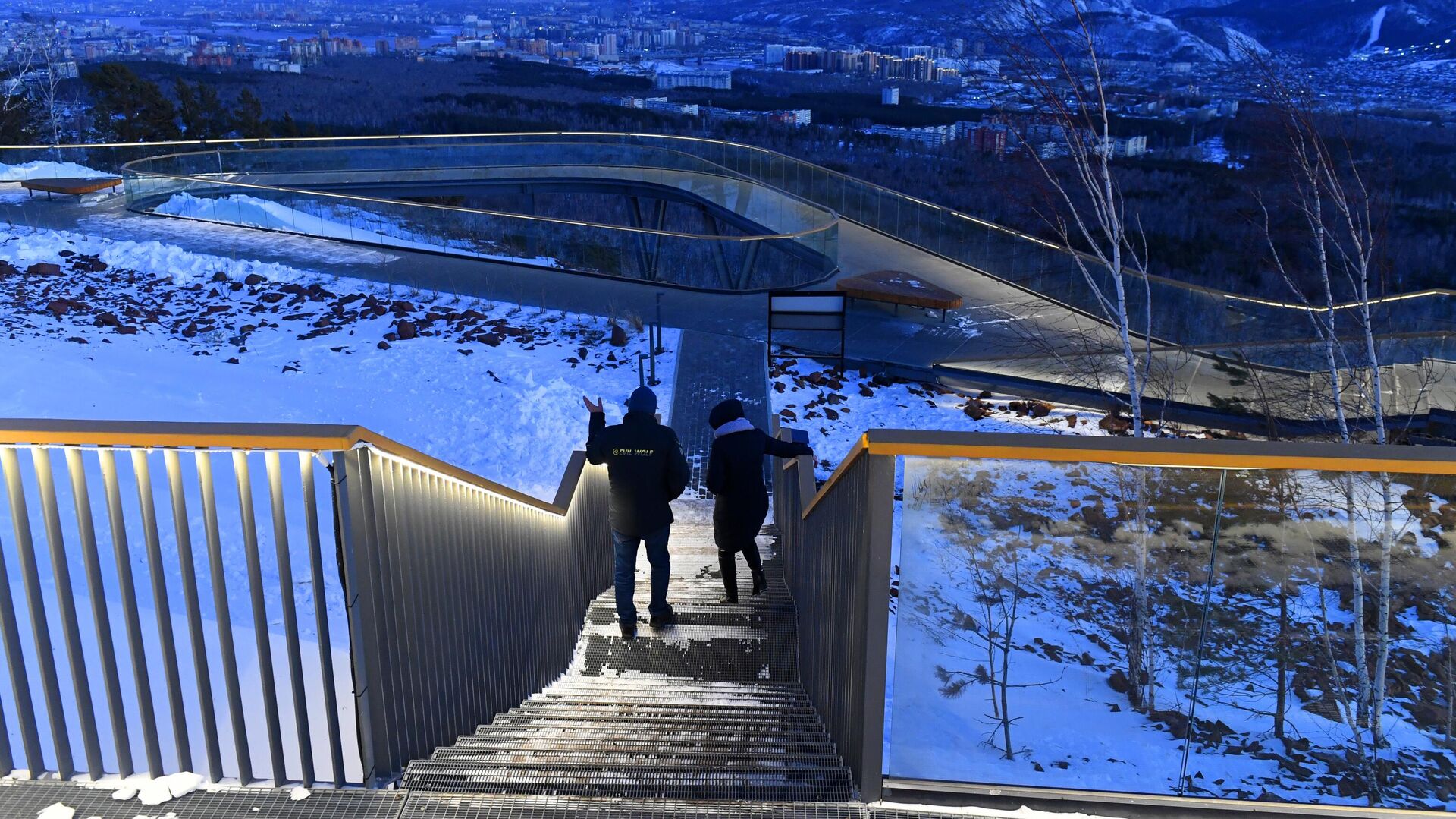 يلتقط الناس الصور أثناء غروب الشمس في منصة المراقبة في نيكولاييفسكايا سوبكا، أعلى نقطة جغرافية داخل حدود مدينة كراسنويارسك.