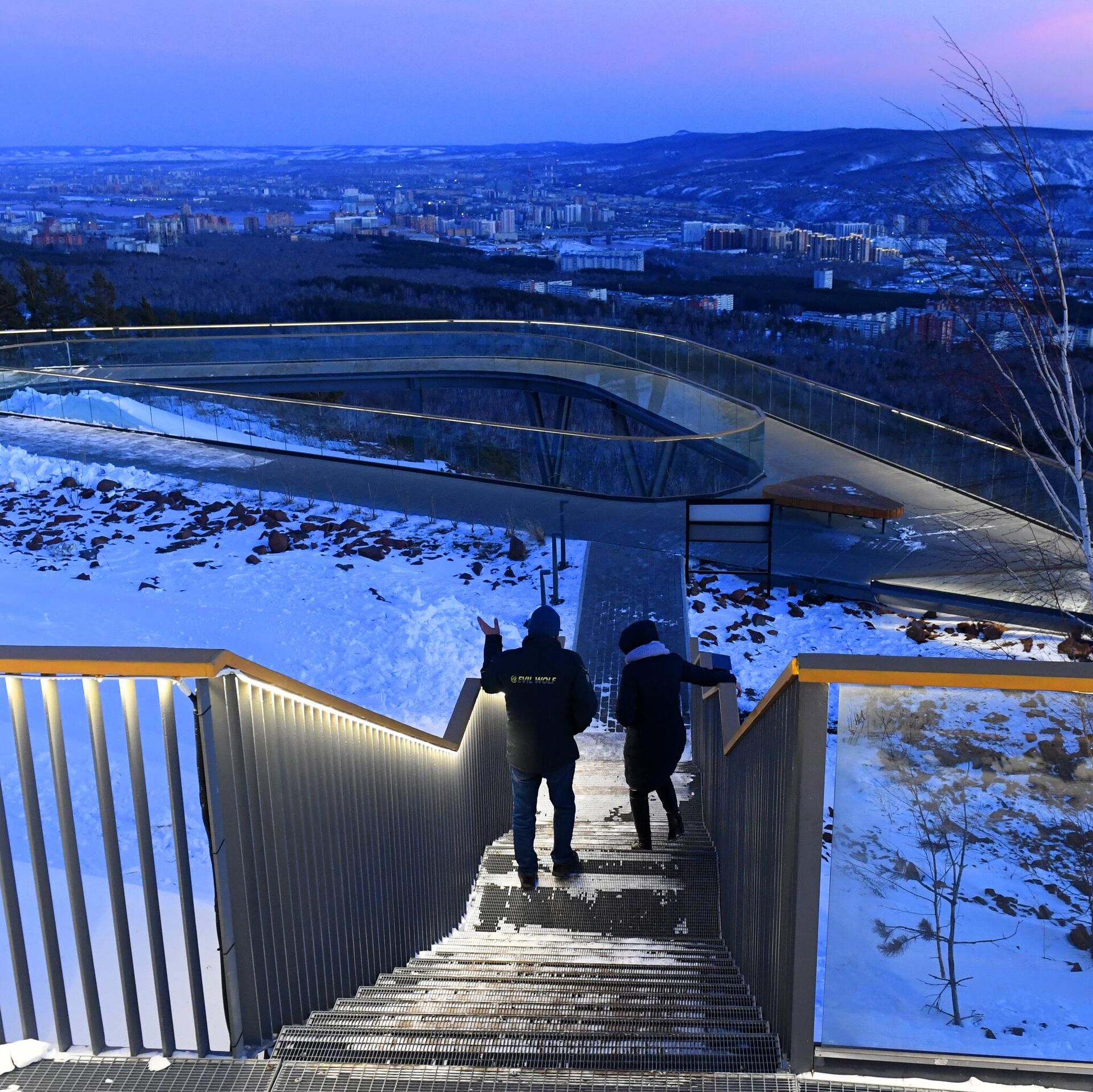 الناس أثناء غروب الشمس على سطح المراقبة في نيكولاييفسكايا سوبكا، أعلى نقطة جغرافية داخل حدود مدينة كراسنويارسك.