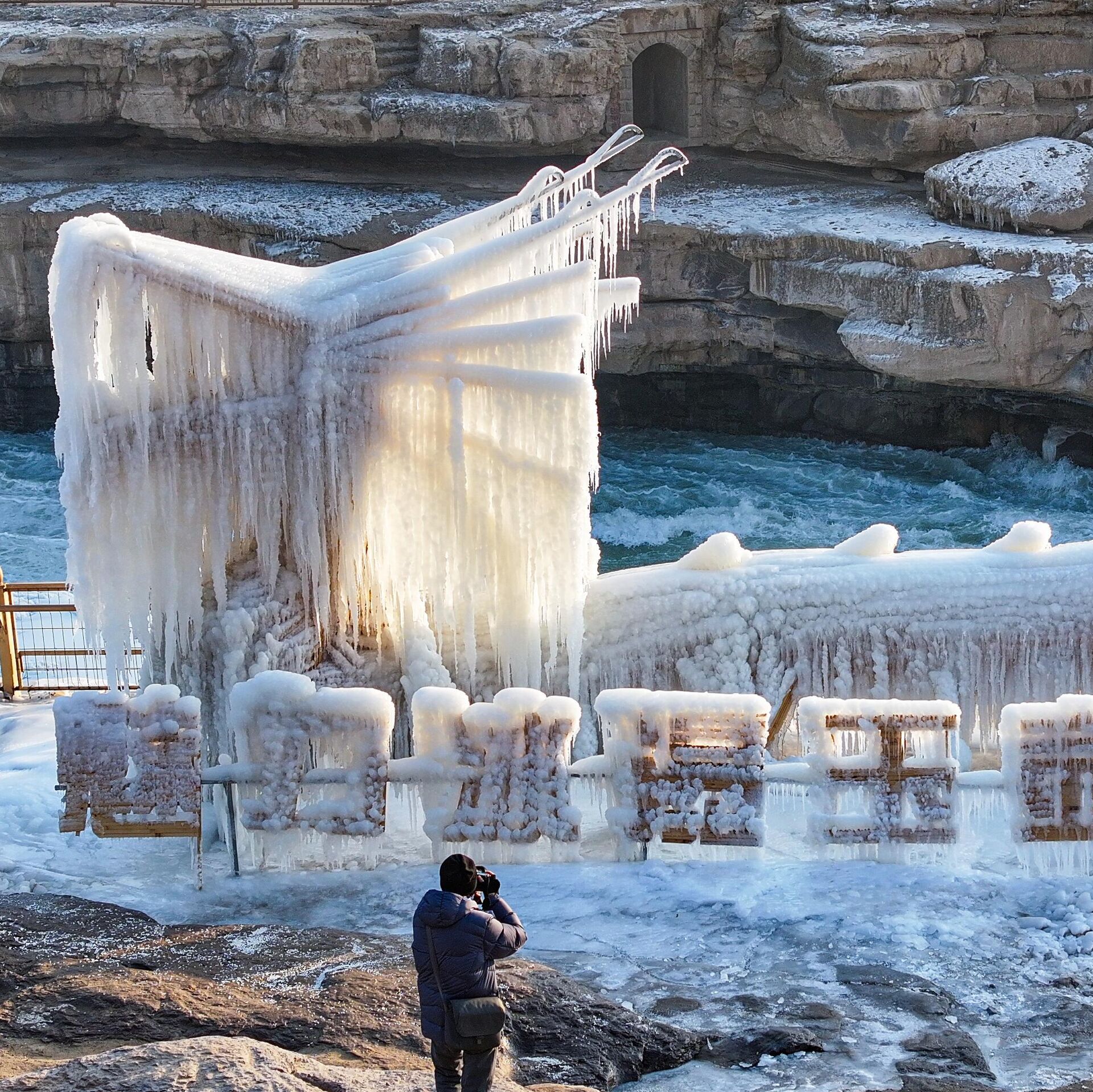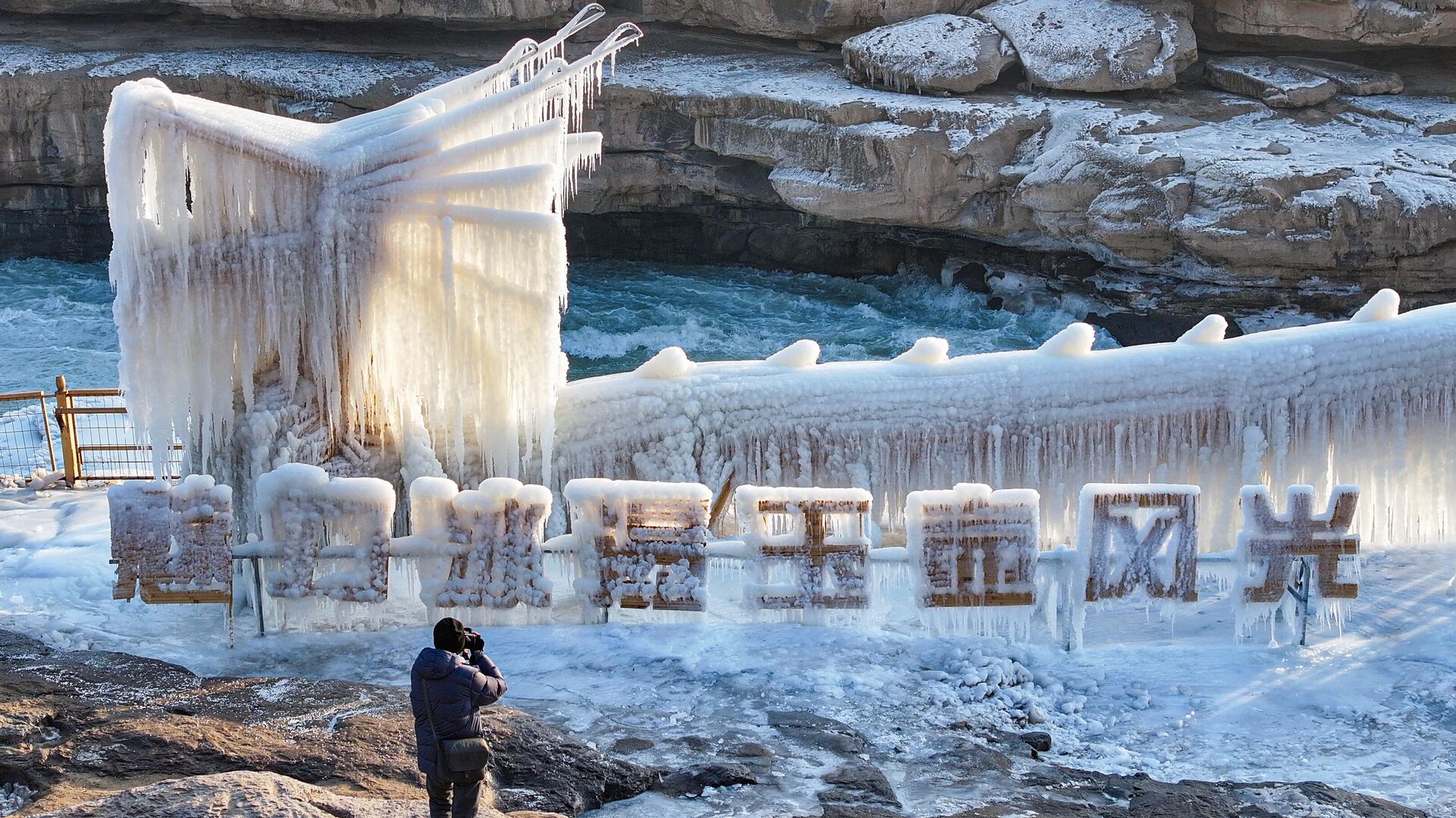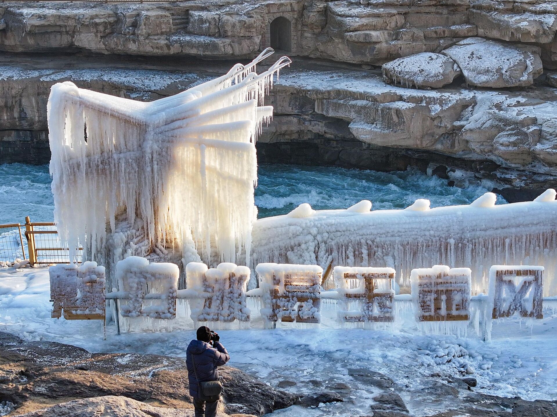 هواء الشتاء المتجمد يحول شلال هوكو إلى أرض عجائب جليدية في الأول من يناير 2025 في يانان بمقاطعة شنشي في الصين. - سبوتنيك عربي