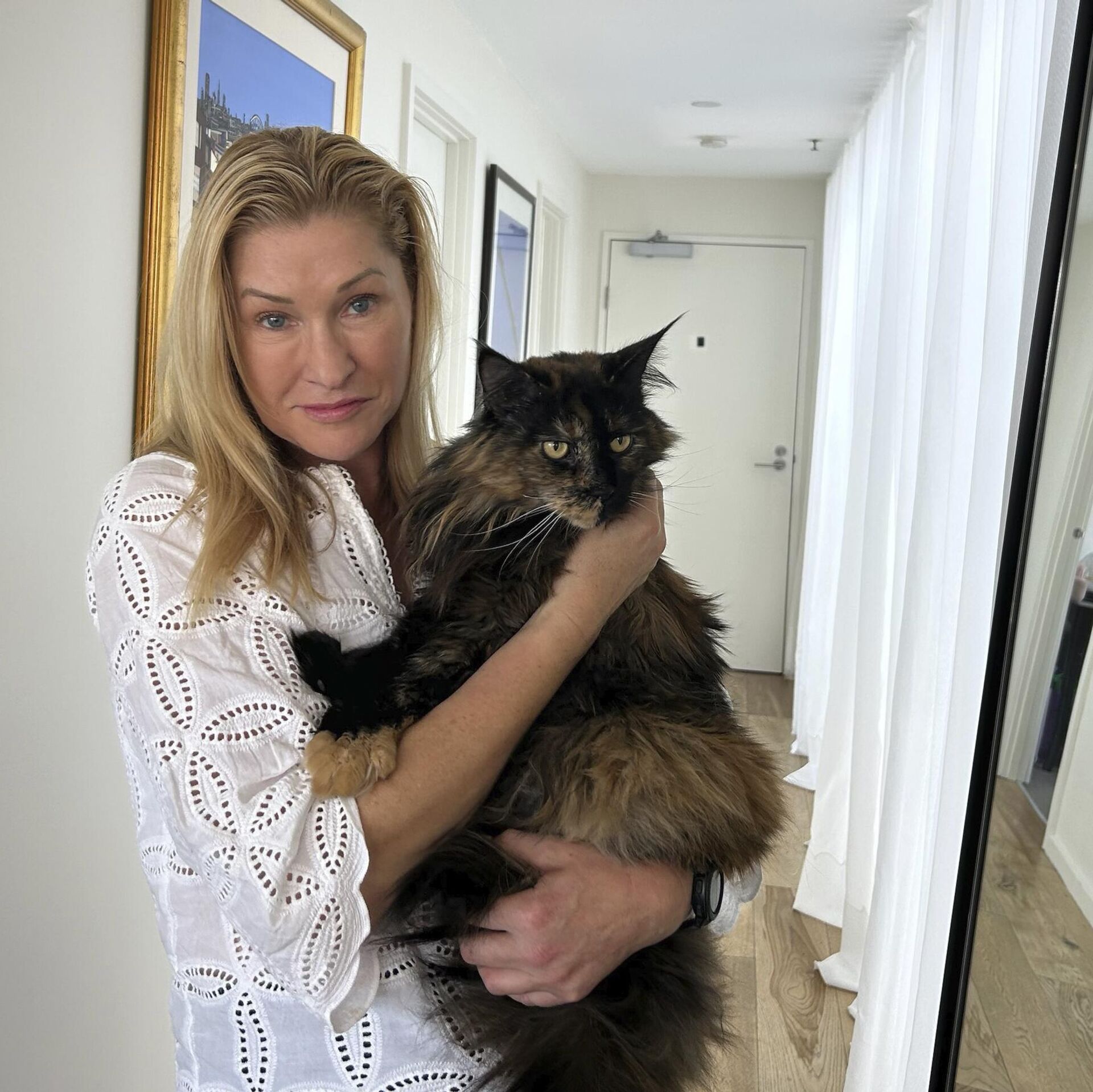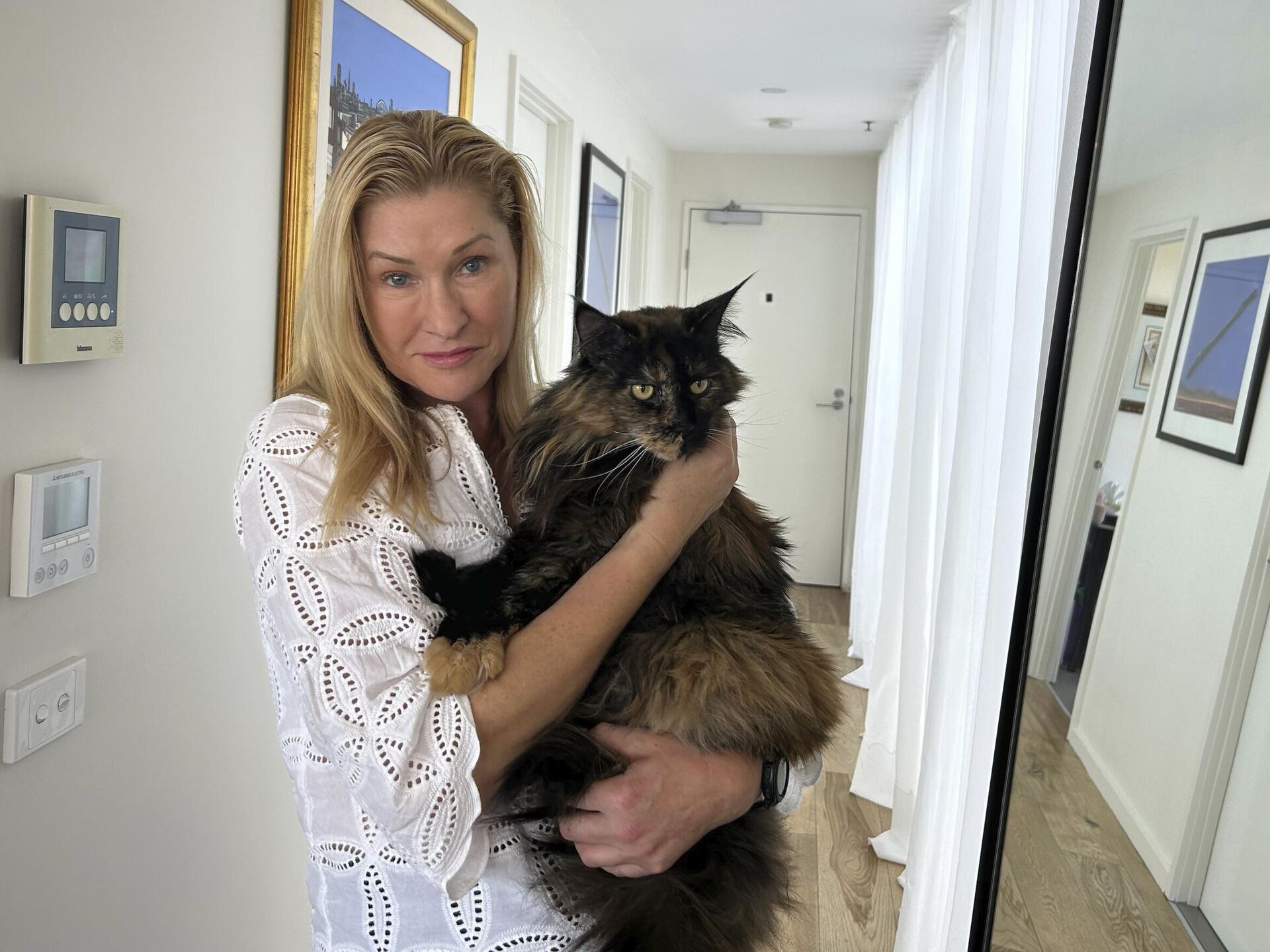 © AP Photo / Rod McGuirkمارغو نياس تحمل قطتها ميتنز في منزلها في ملبورن