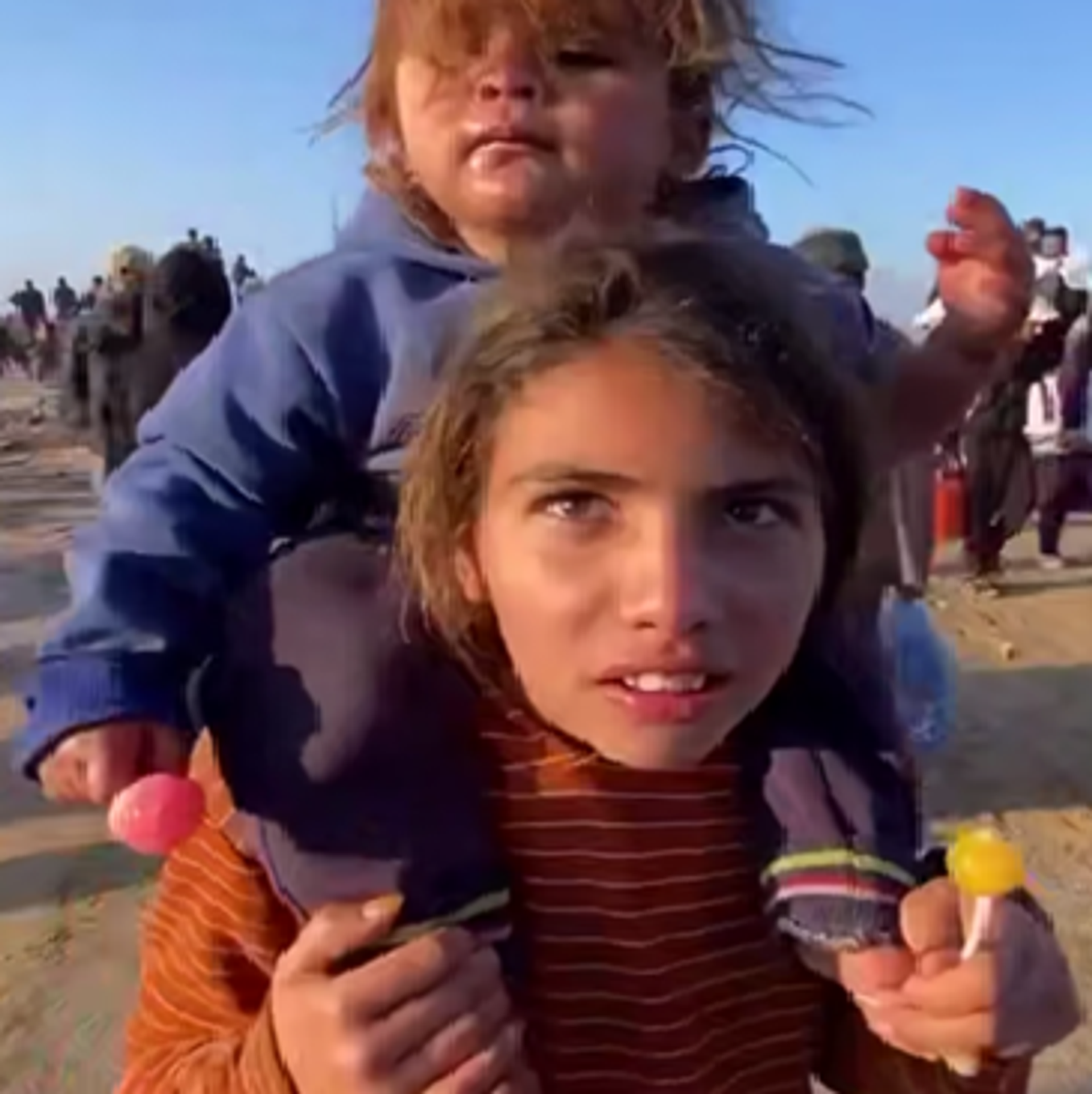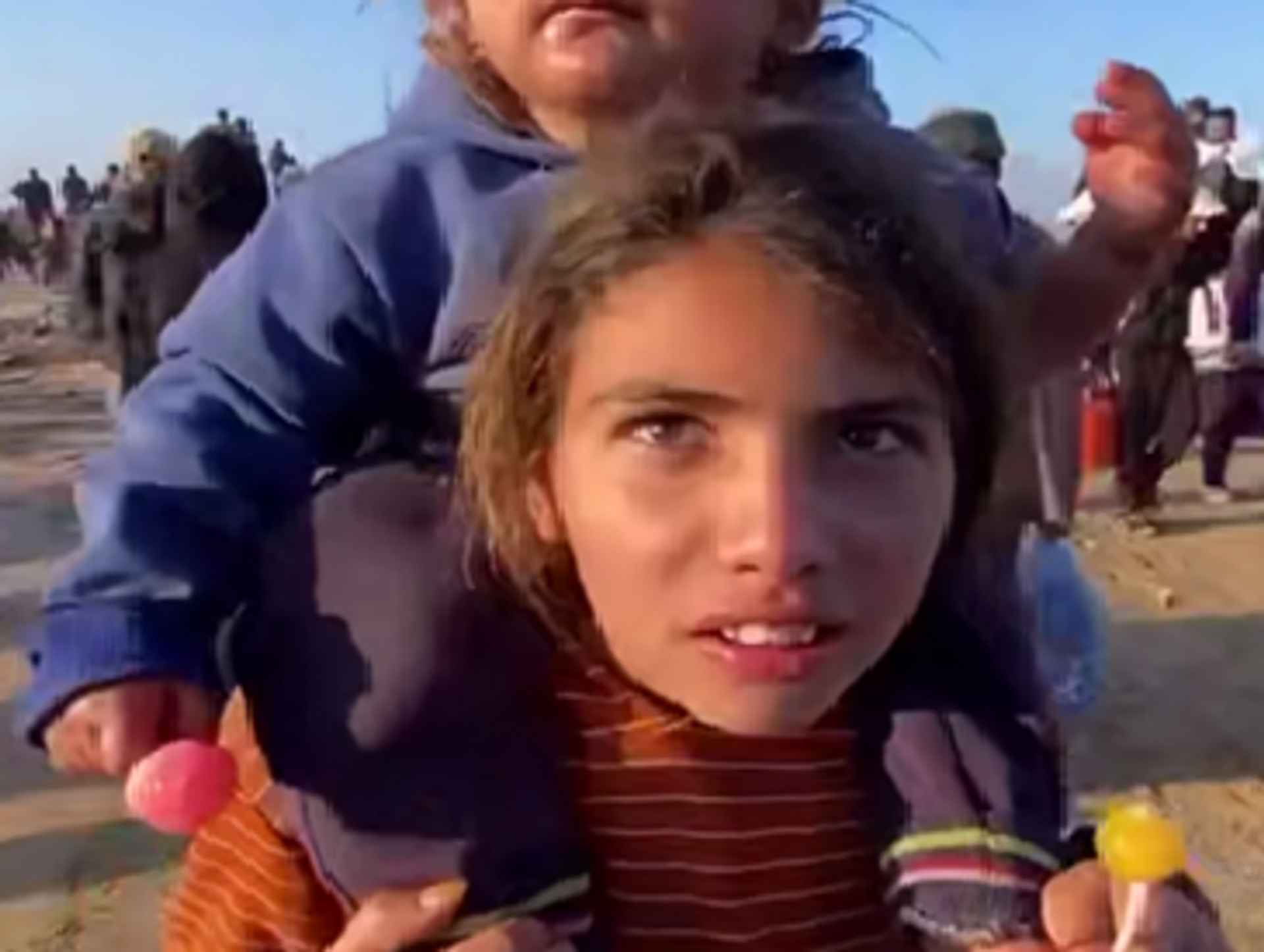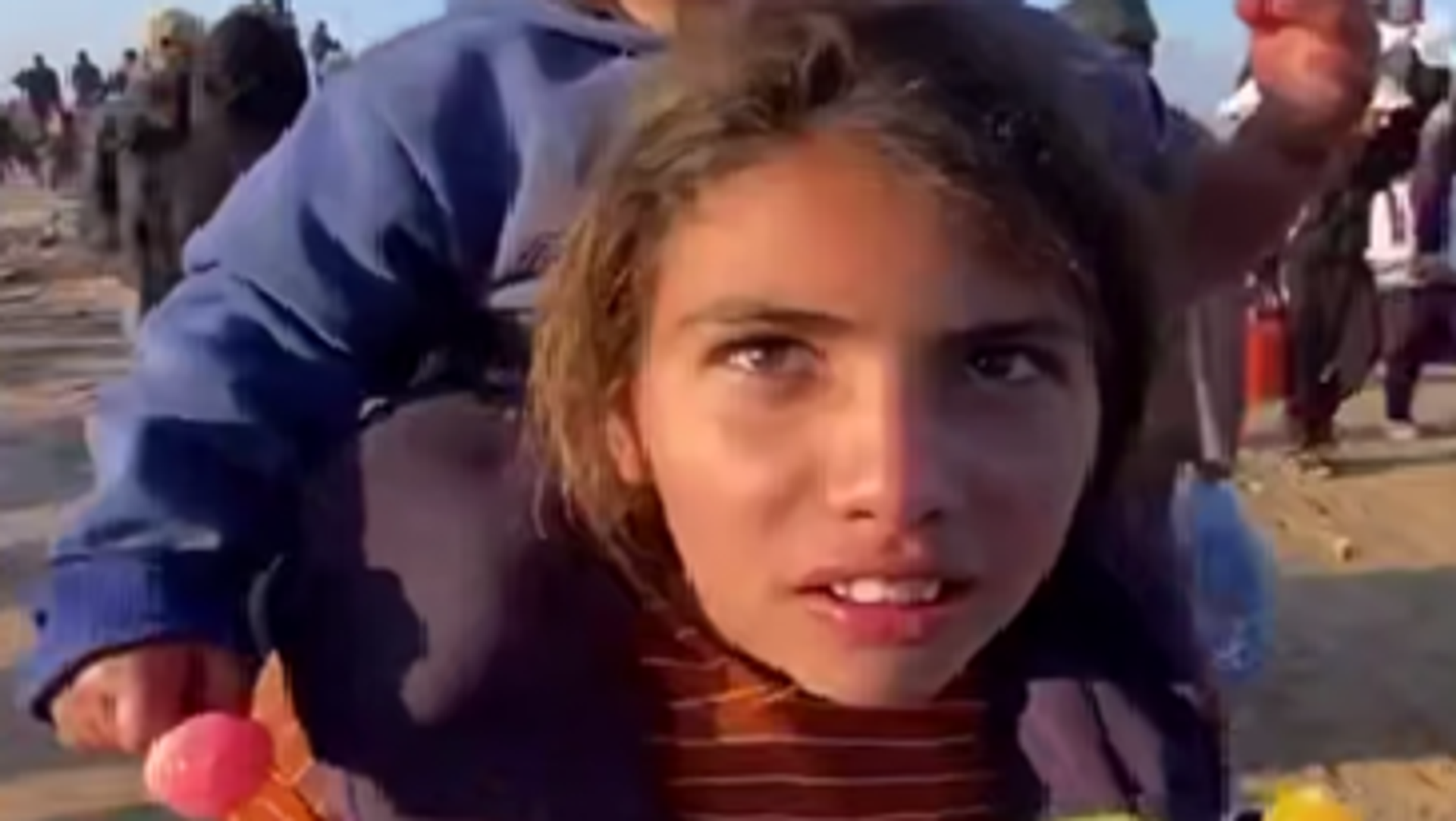 ويظهر الفيديو الذي تداوله رواد مواقع التواصل الاجتماعي الطفلة الفلسطينية وهي تحمل أختها على ظهرها، في صورة تظهر المعاناة التي يعيشها الأطفال الفلسطينيون، وتجسد رحلة النزوح التي يعيشونها.