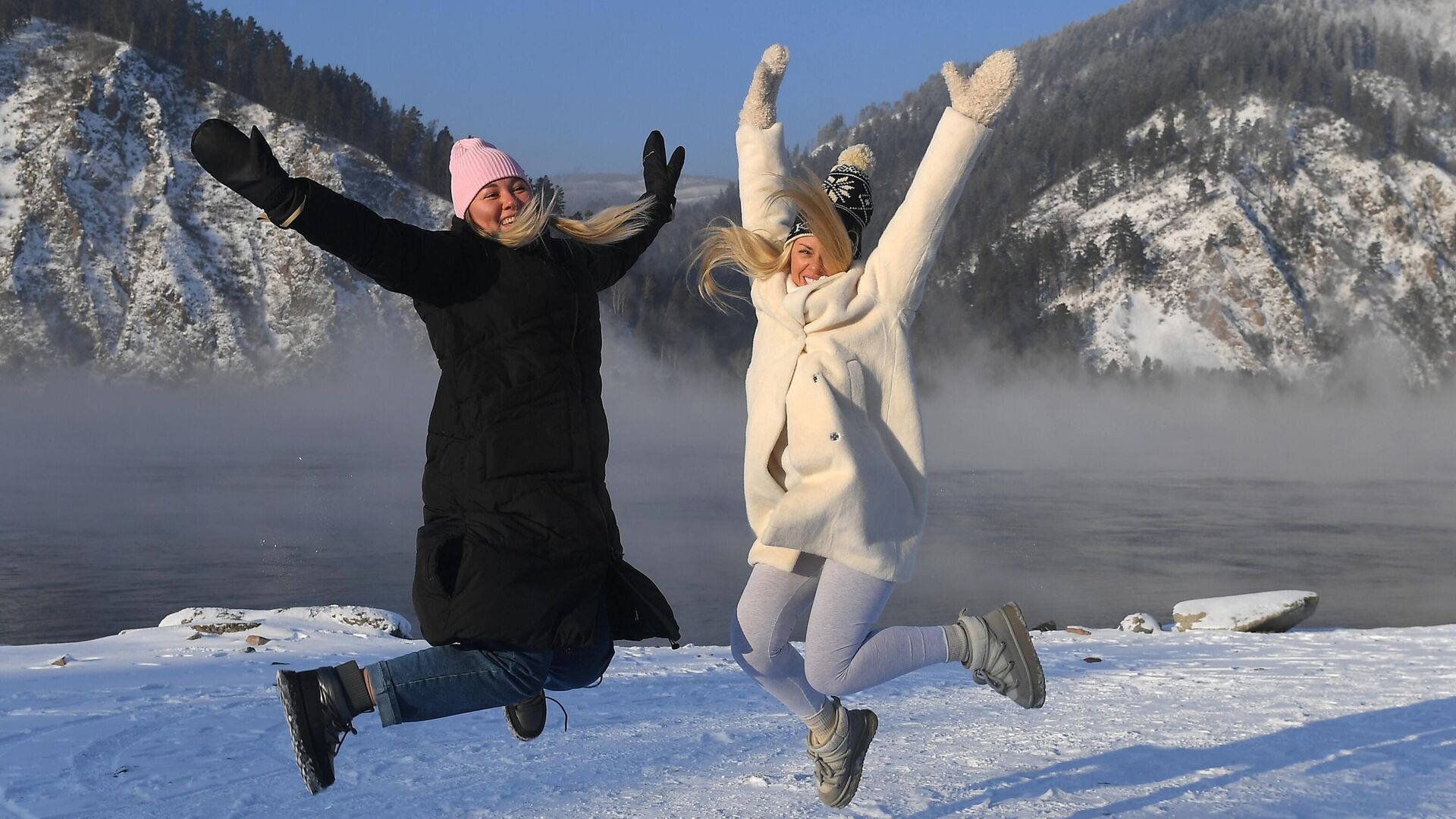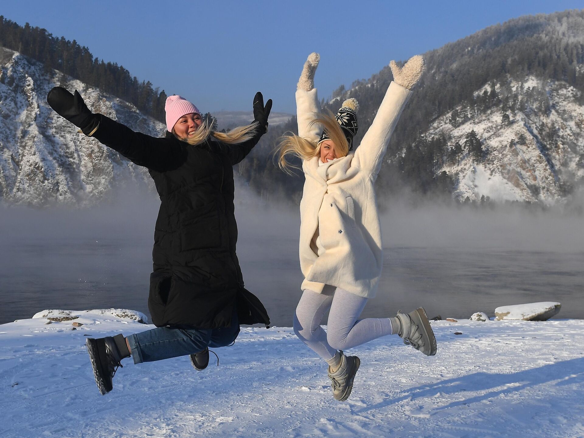 فتيات يلتقطن الصور على ضفة نهر ينيسي في إقليم كراسنويارسك.