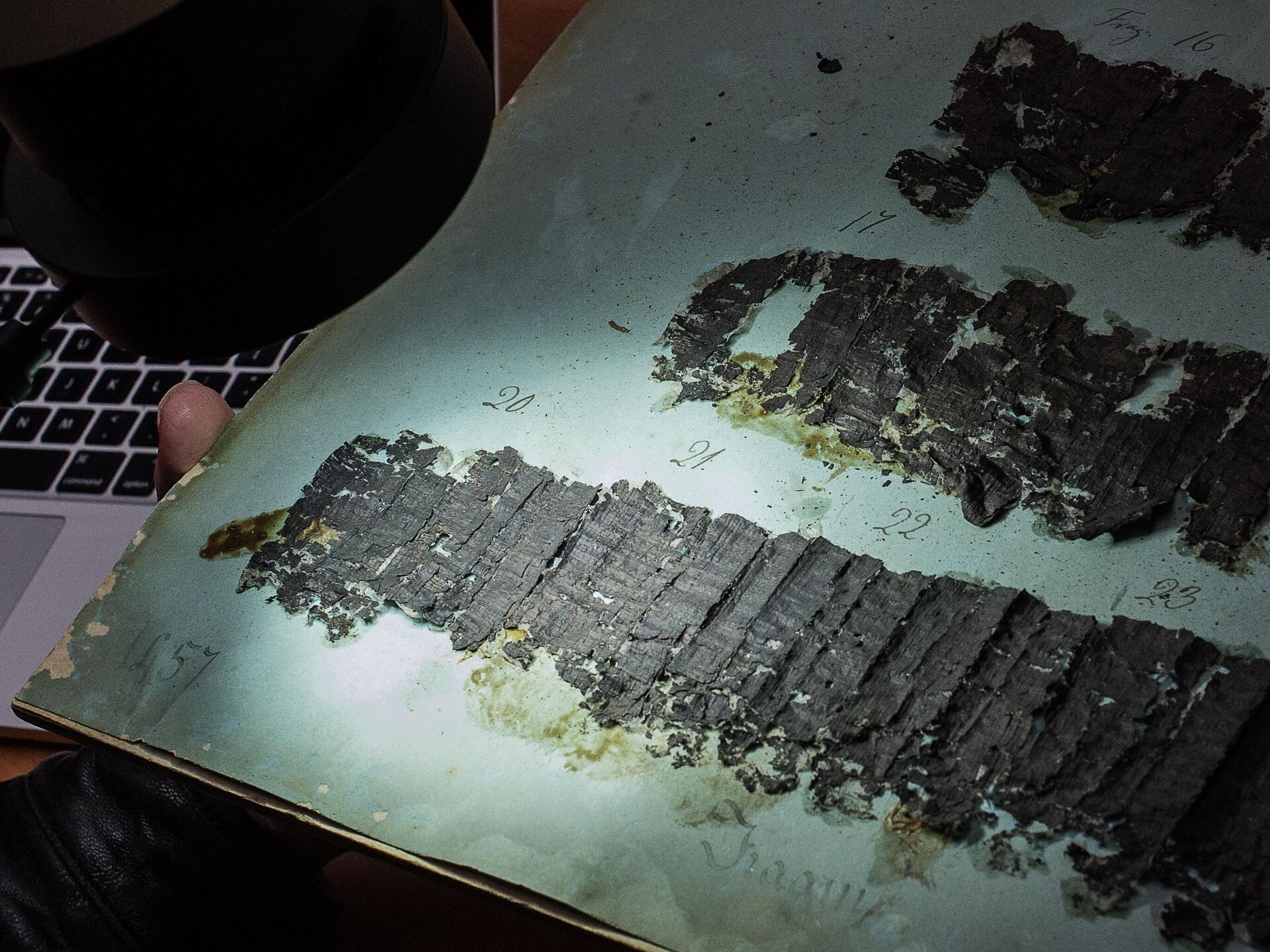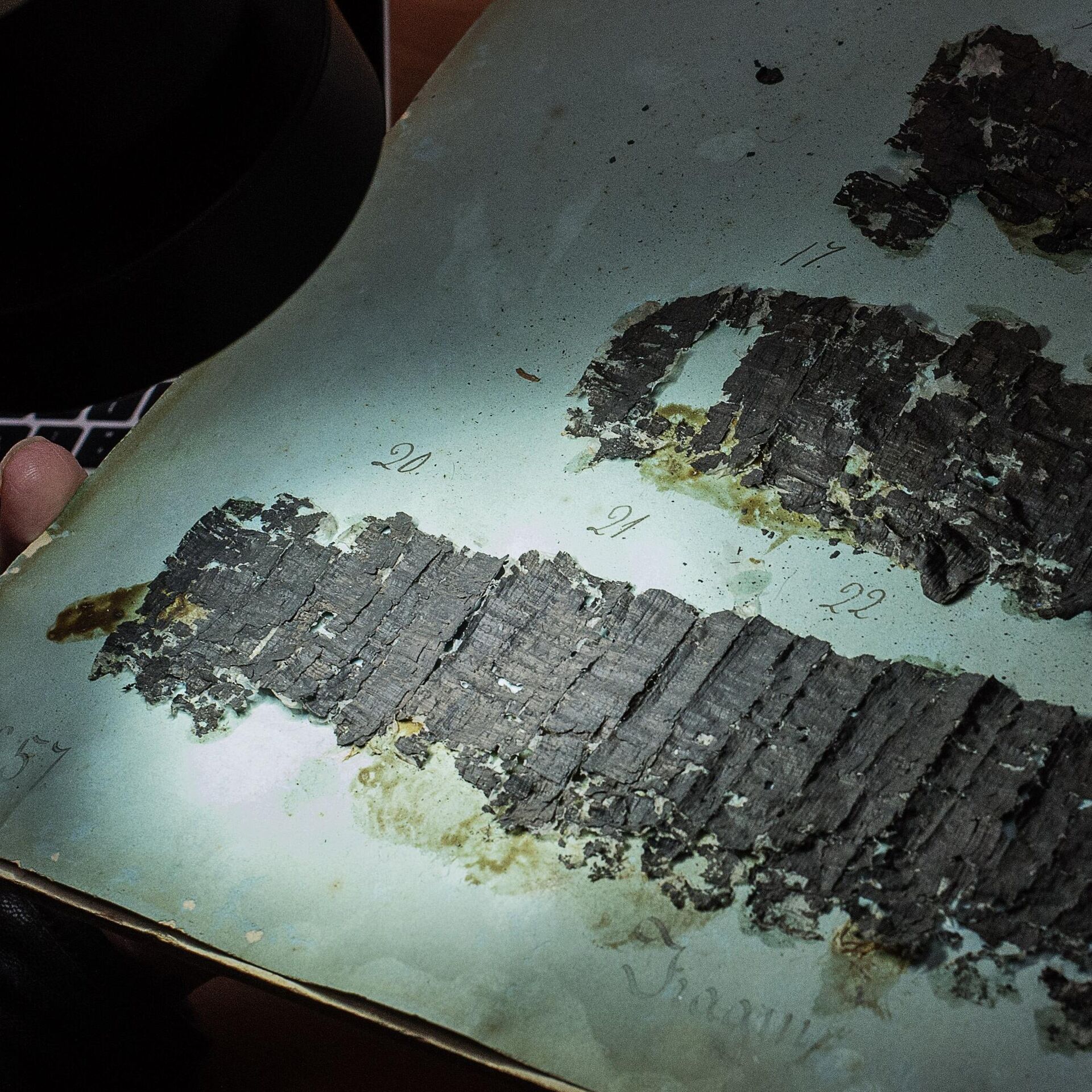 وقد تم العثور فيها على مجموعة كبيرة من المخطوطات، لكن المواد كانت متفحمة لدرجة أن الحبر الأسود أصبح غير قابل للقراءة، كما تحولت أوراق البردى إلى غبار عند محاولة فتحها.