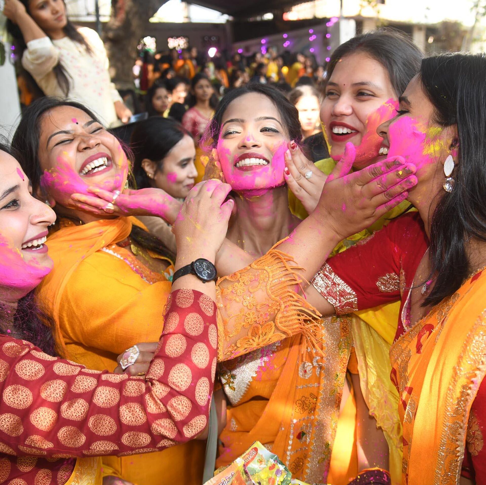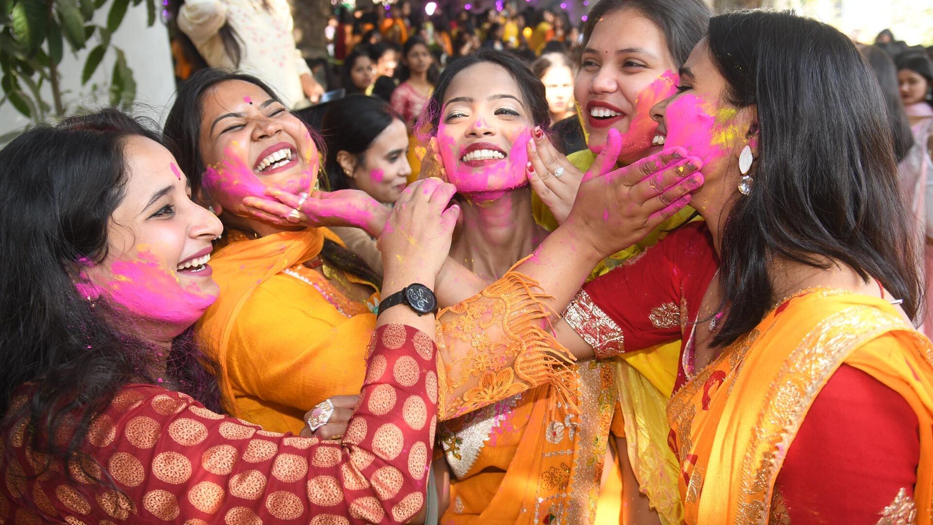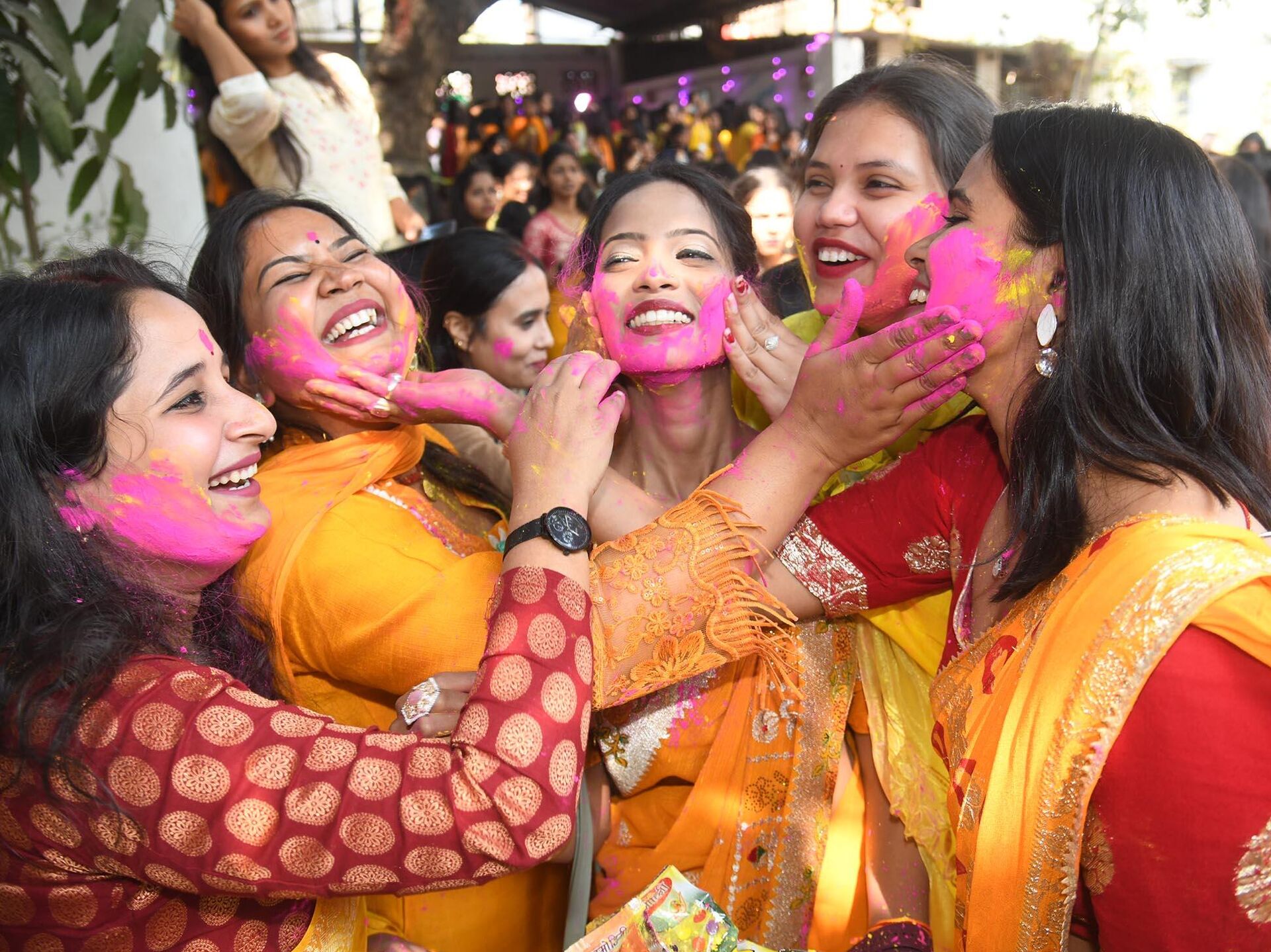 © Getty Images / Hindustan Times/Santosh Kumar طالبات يتابدلن التهاني بمناسبة مهرجان (Basant Panchmi) الذي يجسد الربيع في باتنا، الهند.