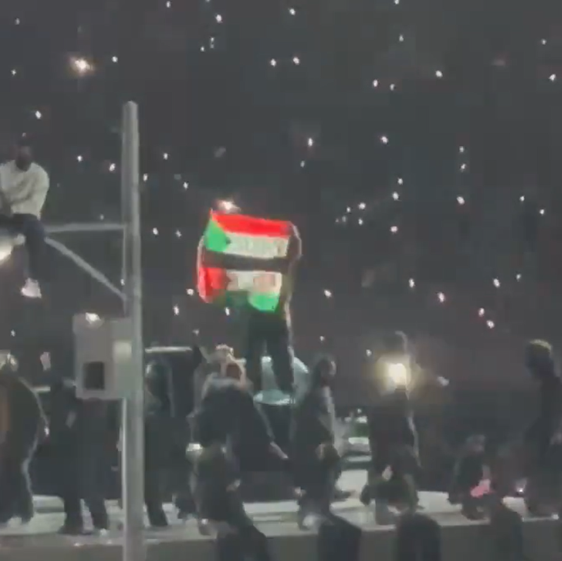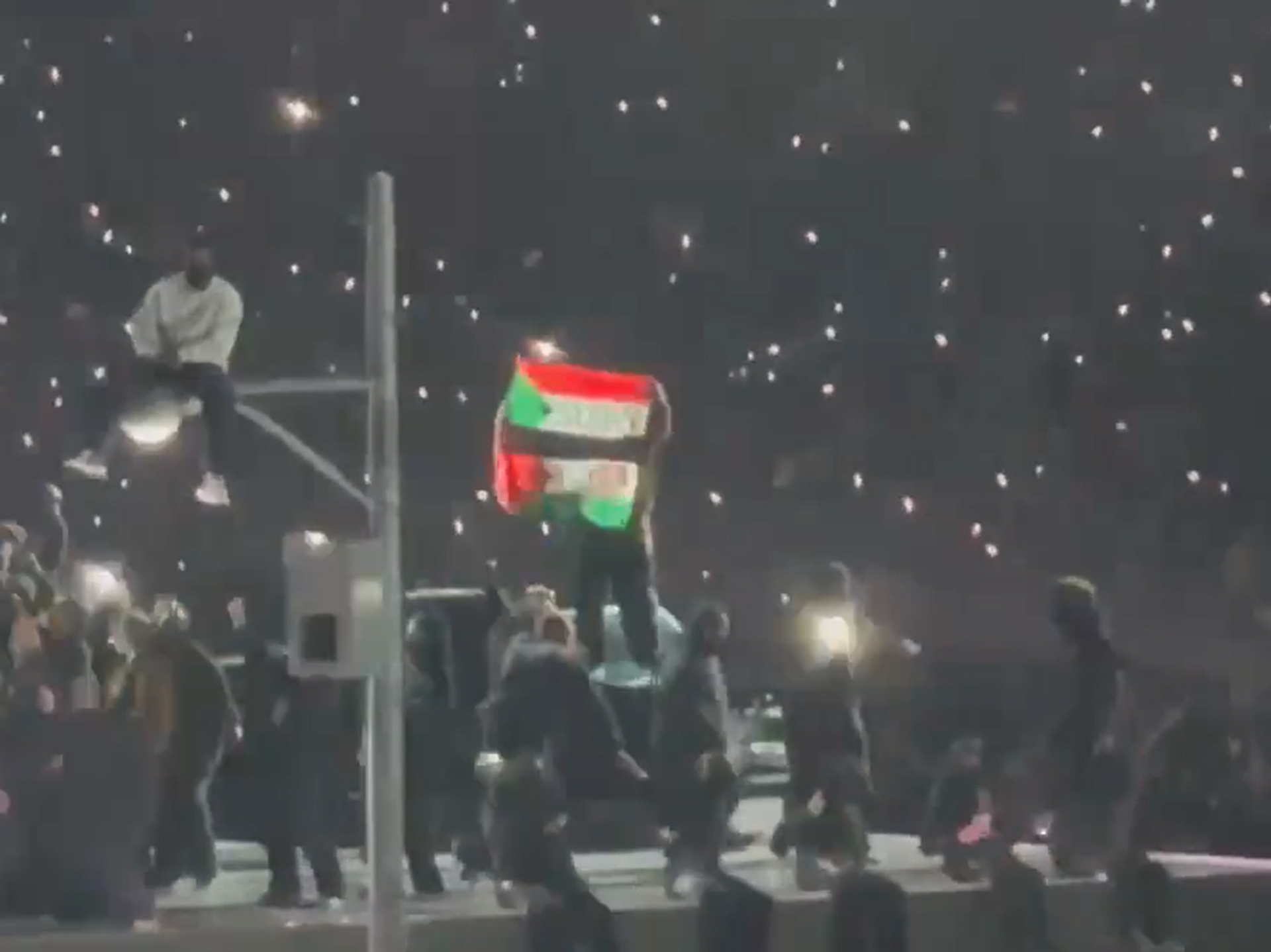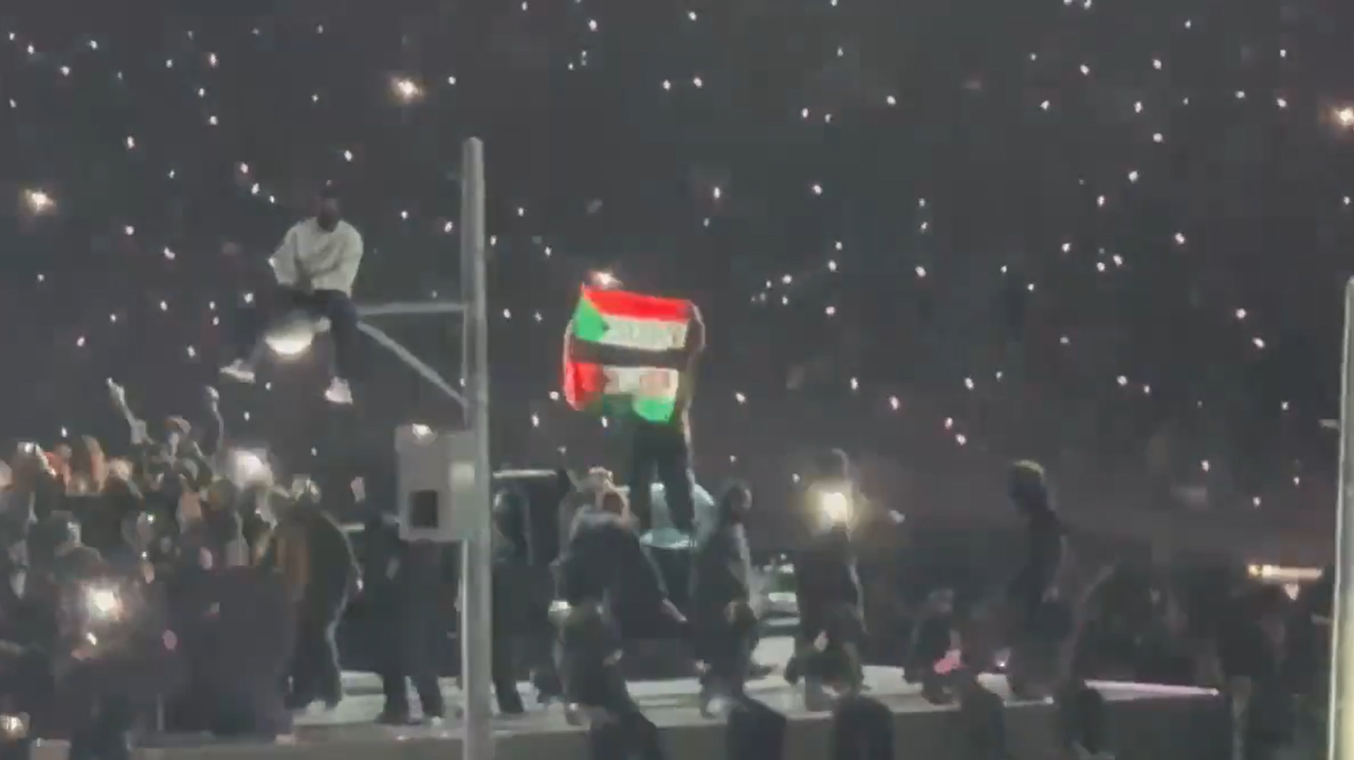 ويظهر الفيديو الذي تداوله رواد مواقع التواصل الاجتماعي، قيام أحد المحتجين برفع علمي السودان وفلسطين على خشبة المسرح أثناء أداء الفنان كيندريك لامار، ضمن مباراة السوبر بول التي جرت في نيو أورليانز.