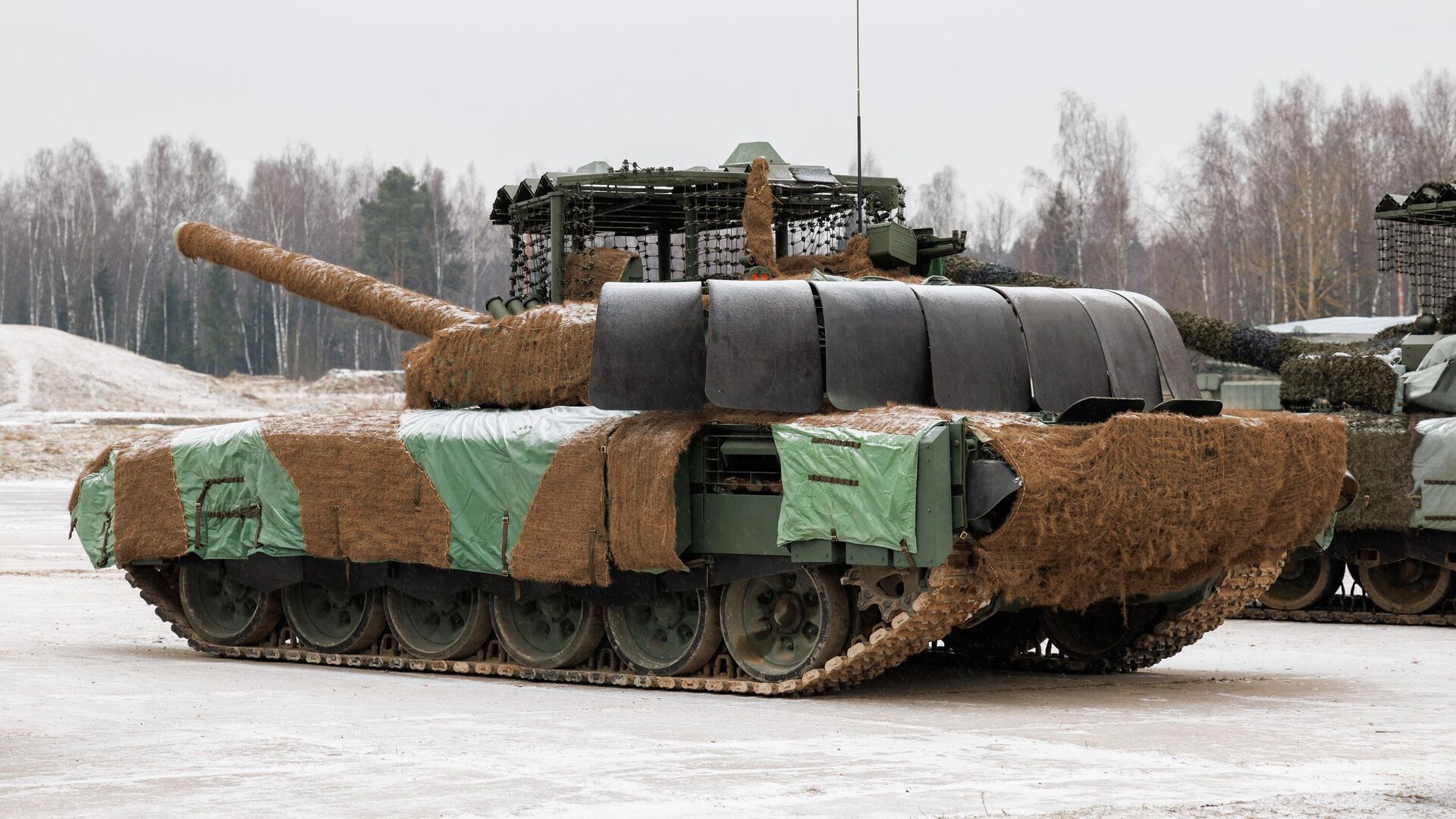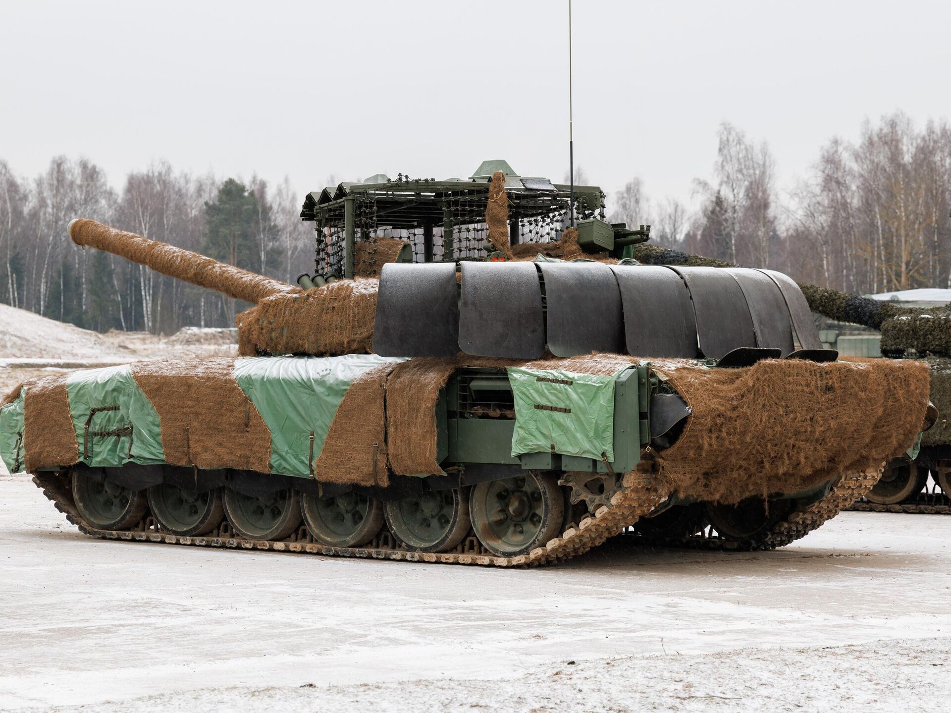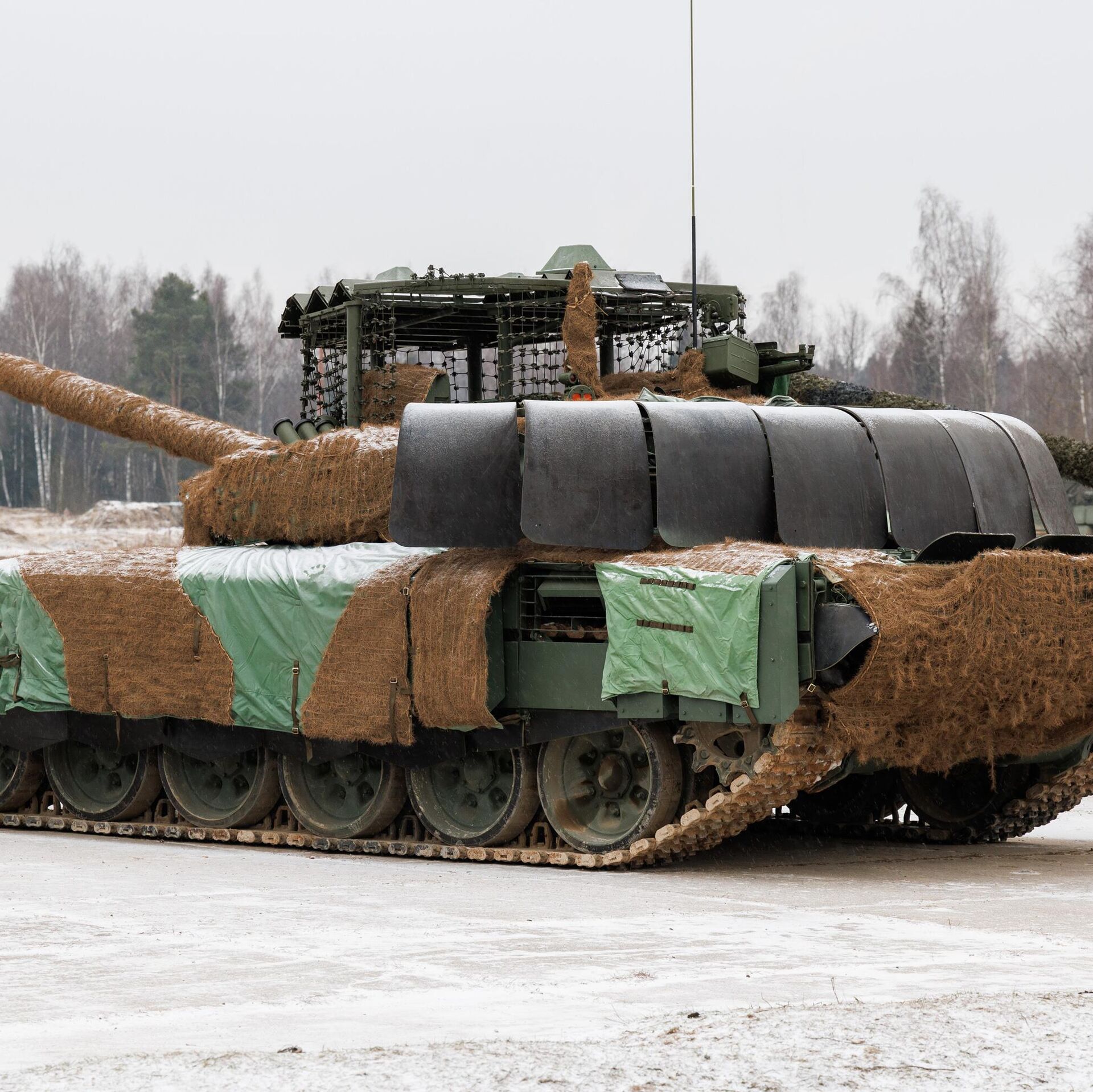 دبابة "تي 72 بي 3 إي" مزودة بشباك مضادة للألغام.