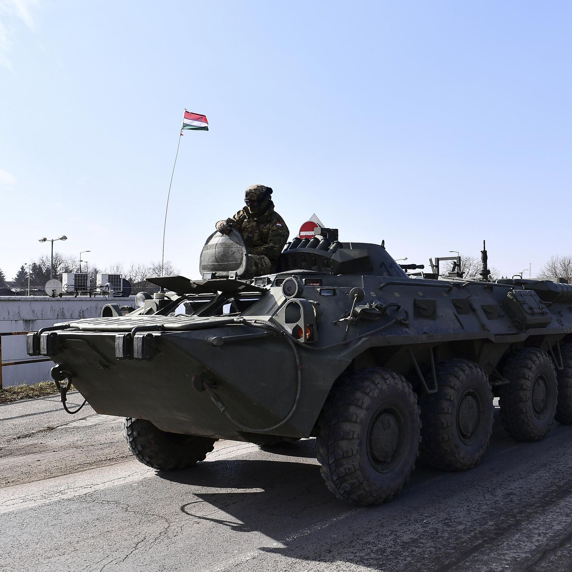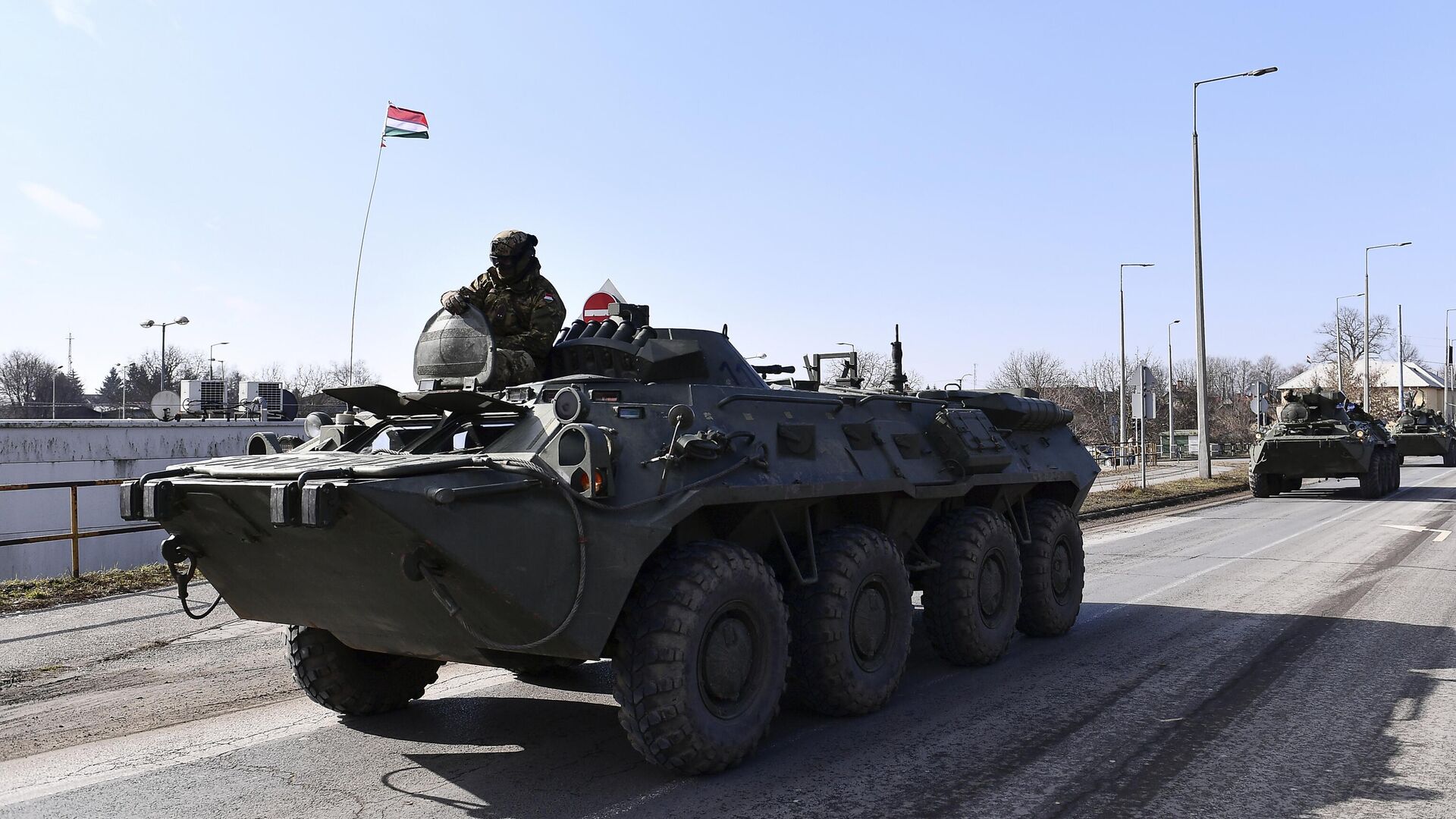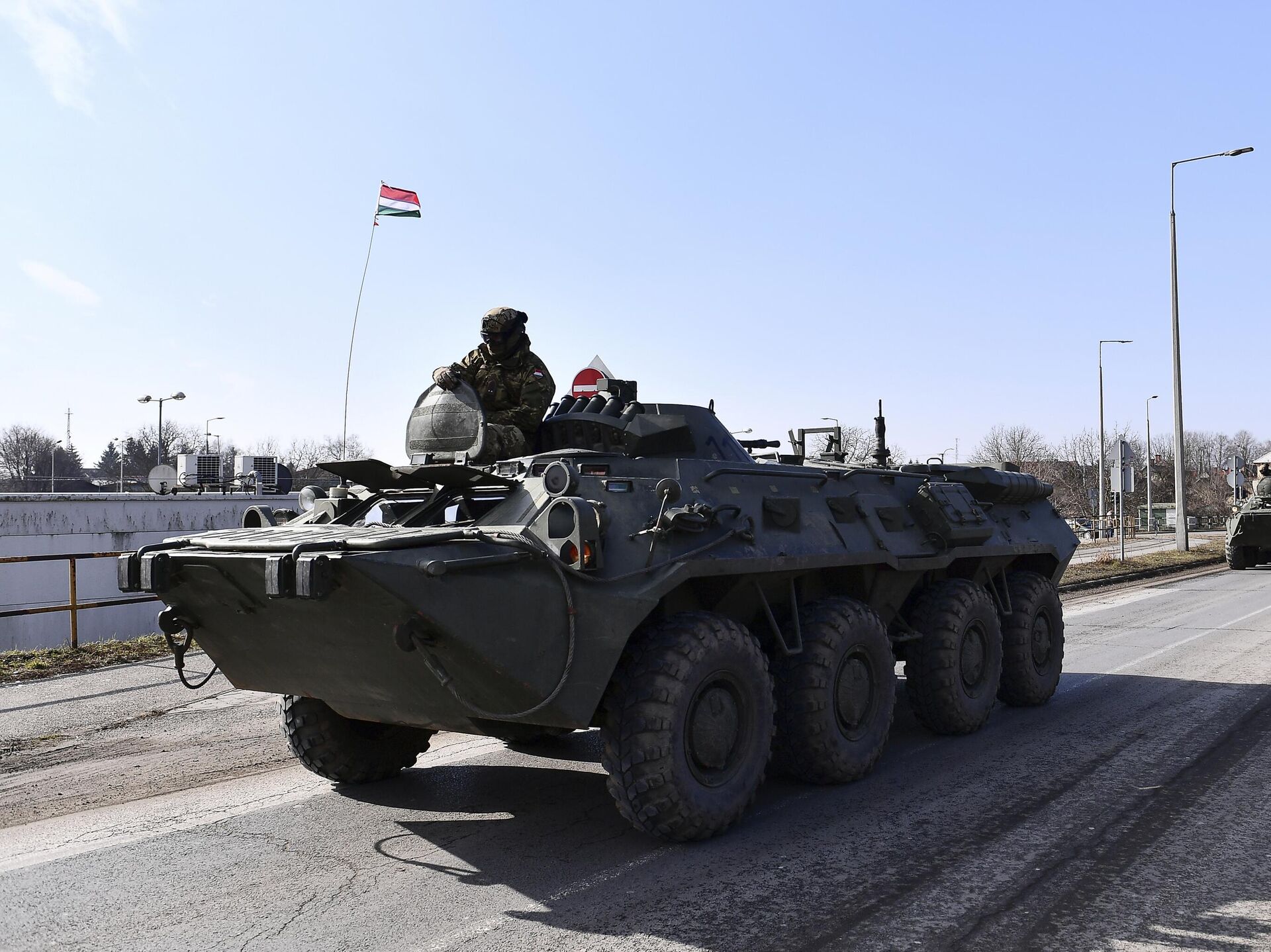 © AP Photo / Anna Szilagyiناقلات جنود مدرعة مجرية تظهر أثناء نشر الجيش لقواته بالقرب من الحدود المجرية الأوكرانية، في فاساروسناميني، المجر، الجمعة 25 فبراير 2022