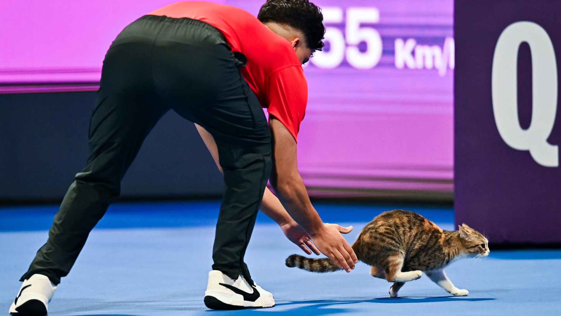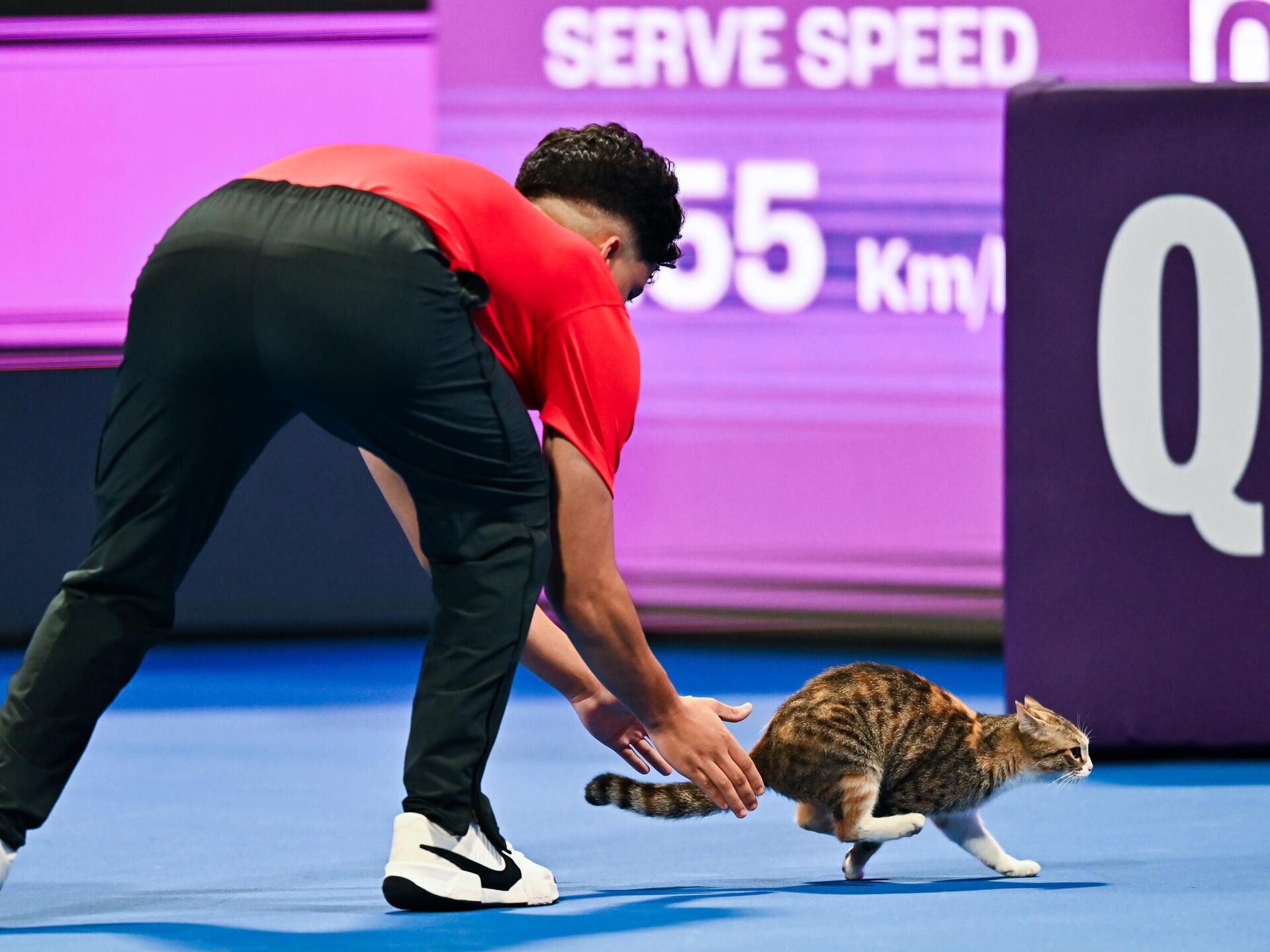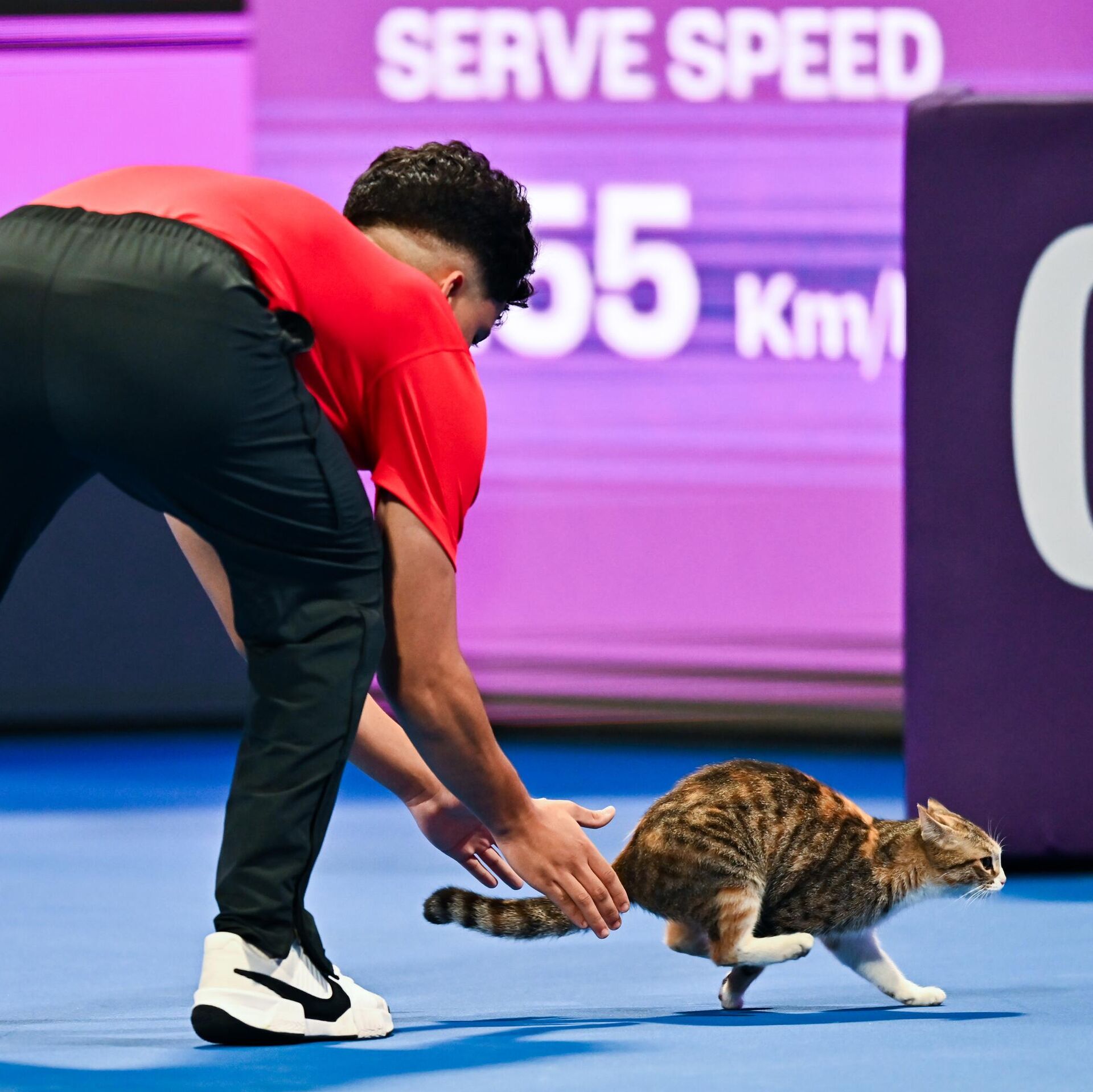 لقطة جميلة لقطة تجري في الملعب خلال مباراة بكرة المضرب بين التونسية أُنس جابر، والأمريكية صوفيا كينين، في بطولة قطر توتال إنيرجيز المفتوحة للتنس 2025.