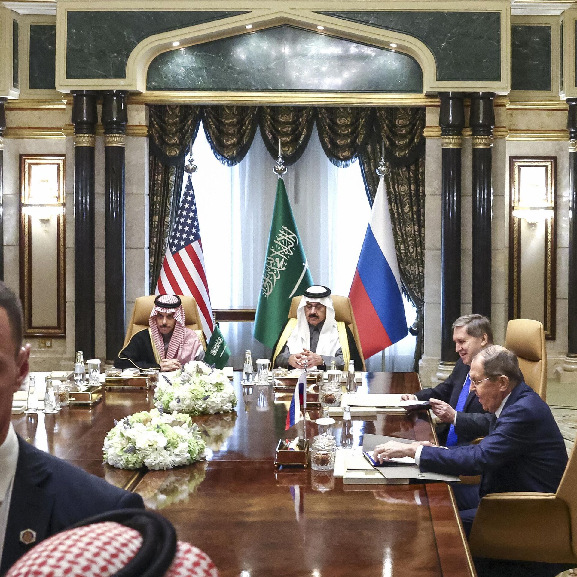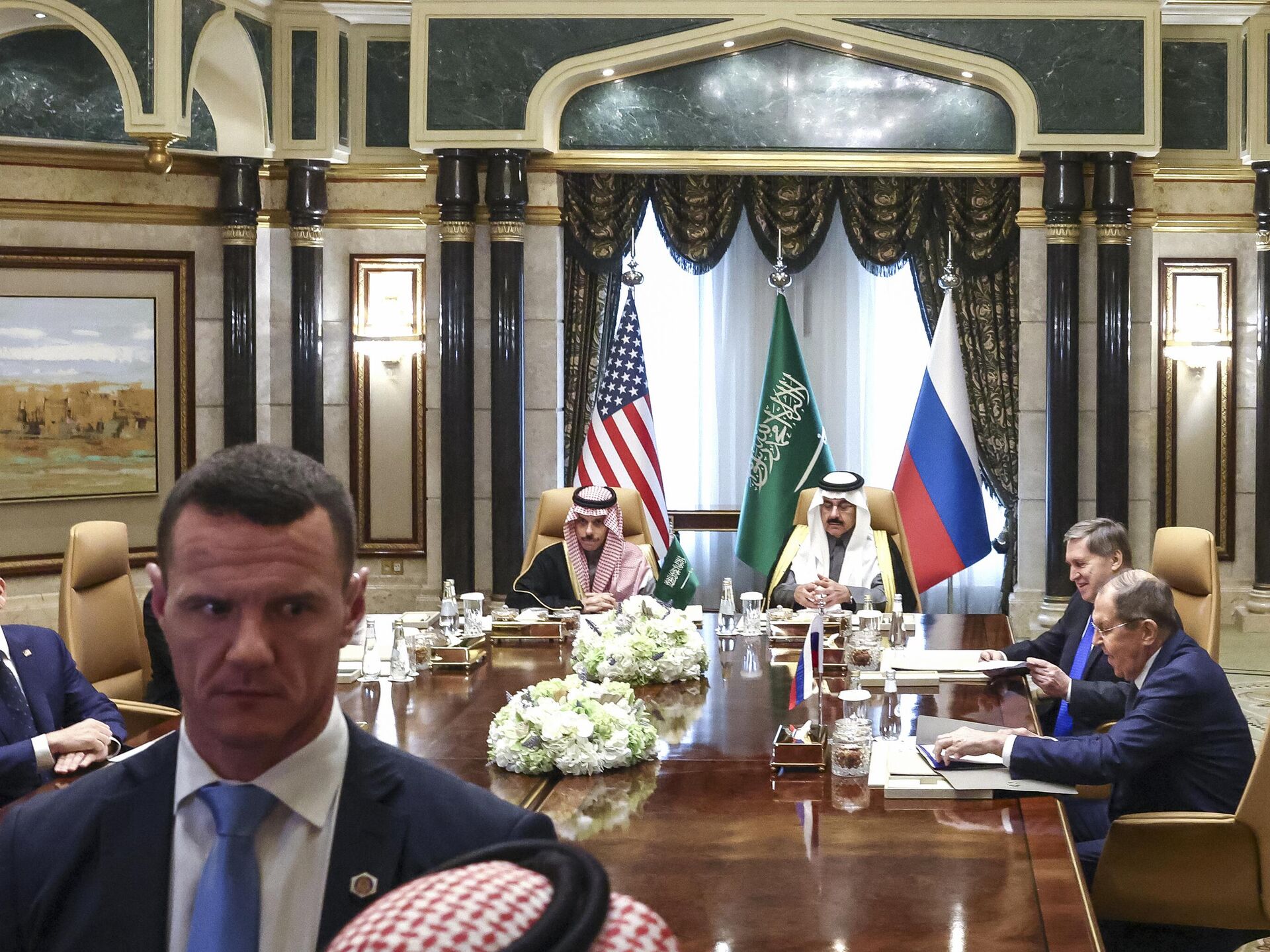 © AP Photo / Pool/Evelyn Hockstein وزير الخارجية الأمريكي ماركو روبيو (يسار الصورة)، ووزير الخارجية السعودي الأمير فيصل بن فرحان آل سعود ومستشار الأمن الوطني السعودي مساعد بن محمد العيبان، ووزير الخارجية الروسي سيرغي لافروف (يمين الصورة)، ويوري أوشاكوف مساعد الرئيس الروسي فلاديمير بوتين (الثاني من اليمين) يحضرون اجتماعهم في قصر الدرعية في العاصمة السعودية الرياض