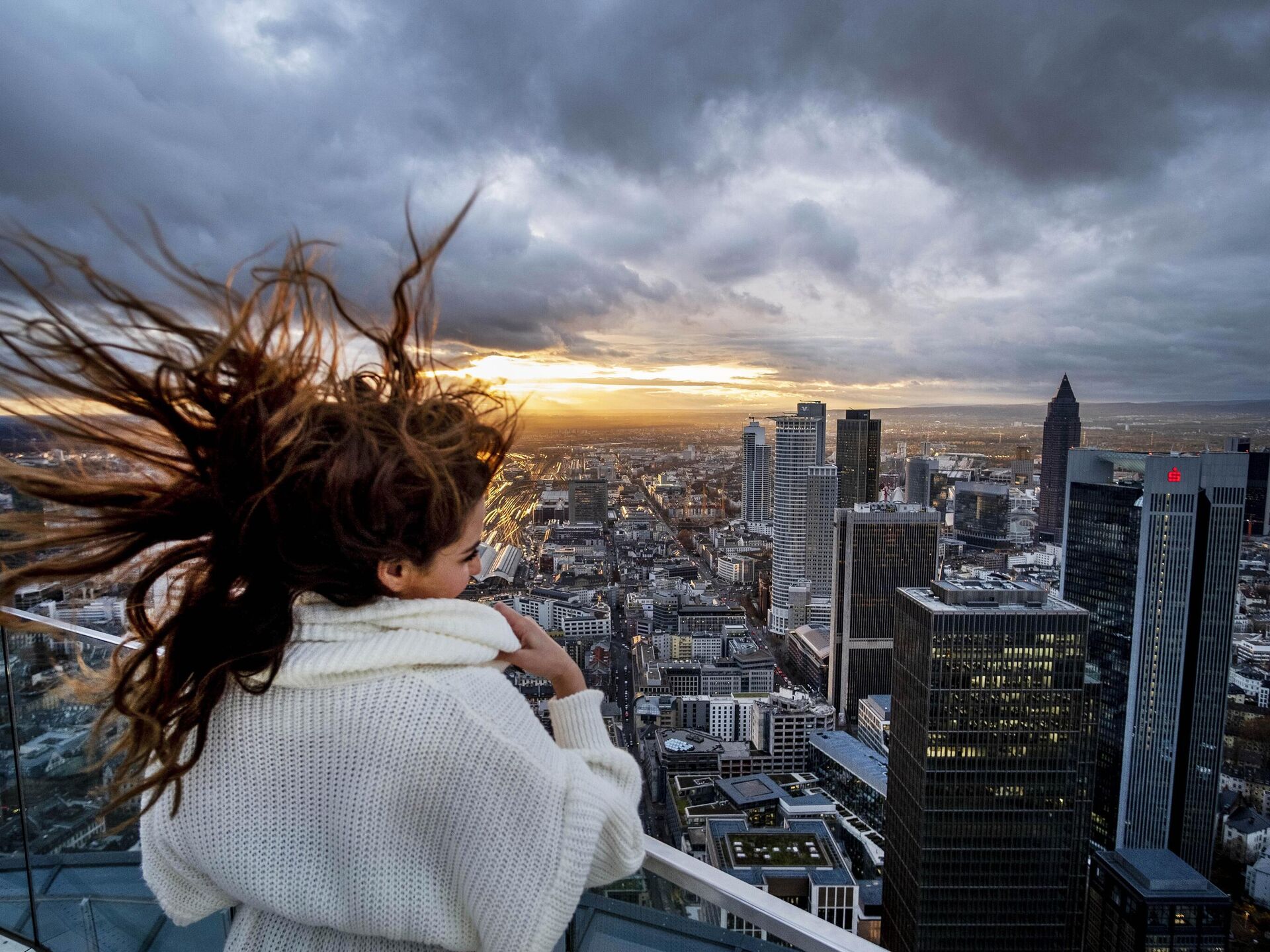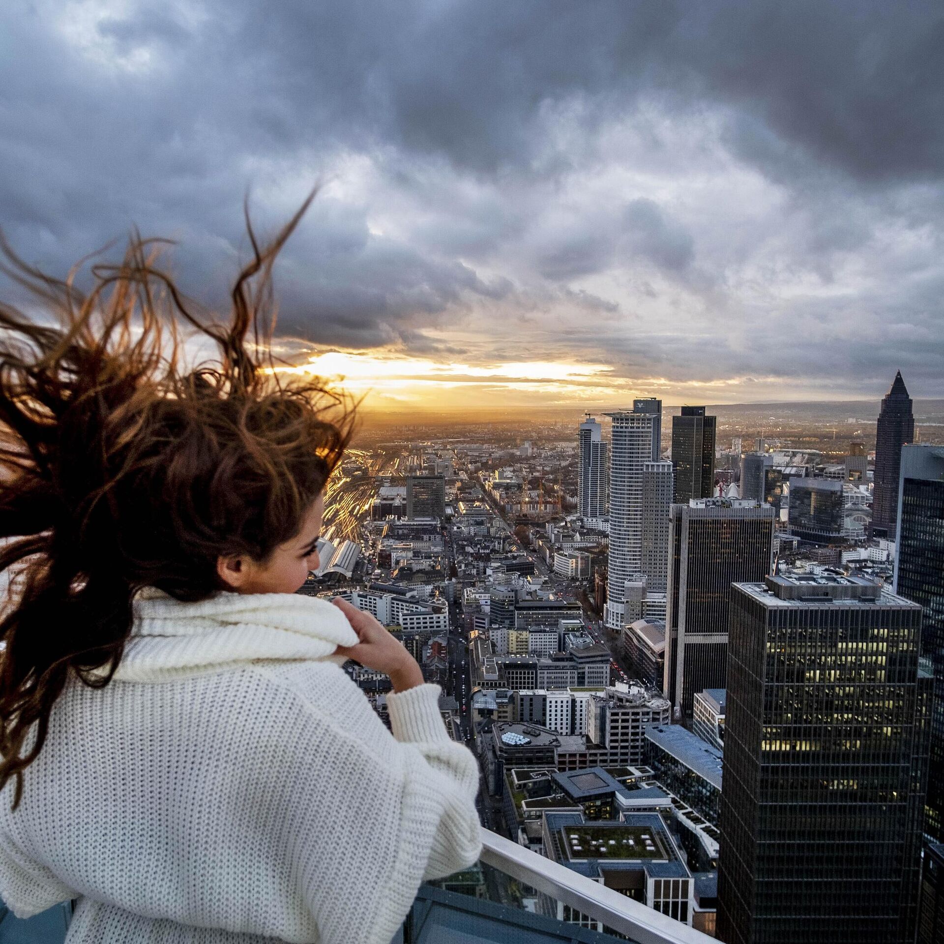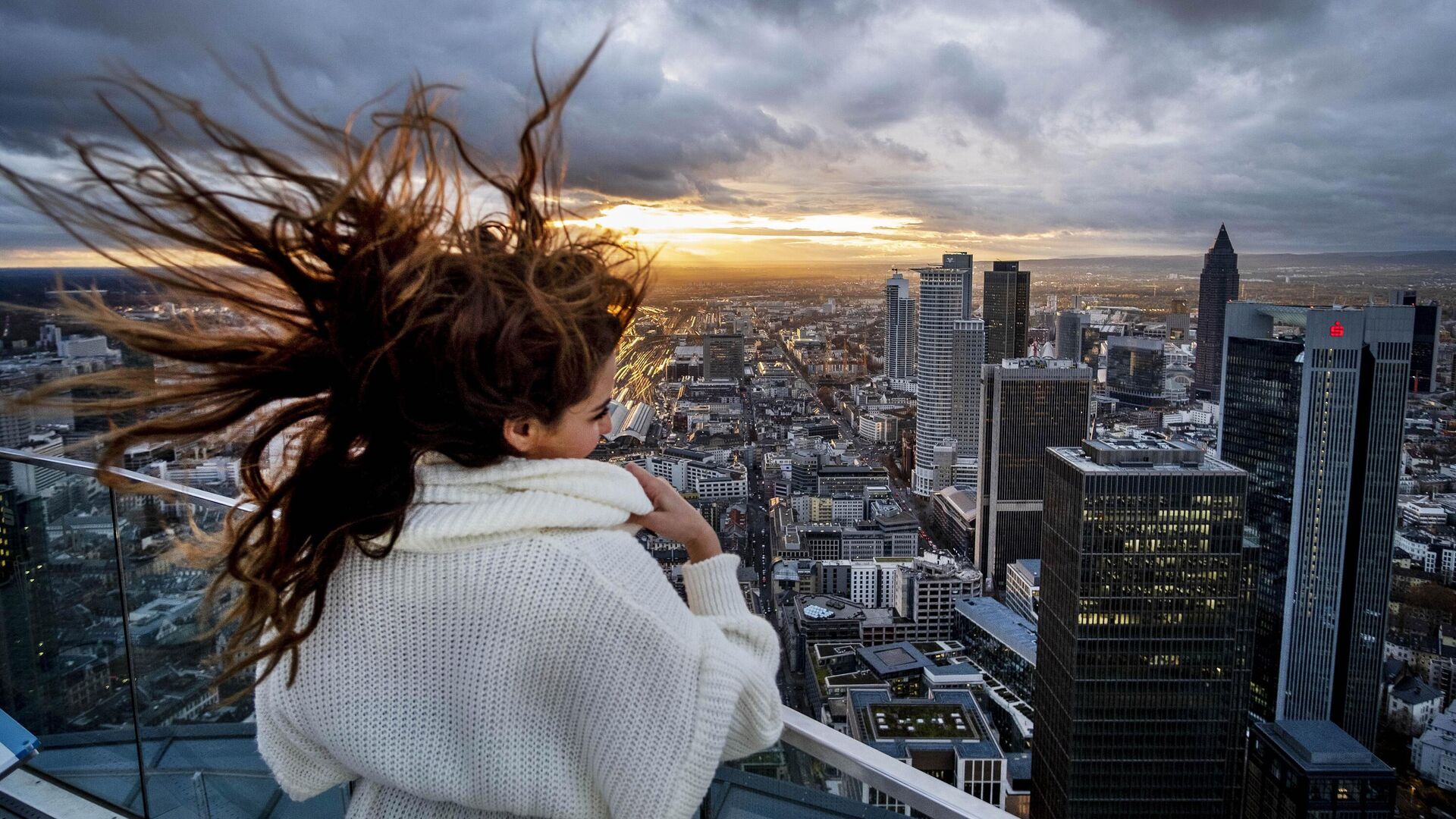 تطاير شعر سائحة فرنسية شابة مع غروب الشمس على منصة المشاهدة في "برج ماين"، فرانكفورت بألمانيا