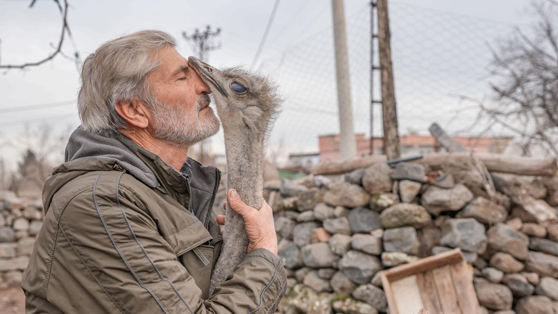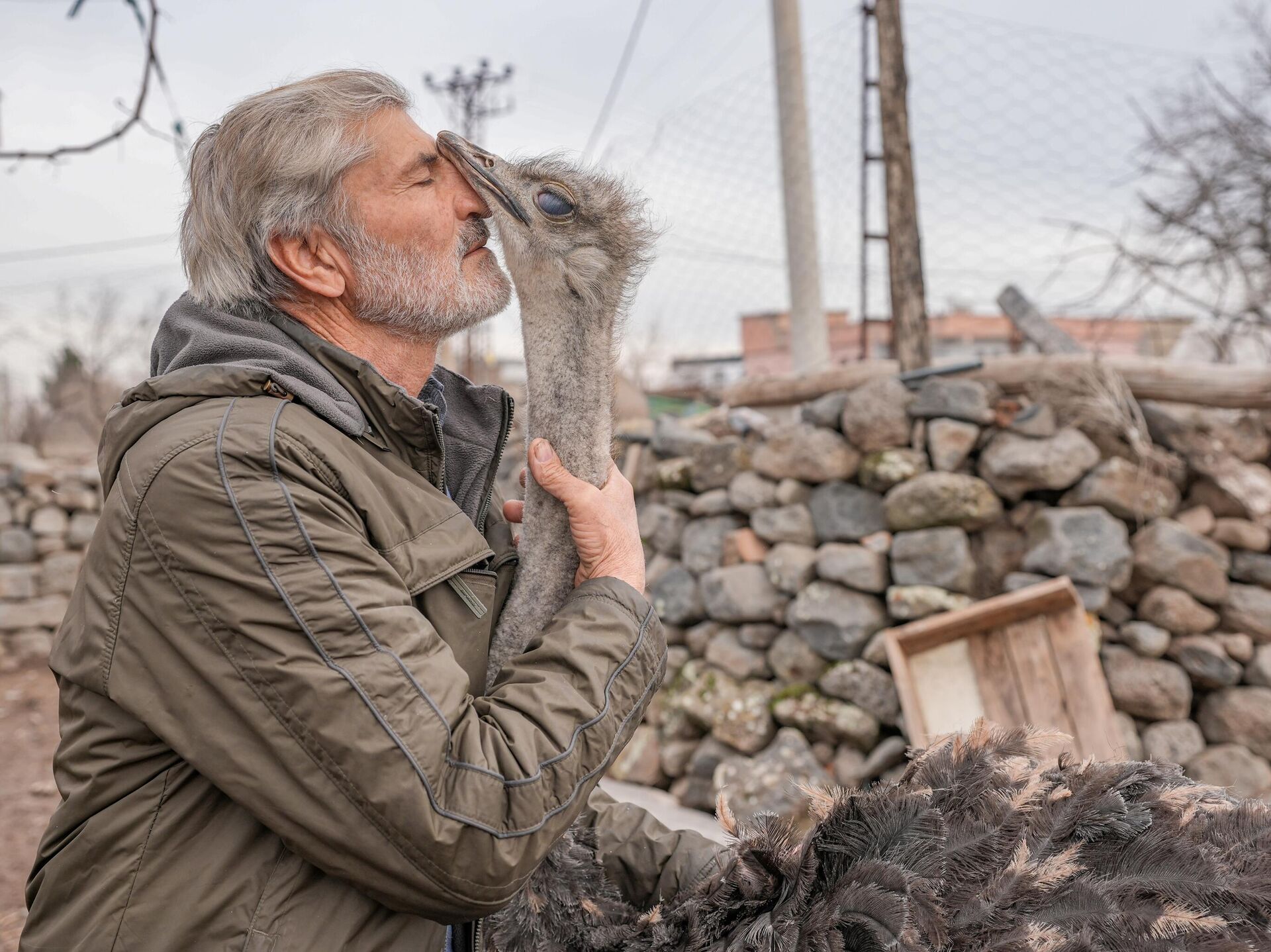 لقطة طريفة لرجل يداعب نعامة في منطقة سور في ديار بكر، تركيا.
