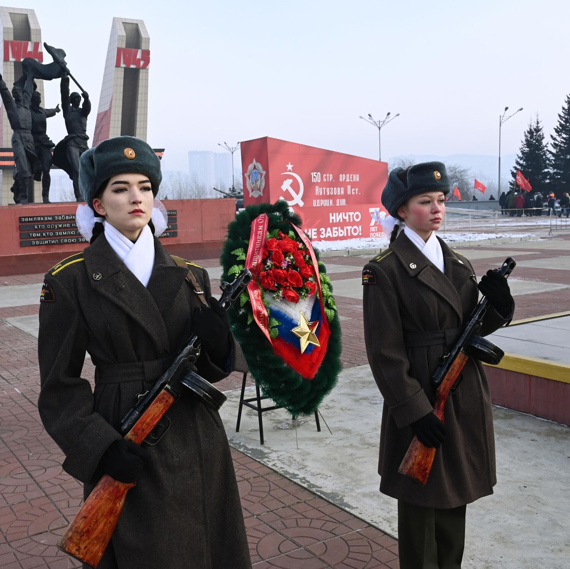 © Sputnik . Evgeny Yepanchintsev / الانتقال إلى بنك الصور مراسم وضع الزهور على نصب تذكاري في الاحتفال بيوم المدافع عن الوطن في تشيتا، روسيا مراسم وضع الزهور على نصب تذكاري في الاحتفال بيوم المدافع عن الوطن في تشيتا، روسيا