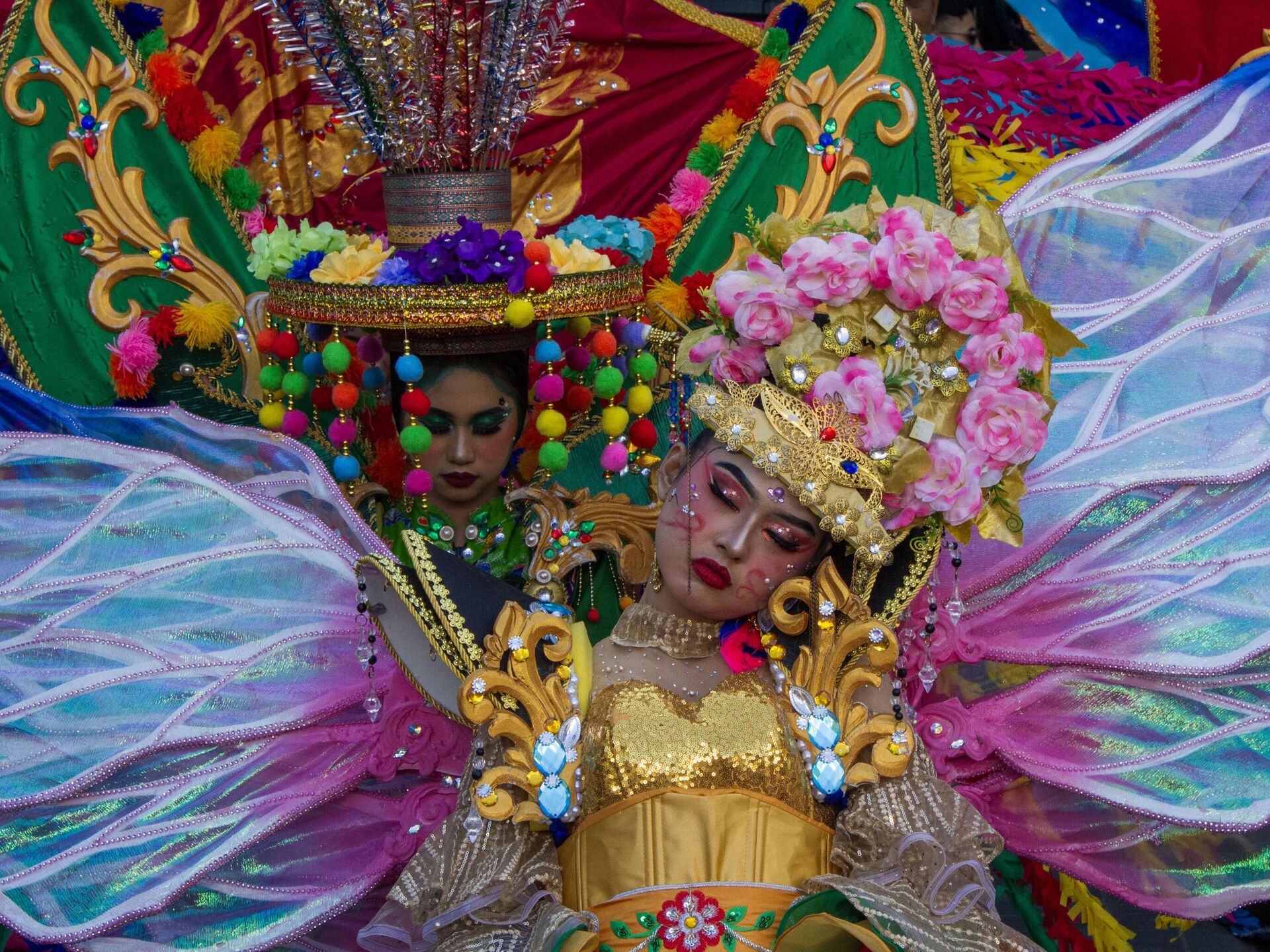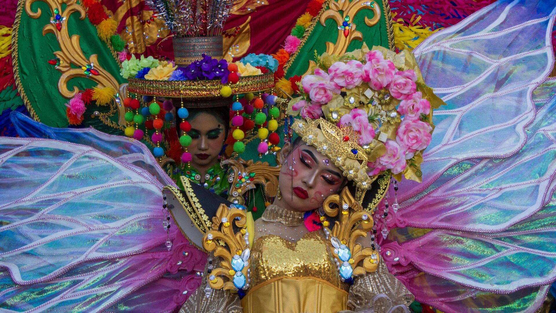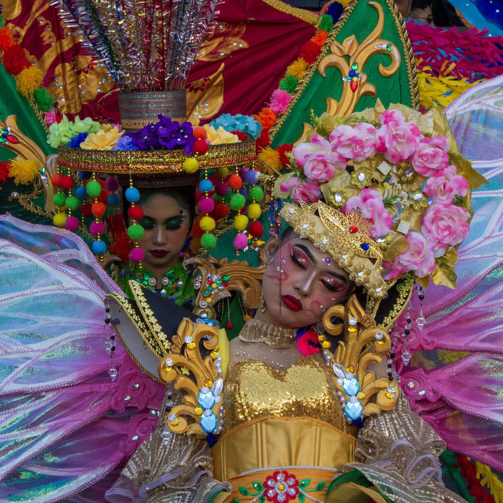 مشاركون يرتدون أزياء الكرنفال يأخذون قيلولة خلال كرنفال في باندونغ بإندونيسيا - سبوتنيك عربي
