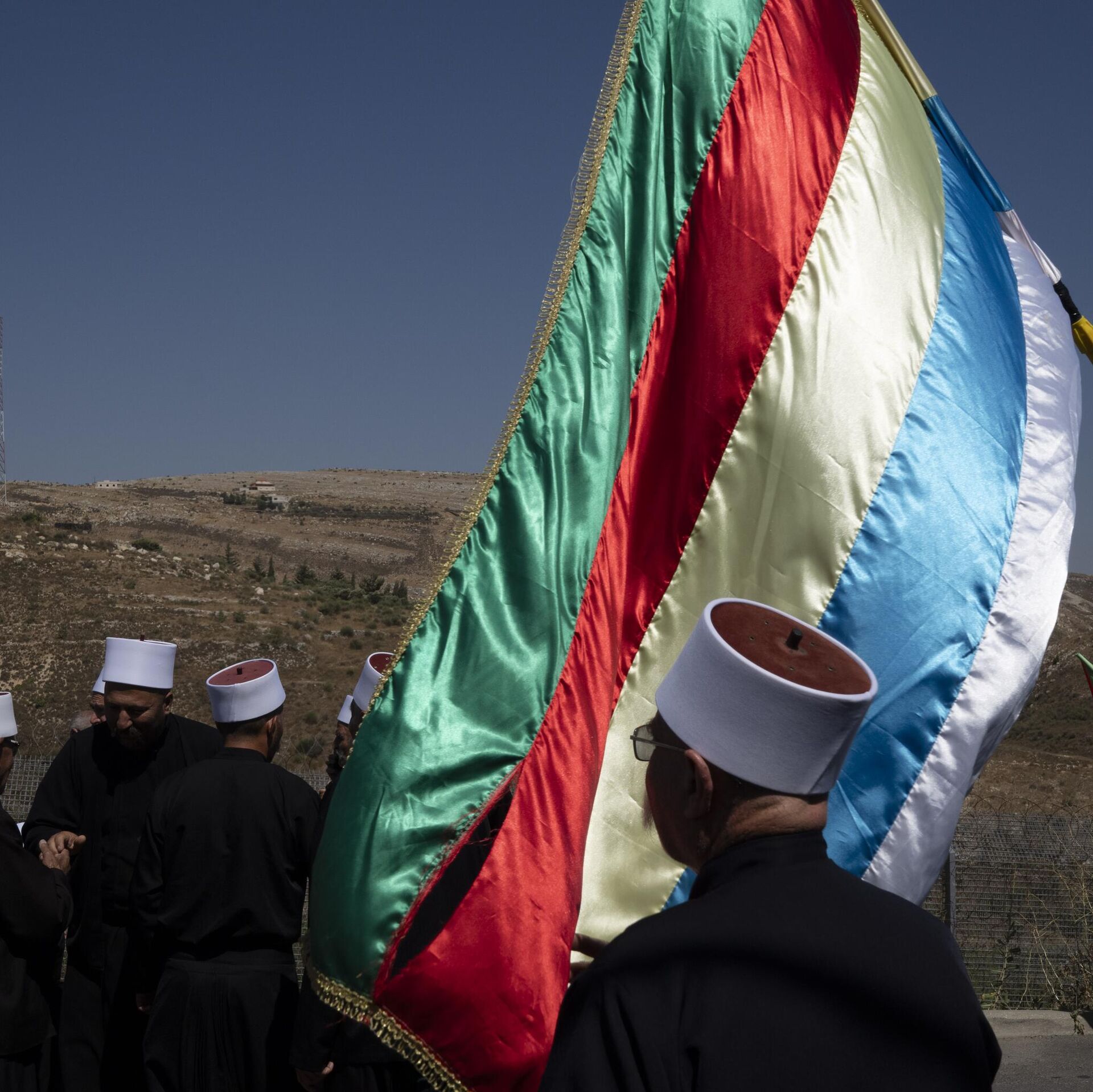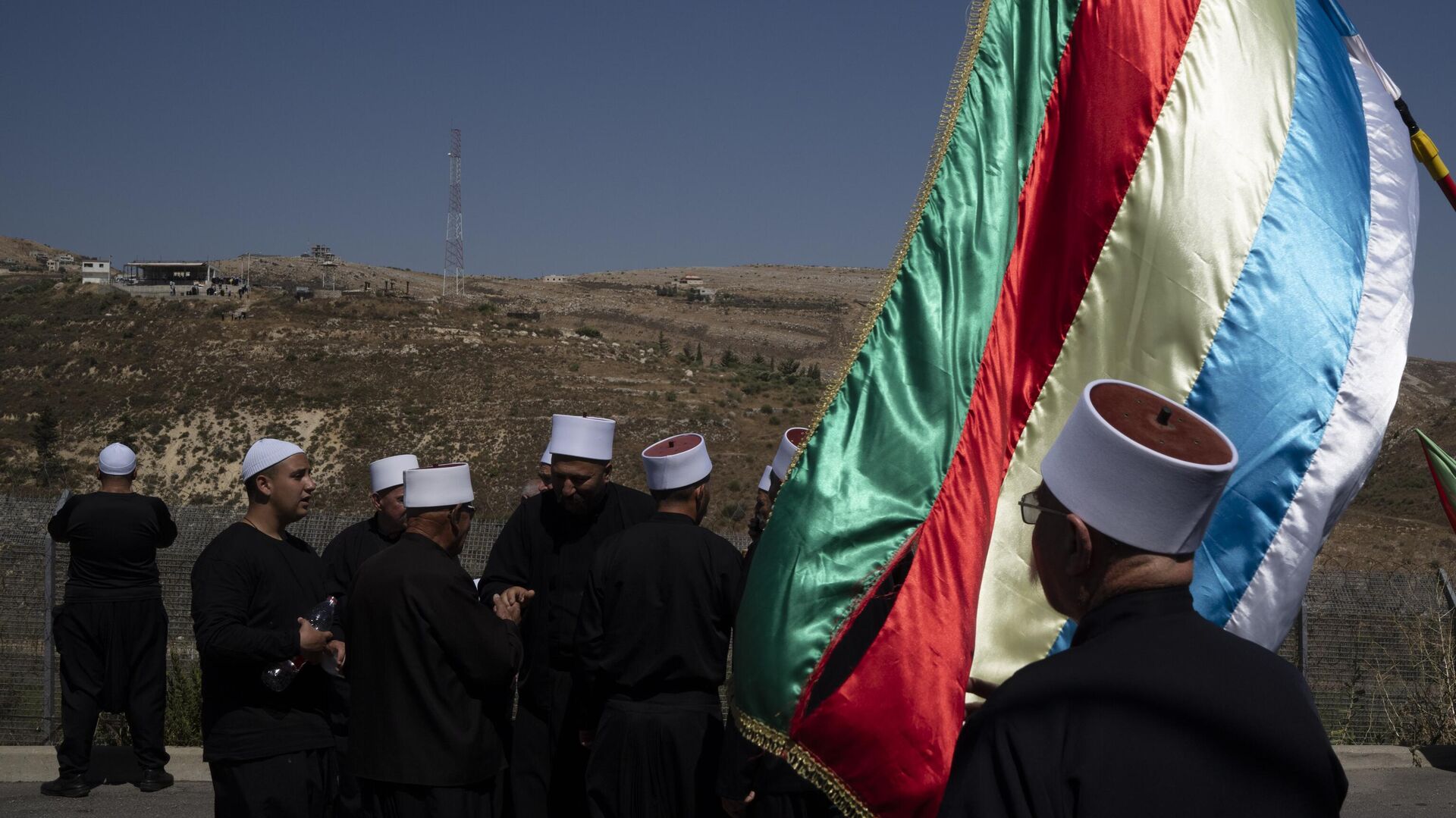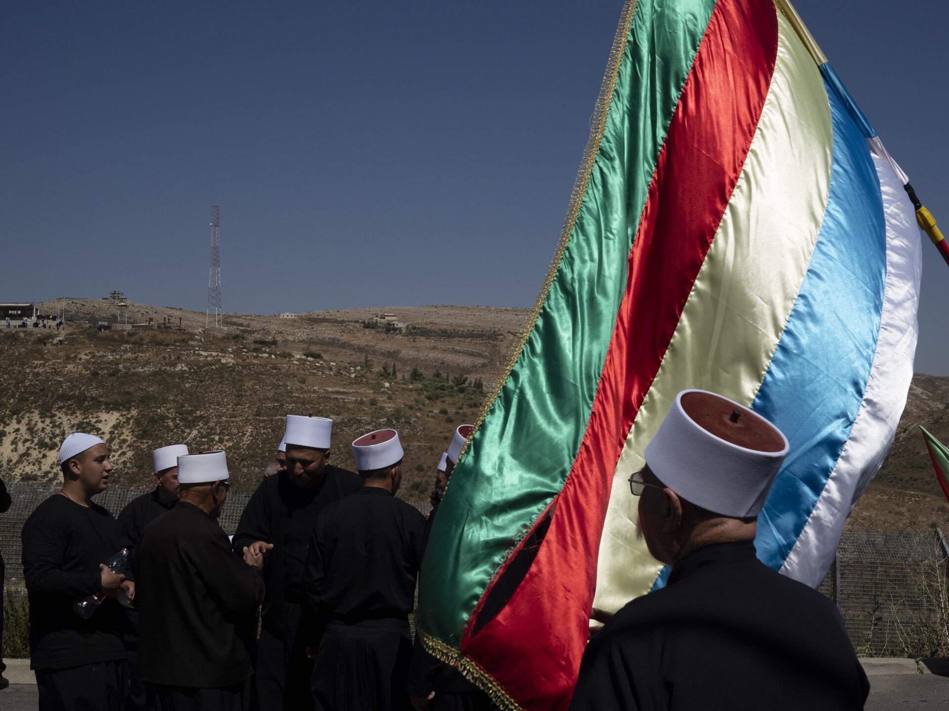 © AP Photo / Leo Correaيتجمع رجال الدين الدروز بعد بيان احتجاجًا على الاستخدام السياسي لمدينتهم ومقتل 12 طفلاً ومراهقًا في هجوم صاروخي، أمام المجتمع الدرزي على الجانب الآخر من الحدود مع سوريا