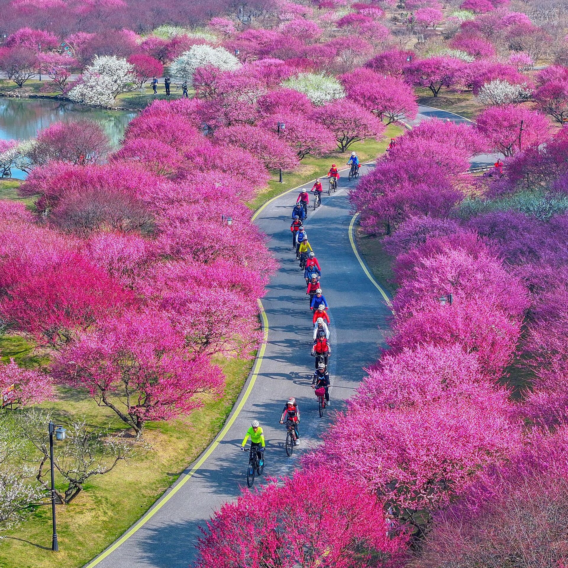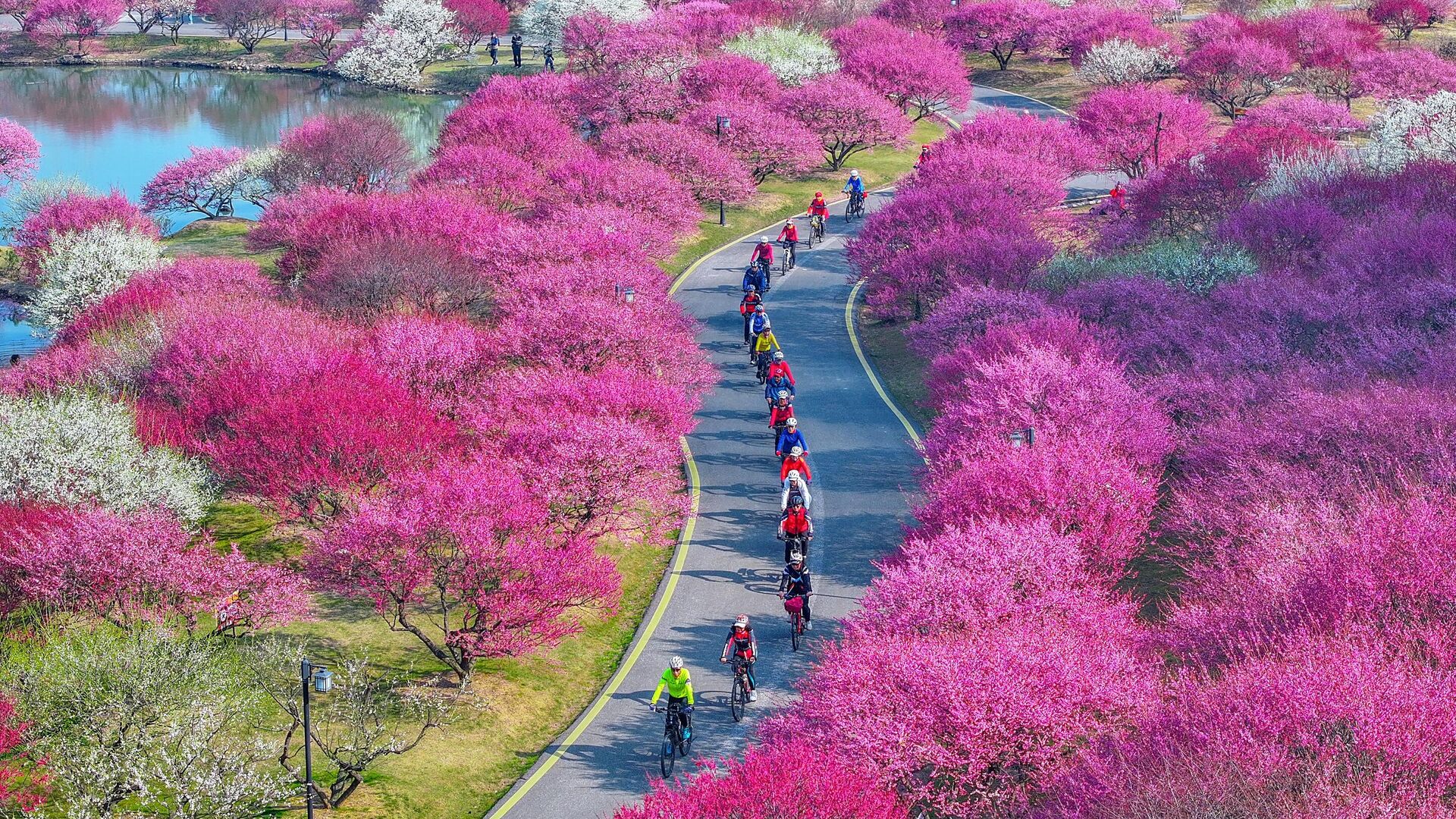 منظر جوي لعشاق ركوب الدراجات وهم يستمتعون بأزهار البرقوق في حديقة بونساي في بحيرة تاي في مقاطعة تشجيانغ في الصين