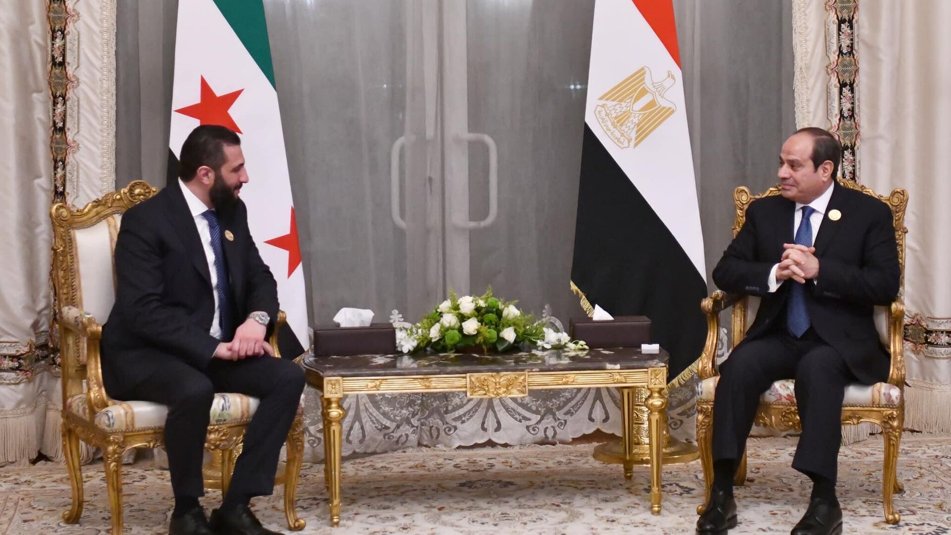 ونشرت وكالة الأنباء السورية (سانا)، صورا من لقاء جانبي جمع بين الرئيس السوري بالمرحلة الانتقالية، أحمد الشرع، والرئيس المصري، والذي أجري على