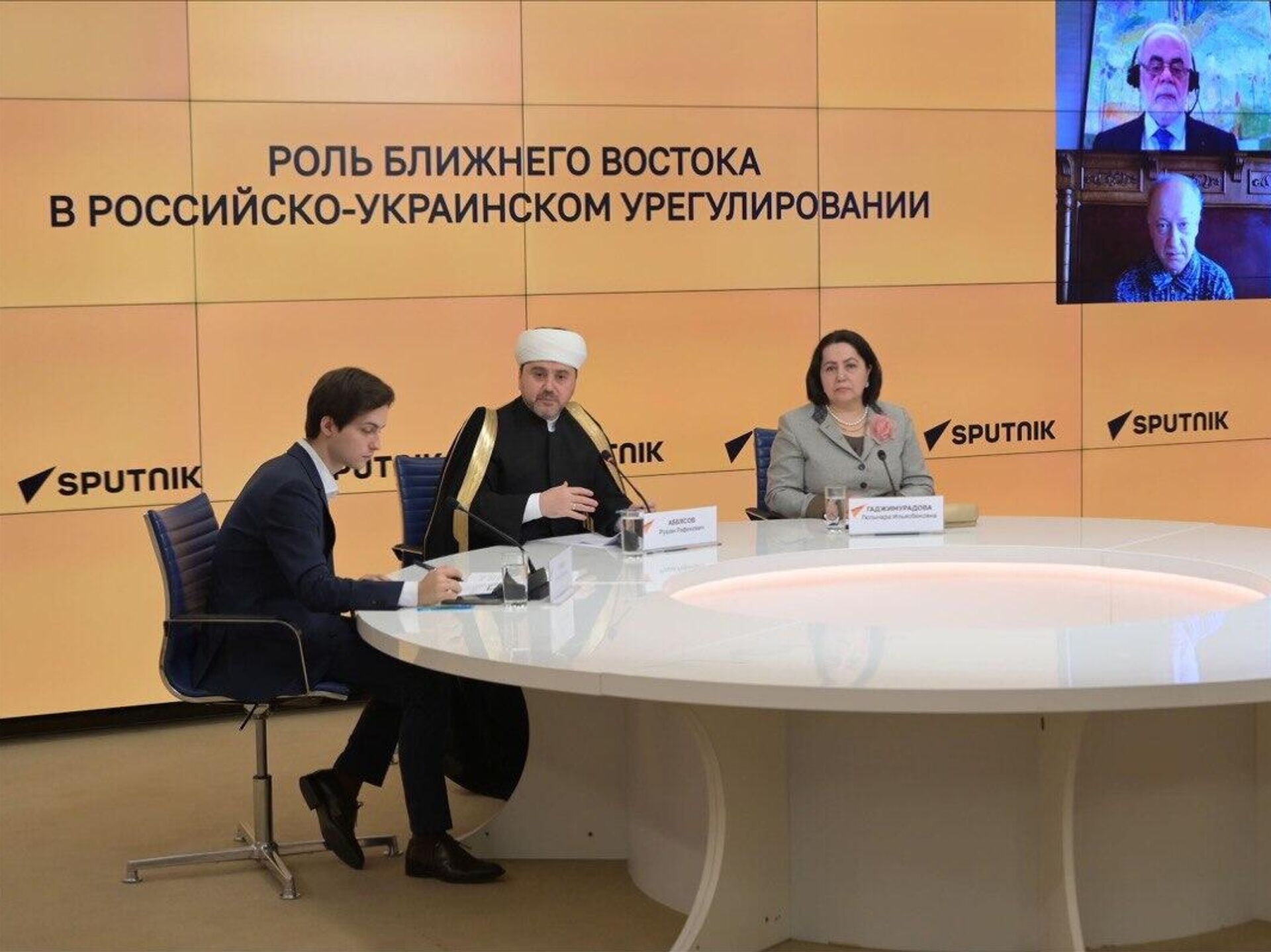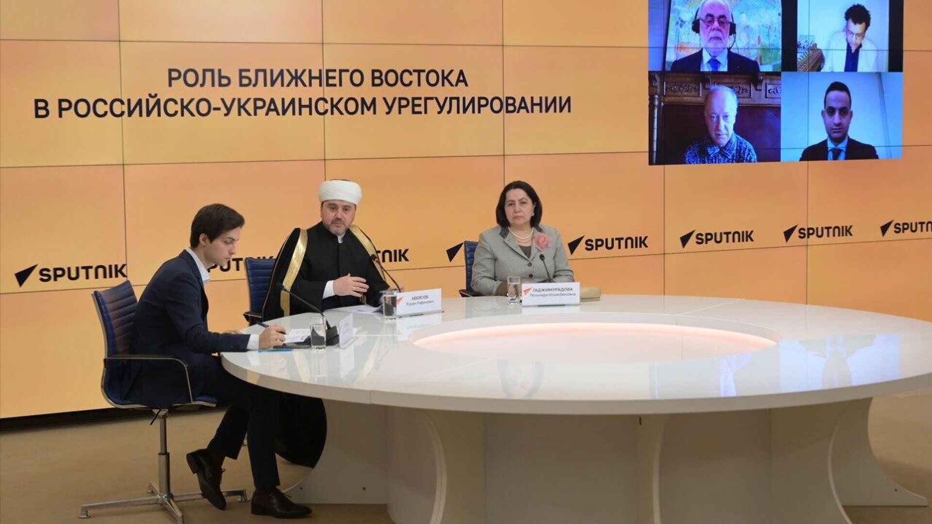 وحضر الندوة النائب الأول لرئيس مجلس شورى المفتين – نائب رئيس الإدارة الدينية لمسلمي روسيا الاتحادية، المفتي روشان عباسوف، والمدير العلمي للمجلس الروسي للشؤون الدولية السيد أندريه كورتونوف، ورئيسة قسم السياسة الديموغرافية والهجرة في معهد موسكو الحكومي للعلاقات الدولية التابع لوزارة الخارجية الروسية السيدة غيولنارا حجي مرادوفا، ورئيس قسم الاستشارات للشؤون الطبية في مجلس وزراء مصر السيد أحمد محمد علي السيد، ومستشار الرئيس اللبناني السابق السيد أمل أبو زيد، ورئيس مركز آسيا للدراسات والترجمة، عضو مجلس تطوير البحوث في مجال العلوم الاجتماعية في أفريقيا السيد أحمد مصطفى.في مستهل الحديث، أكّد المفتي روشان عباسوف، نائب رئيس الإدارة الدينية لمسلمي روسيا الاتحادية، أن بلدان الشرق الأوسط كالمملكة العربية السعودية والإمارات العربية المتحدة ودولة قطر وغيرها، تلعب دوراً ذا أهمية كبيرة في الأحداث العالمية، بما في ذلك تسوية الصراع الروسي الأوكراني، وأشار في هذا الشأن قائلاً:من جانبه، أكّد السيد أمل أبو زيد الذي مثّل وجهة النظر اللبنانية، أن العلاقات بين روسيا والولايات المتحدة لها تأثير قوي للغاية على الوضع في المنطقة العربية برمّتها، ونوّه في هذا الخصوص قائلاً: "يلتقي المسؤولون من روسيا الاتحادية والولايات المتحدة في تركيا وفي المملكة العربية السعودية بهدف التوصل إلى توافق ليس فقط بشأن قضايا حل الصراع في أوكرانيا، ولكن أيضًا بشأن عدد من القضايا المهمة الأخرى، على سبيل المثال، القضية الفلسطينية في الشرق الأوسط. وتظهر اللقاءات أن الصراعات الإقليمية ودور سورية في الساحة العالمية هي في المستقبل أيضاً في صميم عملية التفاوض".في هذا السياق، بحث الخبراء تأثير الصراع على القضايا الرئيسية في الشرق الأوسط. حيث أشار السيد أحمد محمد علي السيد خلال هذا النقاش، إلى أن التبعات الاقتصادية للمواجهة الروسية الأوكرانية أثّرت بالفعل على التبادل التجاري والأمن الغذائي في العالم العربي، مؤكداً أن "روسيا وأوكرانيا هما المورّدان الرئيسيان للقمح والحبوب إلى دول الشرق. لذلك، بطبيعة الحال، كان للعملية العسكرية الخاصة تأثير كبير في هذا المجال". بالاضافة إلى ذلك نوّه الباحث بأن "الشّرق الأوسط لعب بالفعل دوراً كبيراً في تسوية الأزمة الروسية الأوكرانية في عدد من المجالات، وفي مقدمتها قضية تبادل الأسرى، التي تم تنفيذها منذ البداية وتستمر حتى يومنا هذا بمشاركة فعّالة من الدول العربية".أما السيد أحمد مصطفى فقد أوضح سبب اختيار مدينة الرّياض مكاناً للقاء الذي عقد مؤخّراً بشأن التسوية الروسية الأوكرانية قائلاً: "تم اختيار المملكة العربية السّعودية كمكان للمفاوضات المباشرة بين روسيا والولايات المتحدة لأنها تتمتّع بعلاقات جيدة مع كلا البلدين، وكذلك الدور الجيوسياسي والاقتصادي للبلاد في الآونة الأخيرة مهم للغاية ليس فقط في الشؤون الإقليمية ولكن أيضا في الشؤون الدولية".يشار إلى أن النقاش قد جرى في الأيام الأولى من شهر رمضان المبارك الذي بدأ في الأول من شهر مارس/ آذار. وهذا الشهر الفضيل المليء بالتقاليد الروحية والثقافية يسهم في تعزيز التفاهم المتبادل بين الشعوب. في تأكيد على أن روسيا وبلدان الشرق الأوسط يواصلون الحفاظ على العلاقات العريقة التي تعود لقرون طويلة من الزمن، والتي تقوم على أساس الاحترام المتبادل والرغبة في الحوار.