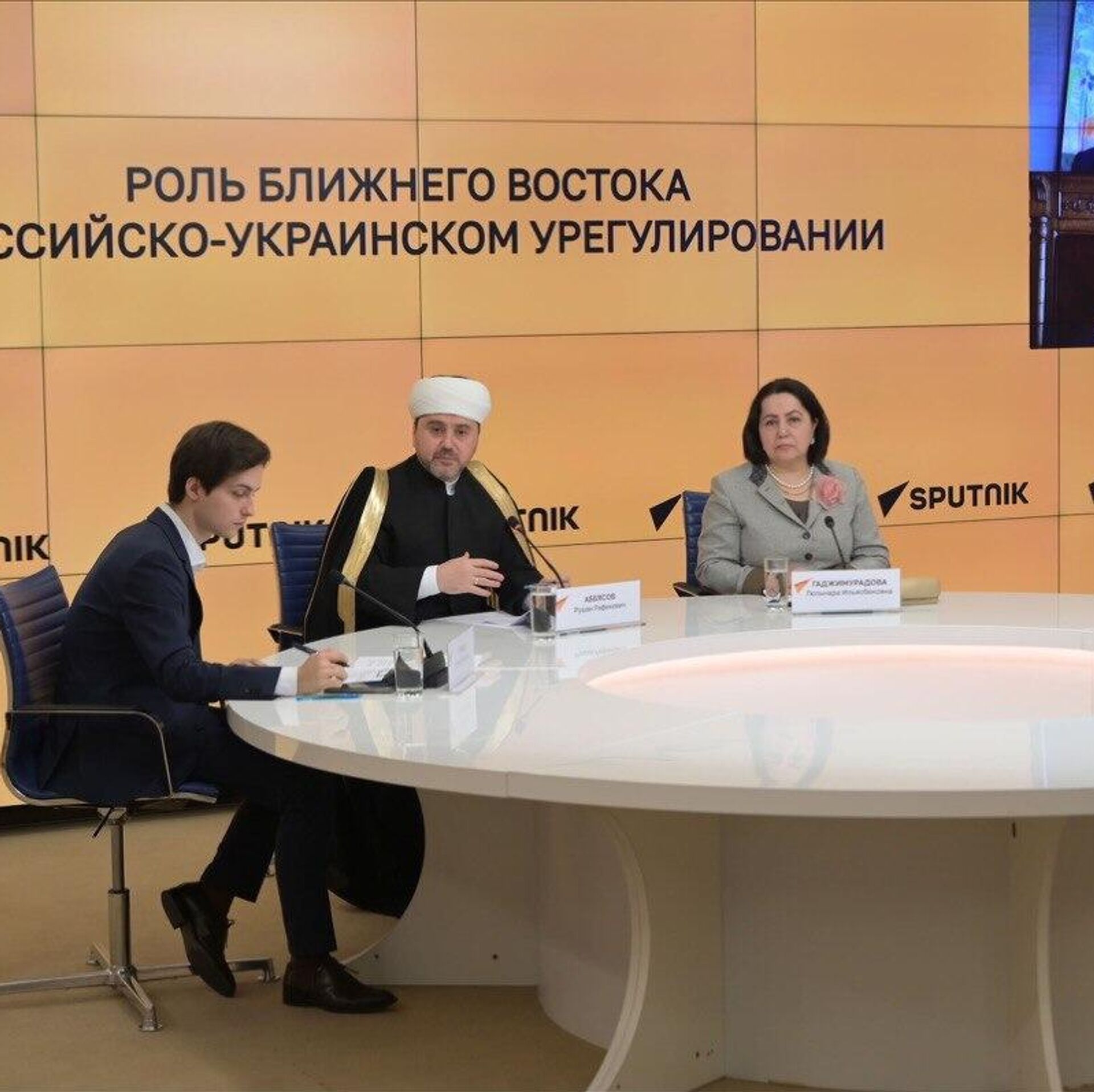 في مستهل الحديث، أكّد المفتي روشان عباسوف، نائب رئيس الإدارة الدينية لمسلمي روسيا الاتحادية، أن بلدان الشرق الأوسط كالمملكة العربية السعودية والإمارات العربية المتحدة ودولة قطر وغيرها، تلعب دوراً ذا أهمية كبيرة في الأحداث العالمية، بما في ذلك تسوية الصراع الروسي الأوكراني، وأشار في هذا الشأن قائلاً: