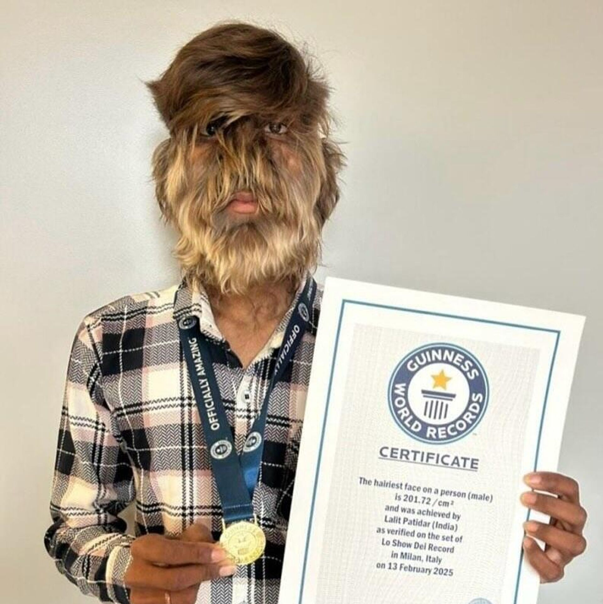 ودخل الشاب الهندي، لاليت باتيدار، سجل "غينيس" للأرقام القياسية، بسبب شعر وجهه، حيث يحمل الرقم القياسي بـ201.72 شعرة لكل سنتيمتر مربع، أي أكثر 95% من وجهه مغطى بالشعر، بسبب حالة طبية نادرة تسمى "فرط الشعر"، والتي يشار إليها غالبا باسم "متلازمة الذئب".