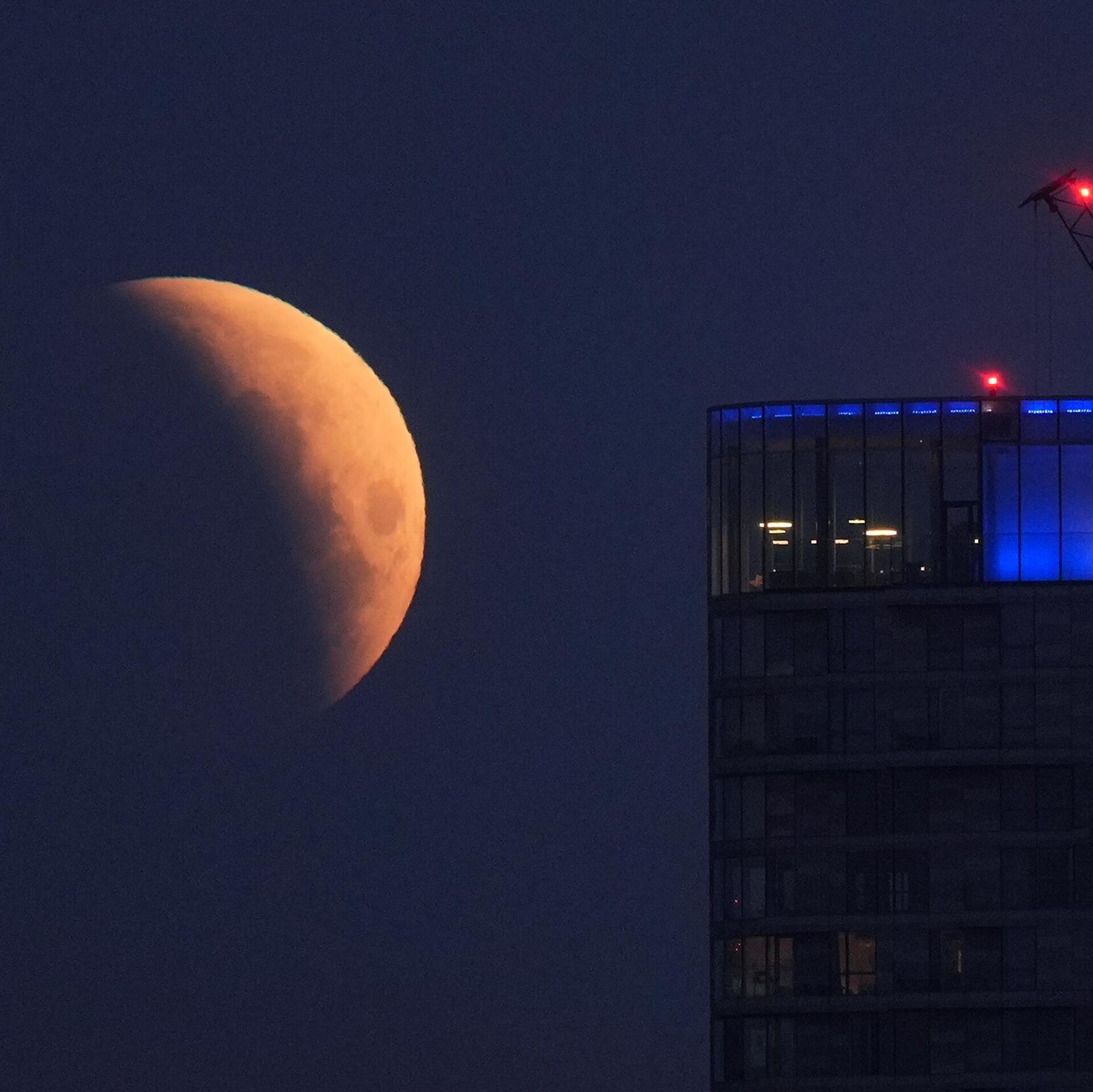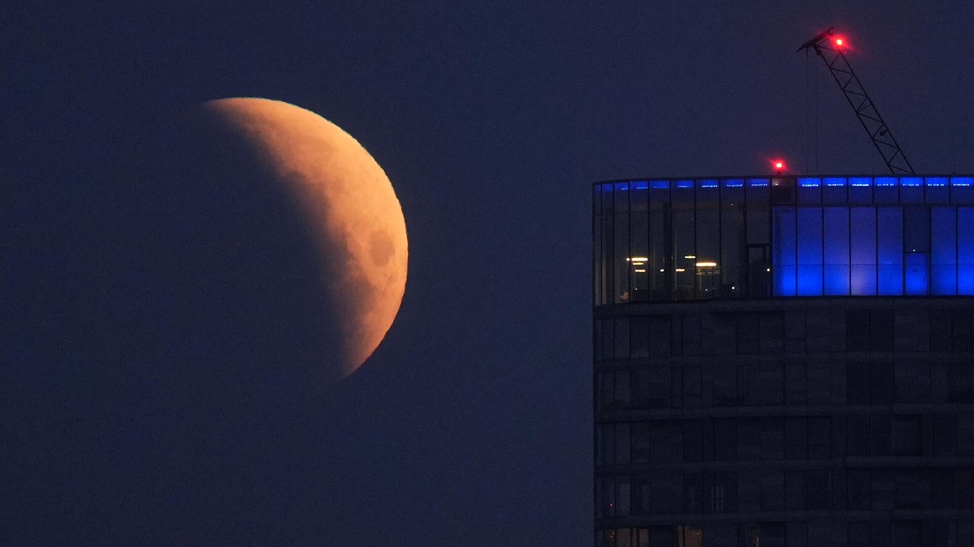 يُرى خسوفٌ للقمر فوق منطقة كناري وارف في لندن، حيث يمرّ البدر في ظل الأرض. على عكس مناطق أخرى من العالم، باستثناء بعض المناطق الغربية القصوى من المملكة المتحدة، سيكون الخسوف جزئيًا تقريبًا.