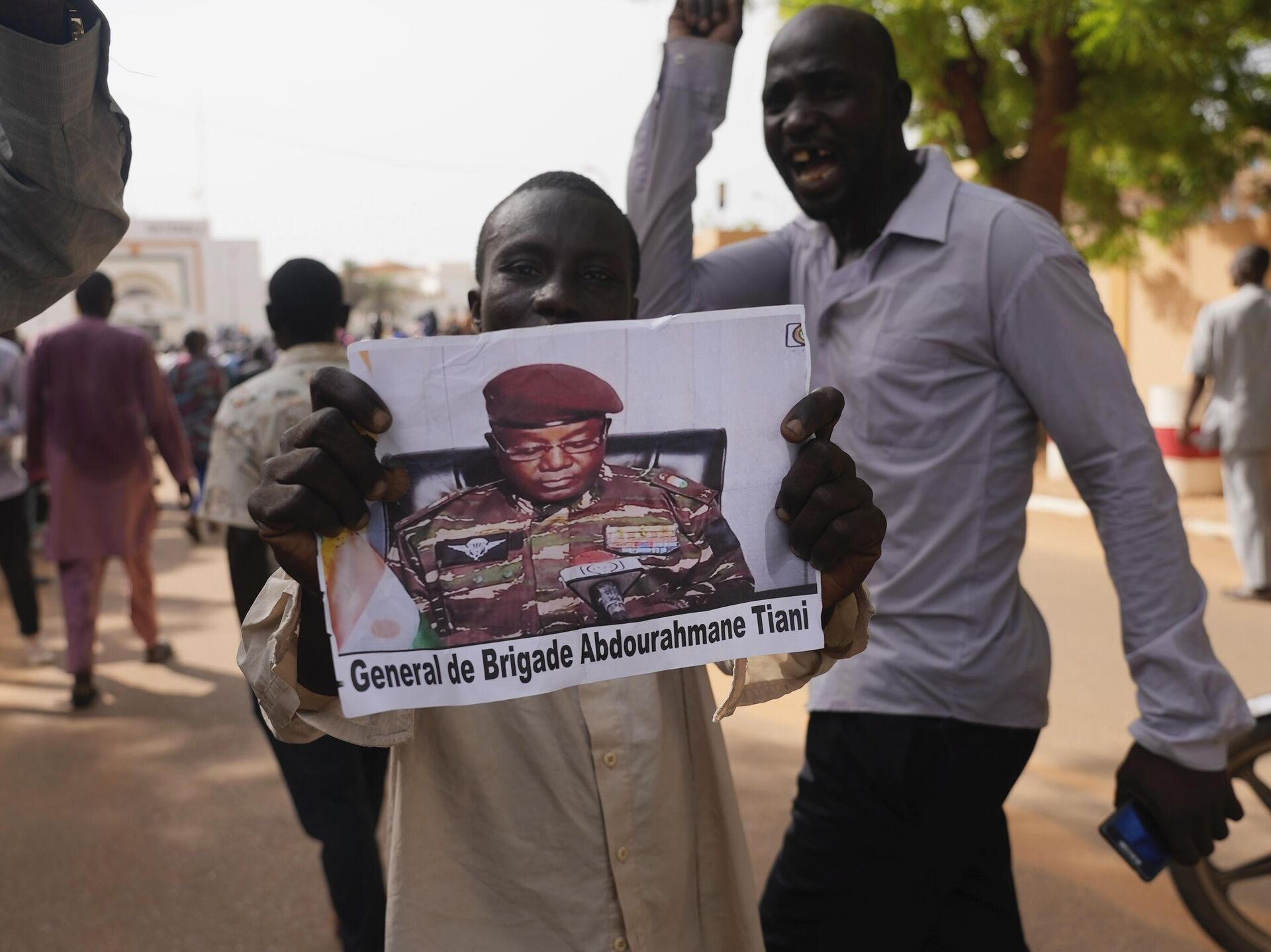 © AP Photo / Sam Mednickمواطنون يحملون صورة رئيس المجلس العسكري في النيجر عبد الرحمن تشياني