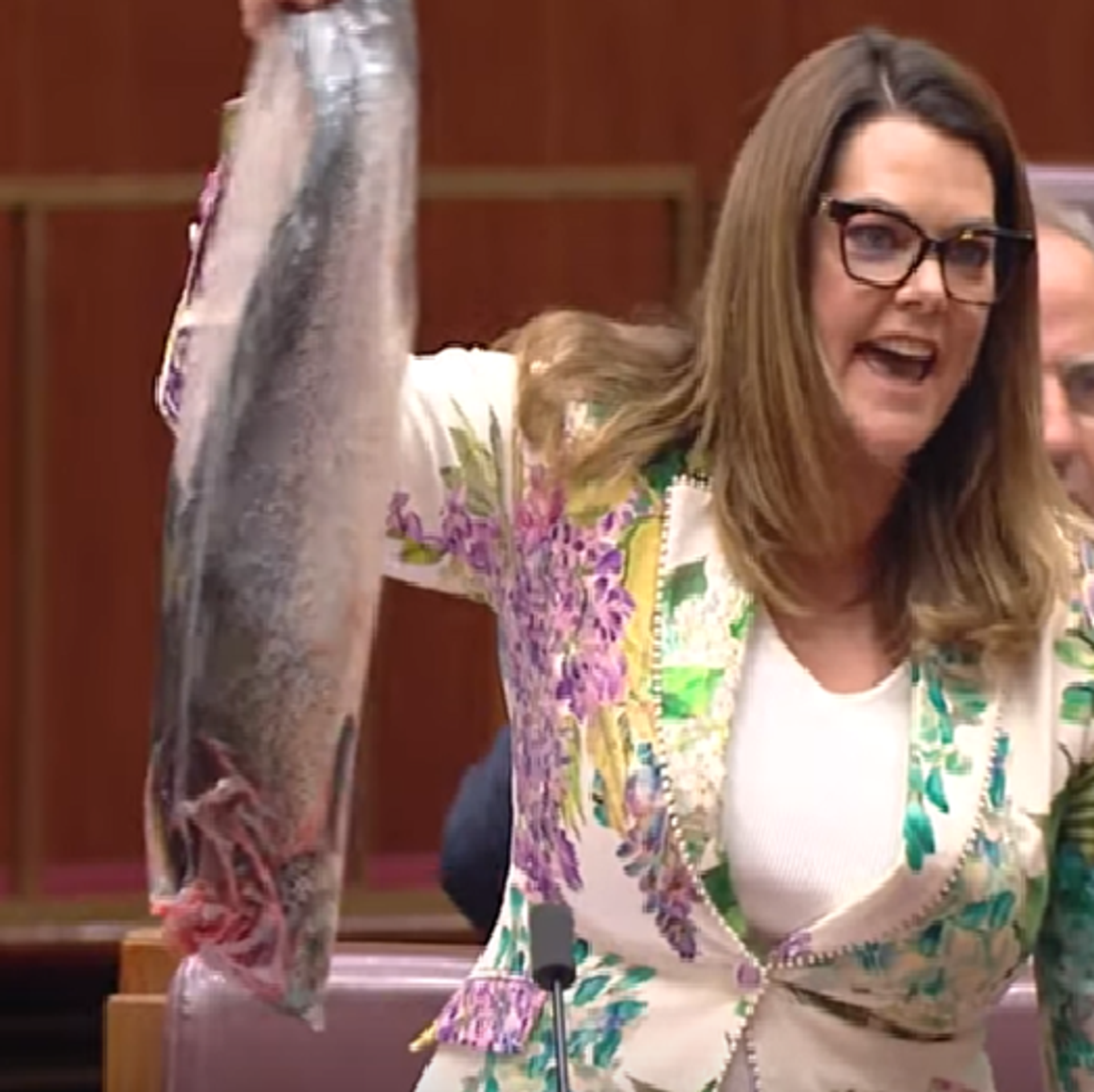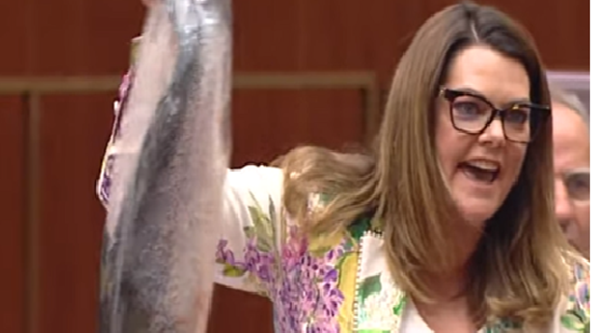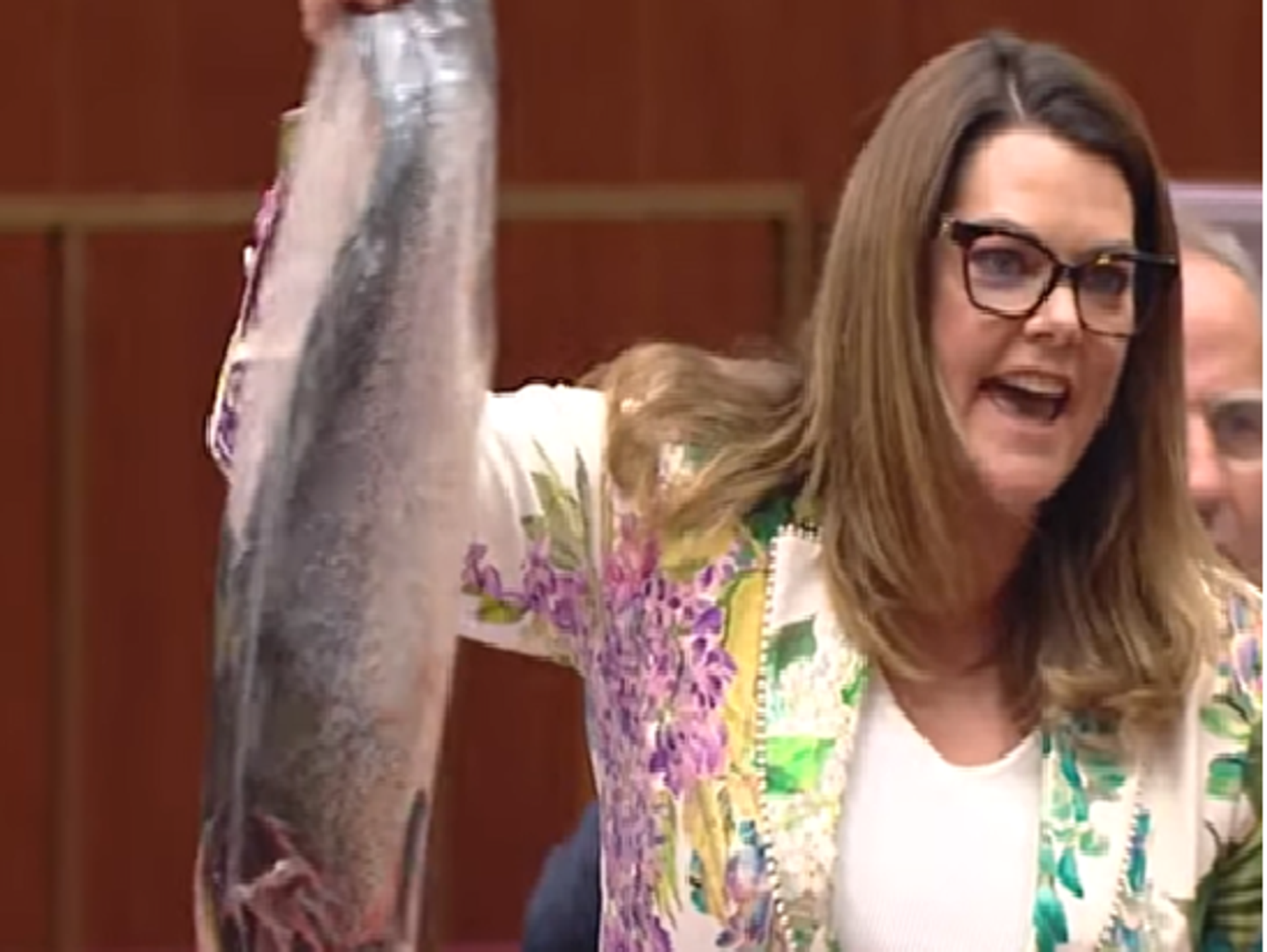 تداول رواد مواقع التواصل الاجتماعي مقطع فيديو غريبا لنائبة أسترالية وهي تلوح بسمكة سلمون نافقة وسط مجلس الشيوخ الأسترالي.