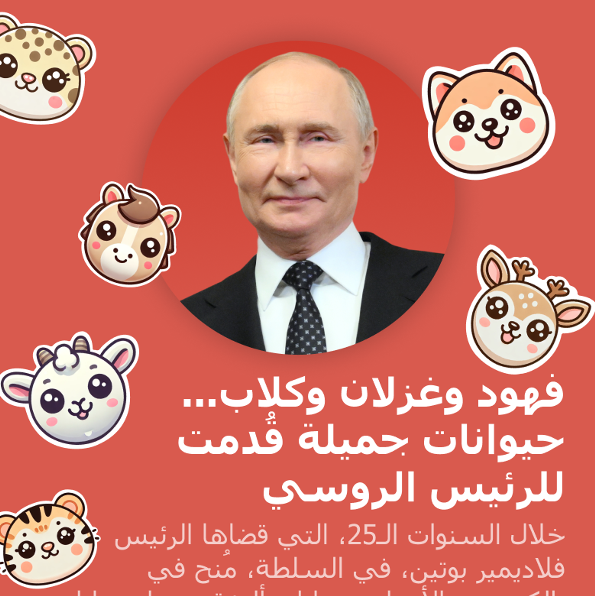 جمع فريق تحرير وكالة "سبوتنيك" قائمة بأكثر الحيوانت الجميلة والنادرة التي أهديت للرئيس الروسي فلاديمير بوتين، وذلك بمناسبة الذكرى الـ25 للفوز الأول للزعيم الروسي بالانتخابات الرئاسية الروسية، في 26 مارس/ آذار 2000.