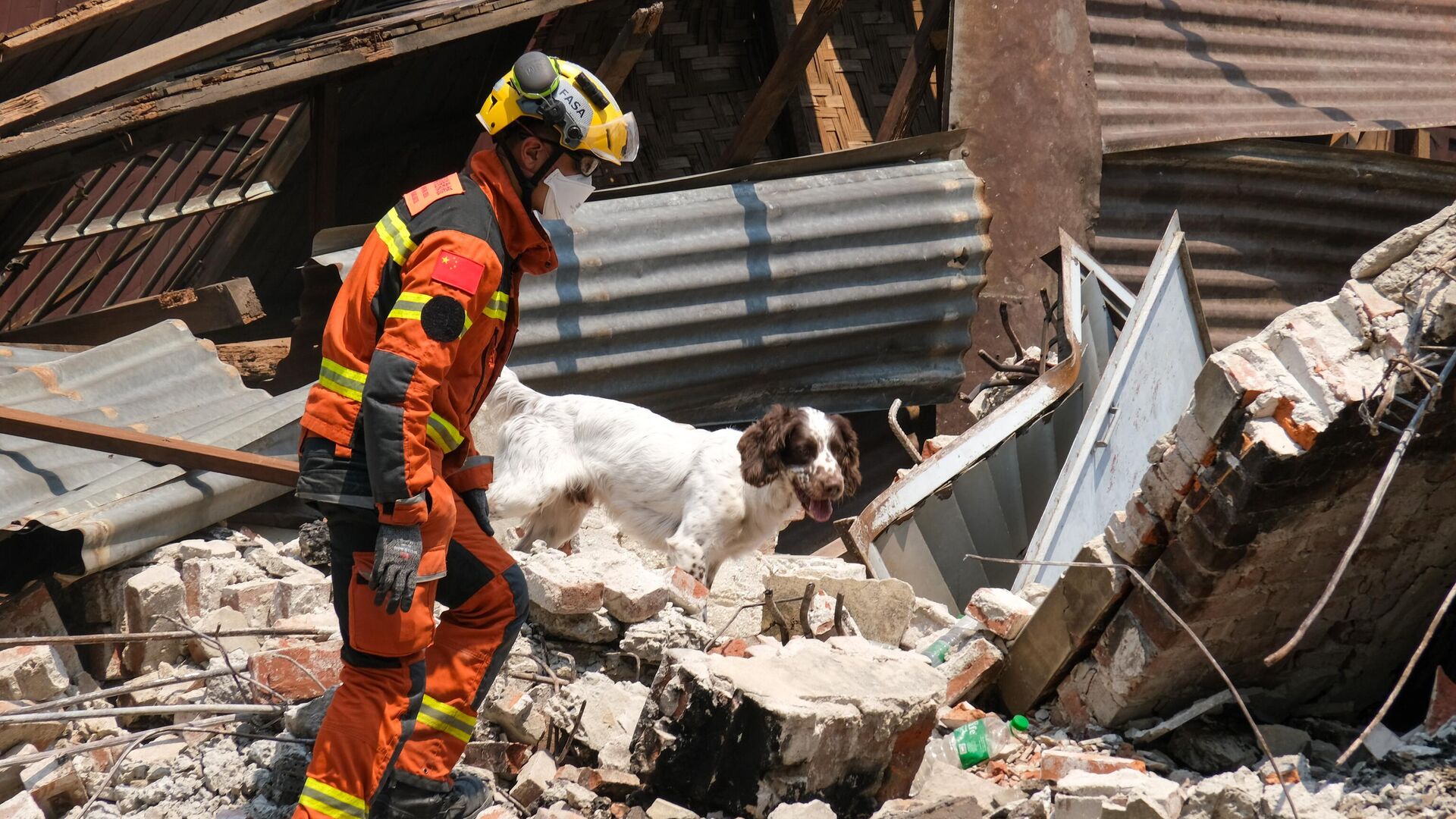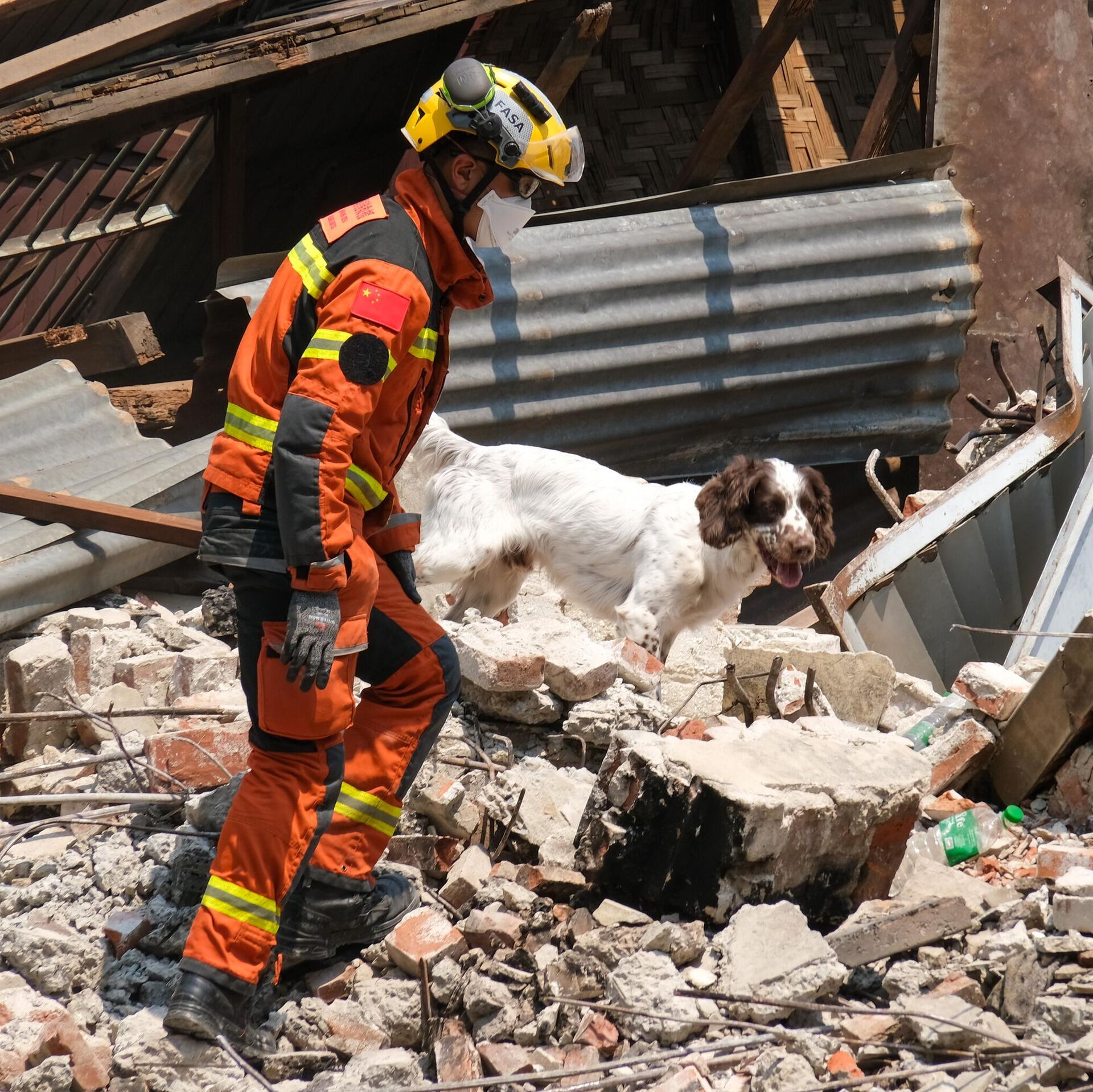 © Getty Images / VCG/China News Service/Chen Yongnuo عامل إنقاذ من هونغ كونغ مع كلب بوليسي يشارك في عملية البحث والإنقاذ بعد الزلزال الذي ضرب ماندالاي، ميانمار.