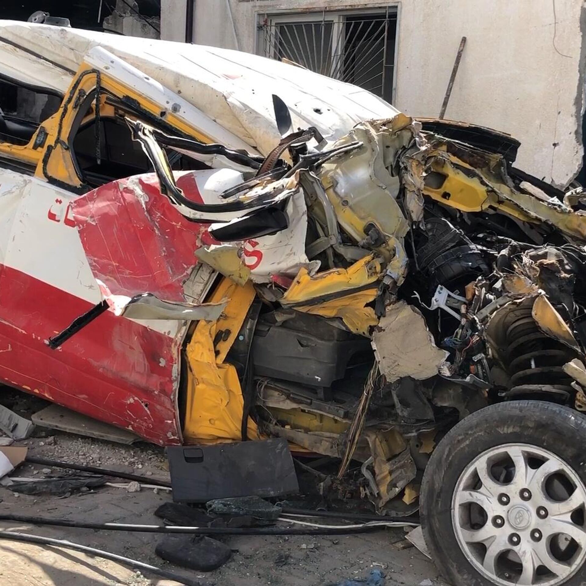 ويظهر في الصورة رجال الإنقاذ، اثنان منهم على الأقل يرتديان الزي الرسمي، يخرجون من شاحنة إطفاء وسيارة إسعاف تحمل شعار الهلال الأحمر ويقتربون من سيارة الإسعاف التي خرجت عن مسارها إلى أحد الجوانب.
