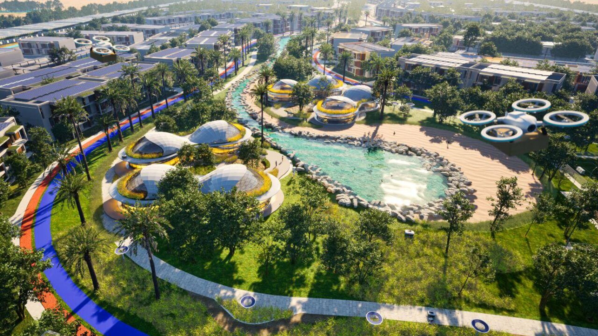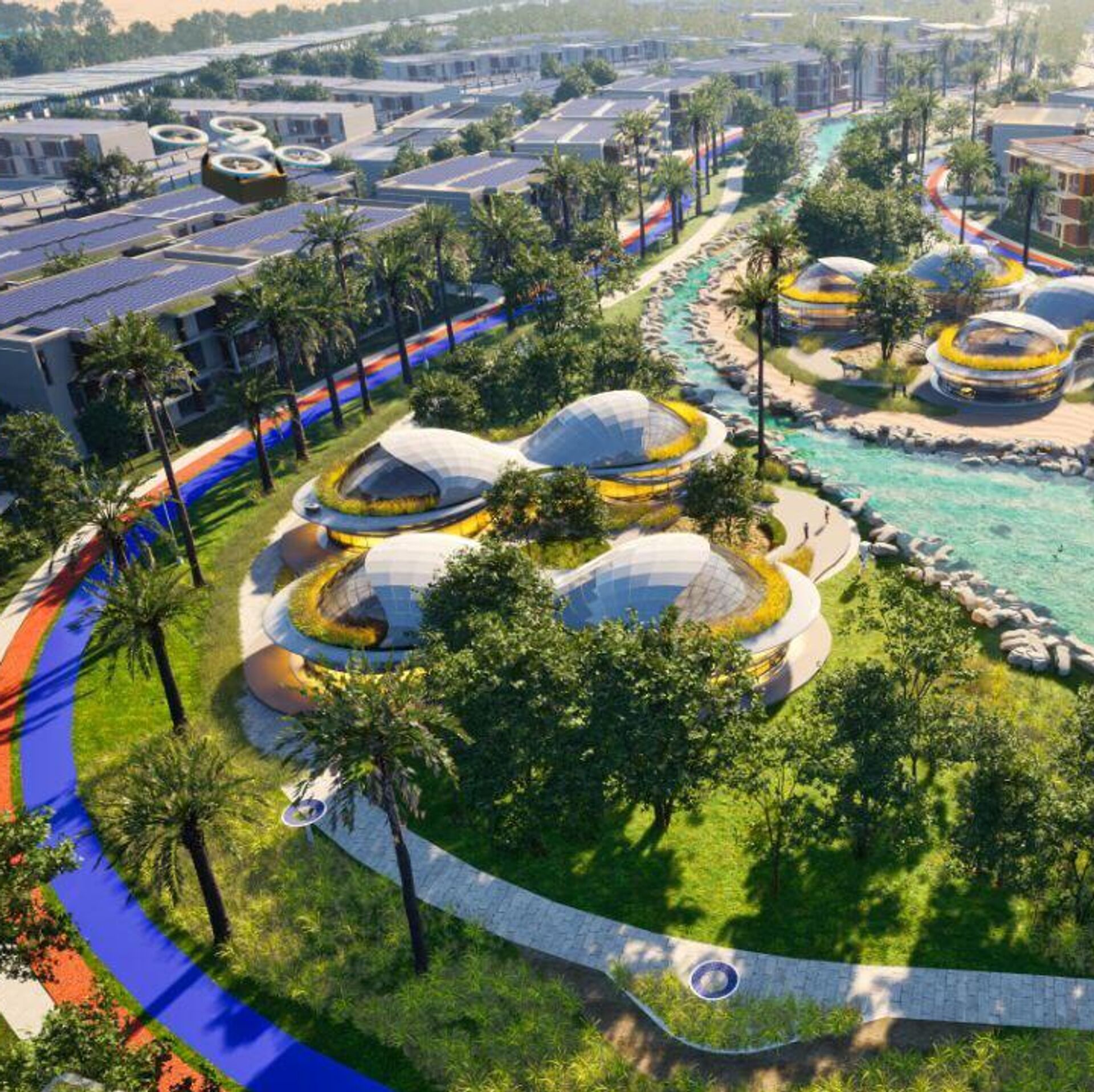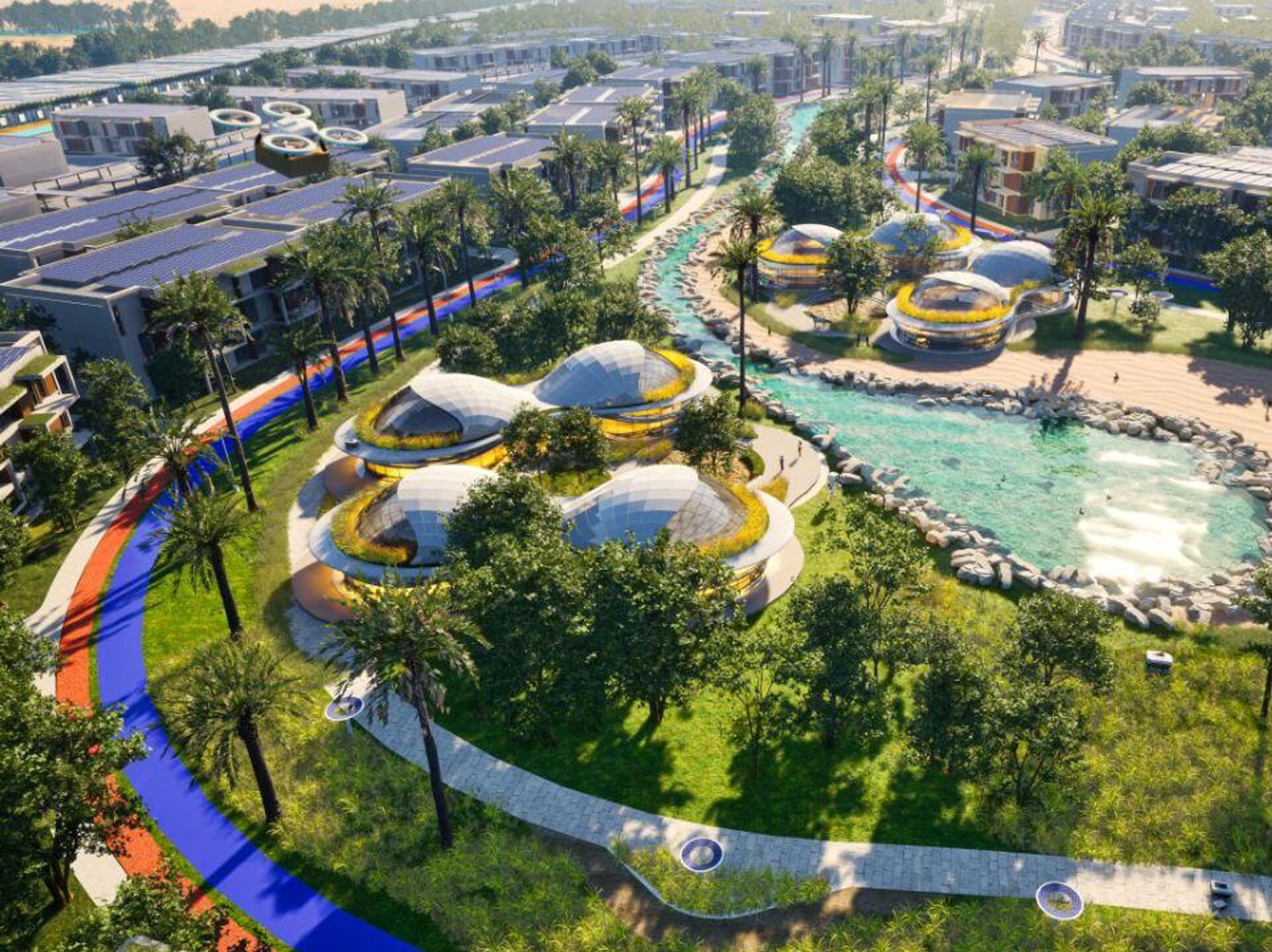 وأضافت: "ستتمتع المدينة بمناخ محلي داخلي أكثر برودة بفضل استخدامها عناصر التصميم الذكي المدعوم بتوربينات رياح تساهم في تدفق الهواء البارد ضمن المساحات العامة. وسيكون التنقل كهربائياً بالكامل وذاتي القيادة، ويضم سيارات ودراجات كهربائية مشتركة وحافلات ذاتية القيادة، وسيجهّز كل منزل بتقنيات متطورة لتوصيل الطلبات بسلاسة من خلال روبوتات تنجز المهمة بالكامل من دون تدخل بشري وعبر منصات هبوط للطائرات المسيرة (درونز)".
