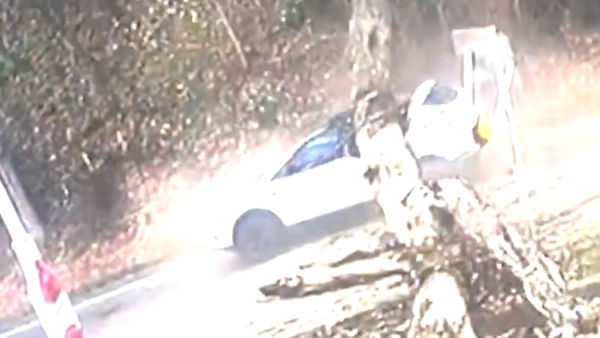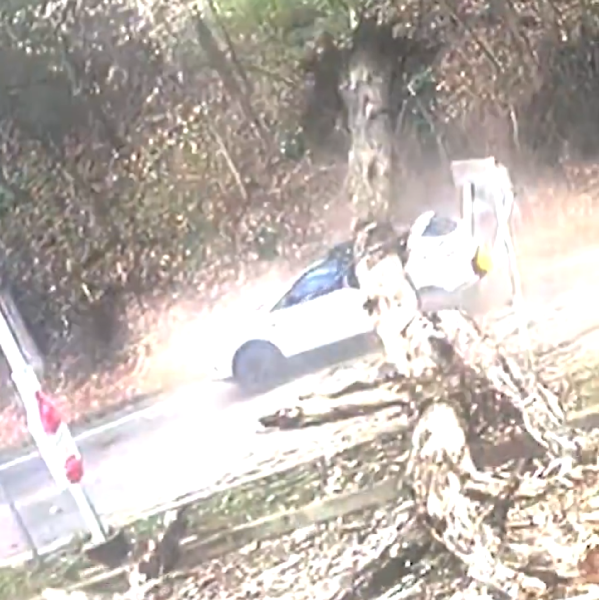ويُظهر مقطع الفيديو لحظة سقوط الشجرة وتحطيمها لسيارة دفع رباعي بيضاء كانت متوقفة خلف سيارة أخرى، وخروج المرأة من السيارة دون إصابات واضحة.
