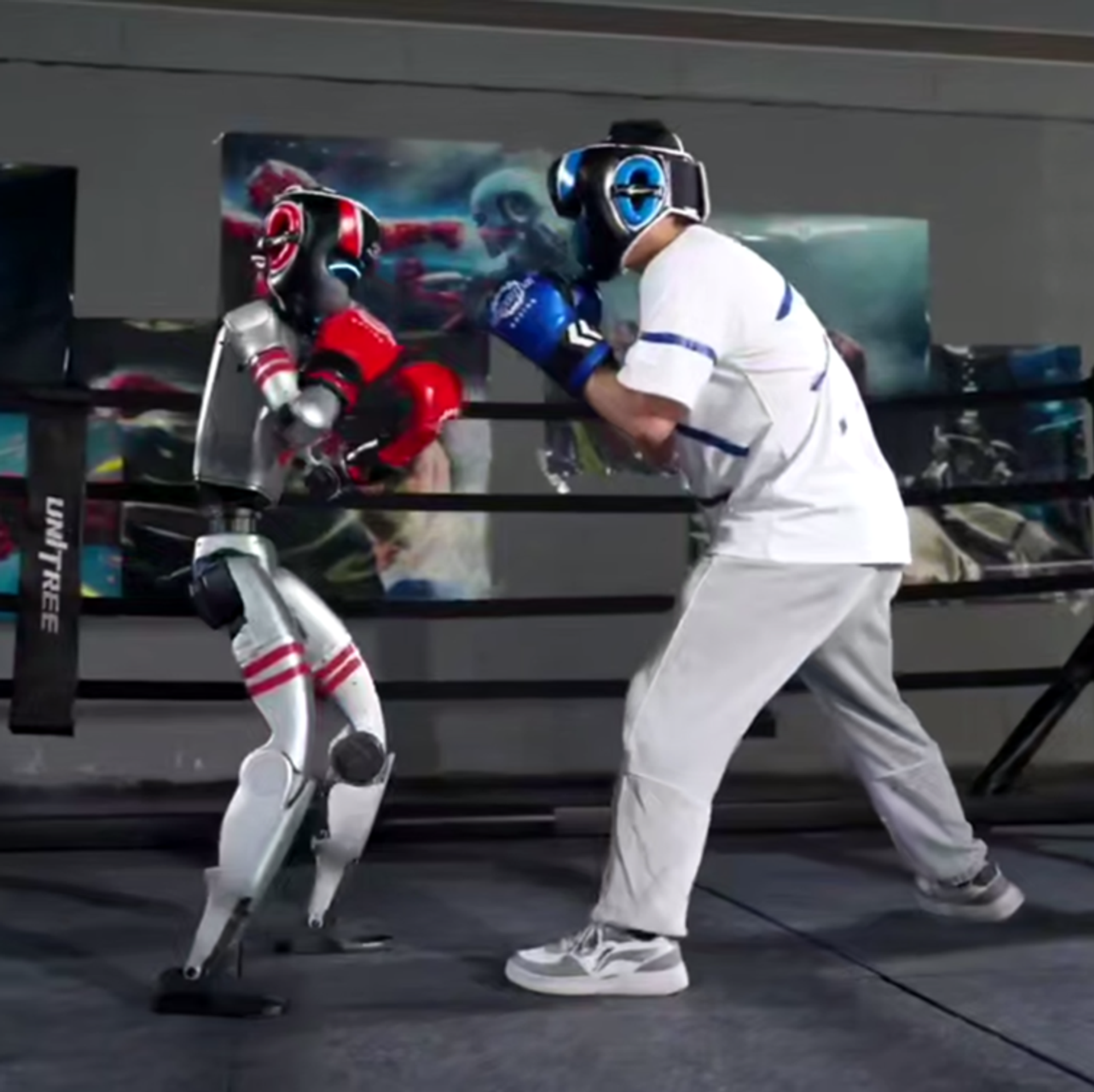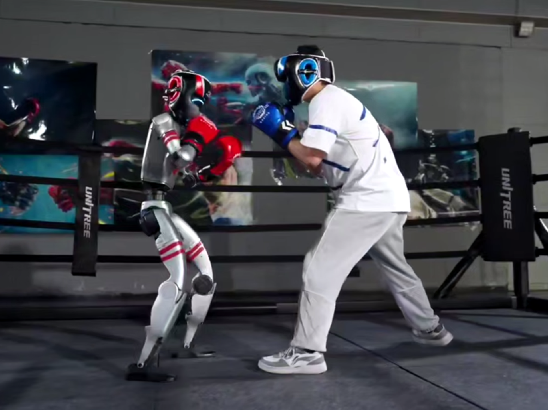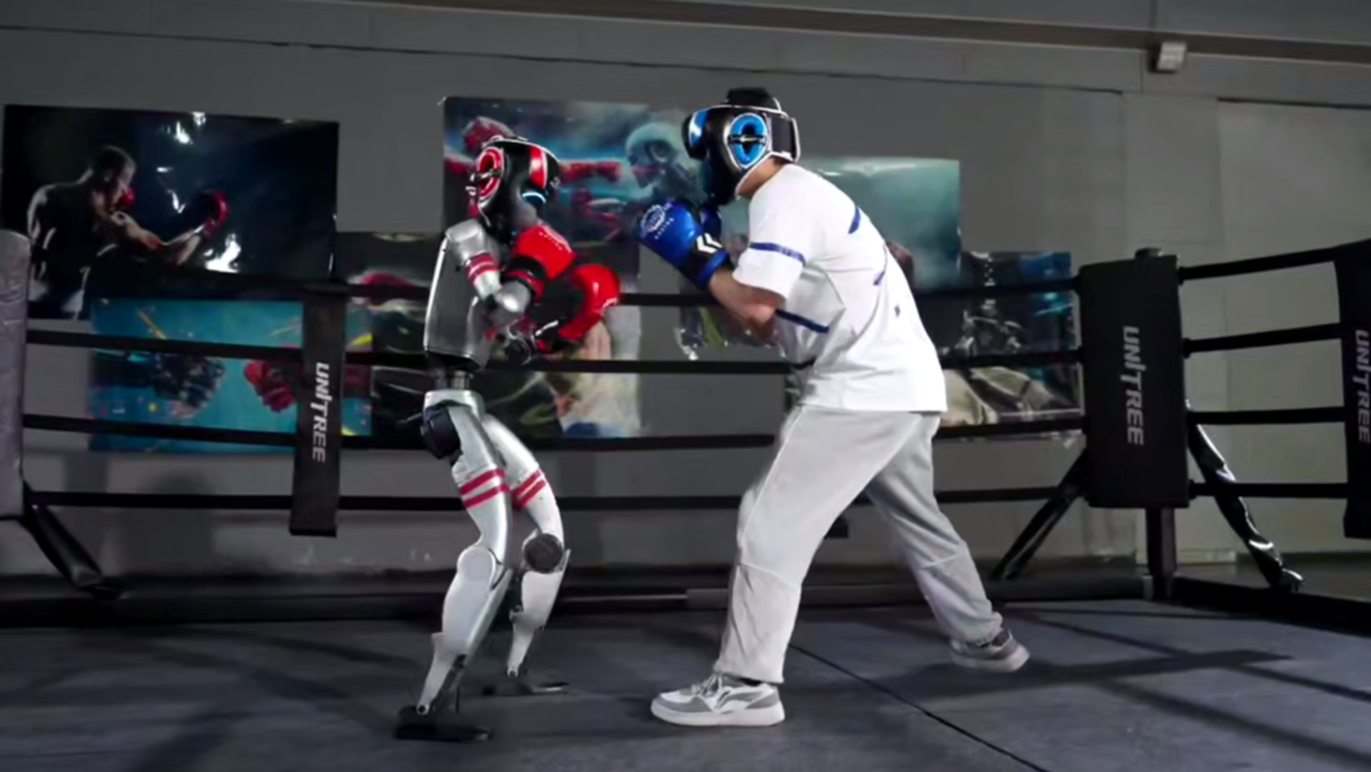 ويظهر الفيديو الذي تداوله رواد مواقع التواصل الاجتماعي مباراة قتالية بين روبوت وملاكم محترف، حيث قامت شركة "يونيتري روبوتيكس" الصينية بنشر فيديو لمباراة تدريبية بين روبوتها "جي 1" وملاكم بشري، بالإضافة إلى مباراة أخرى جمعت بين روبوتين.