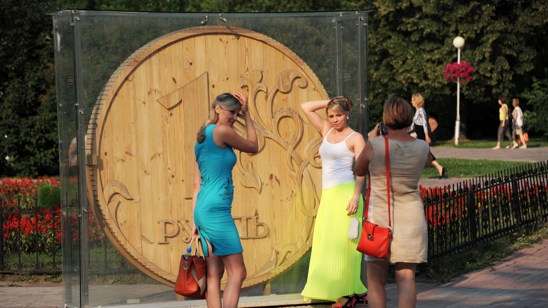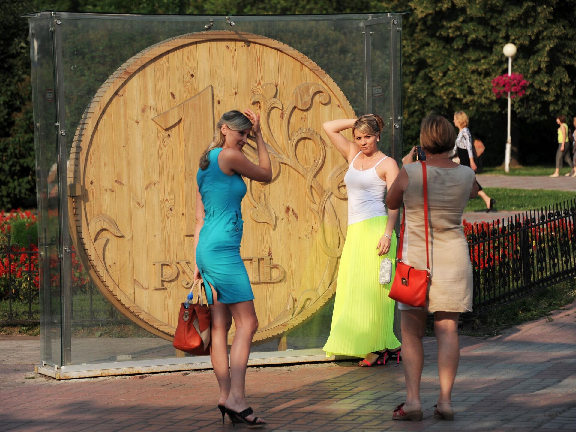 مواطنون روس يقفون عند النصب الخشبي للروبل في ساحة نوفوسوبورنايا في مدينة تومسك. - سبوتنيك عربي