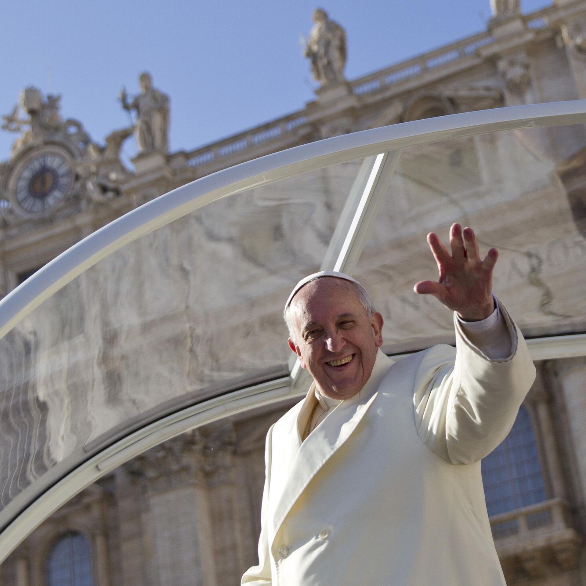 البابا فرنسيس يلوح بيده من سيارته البابوية في ساحة القديس بطرس، في الفاتيكان.